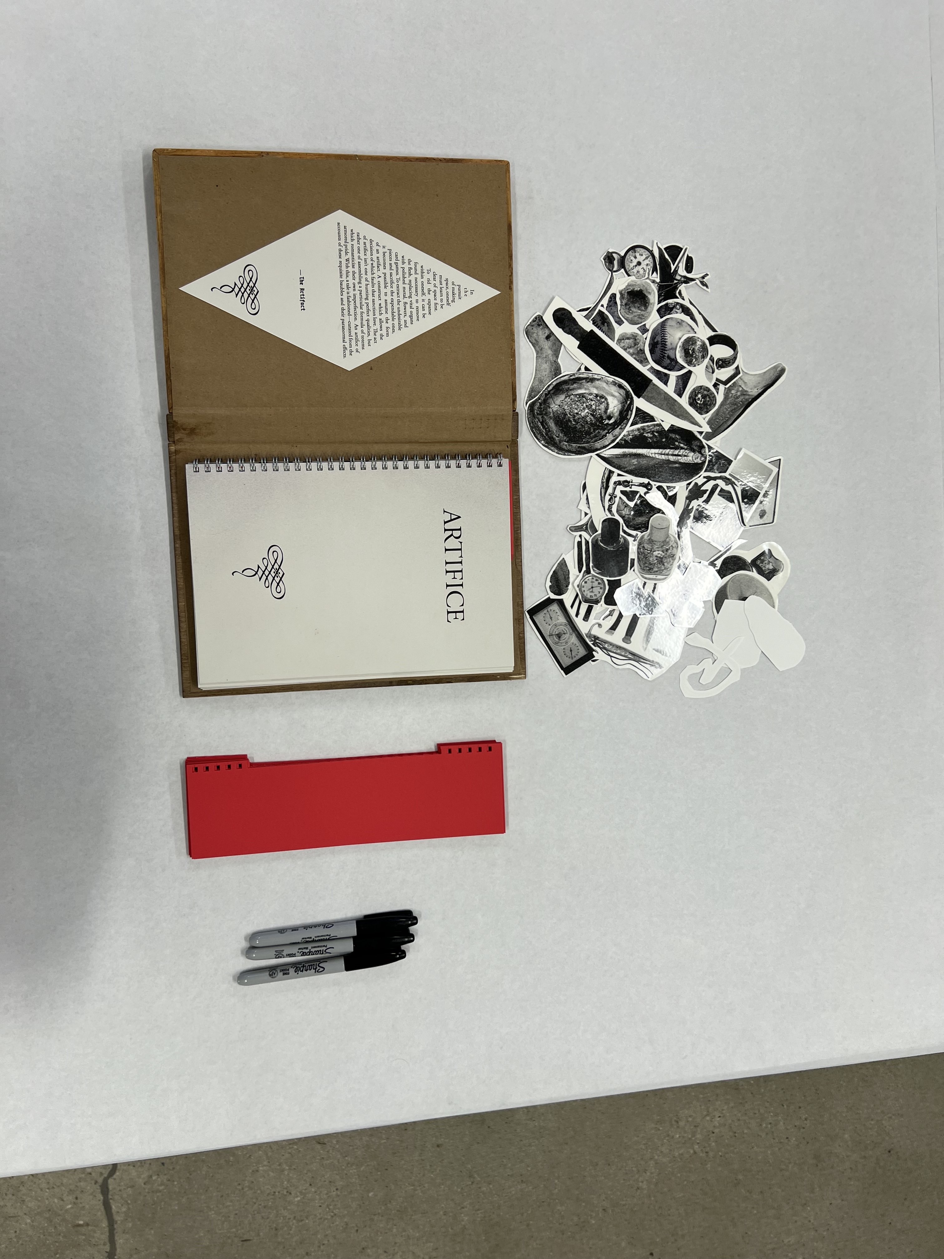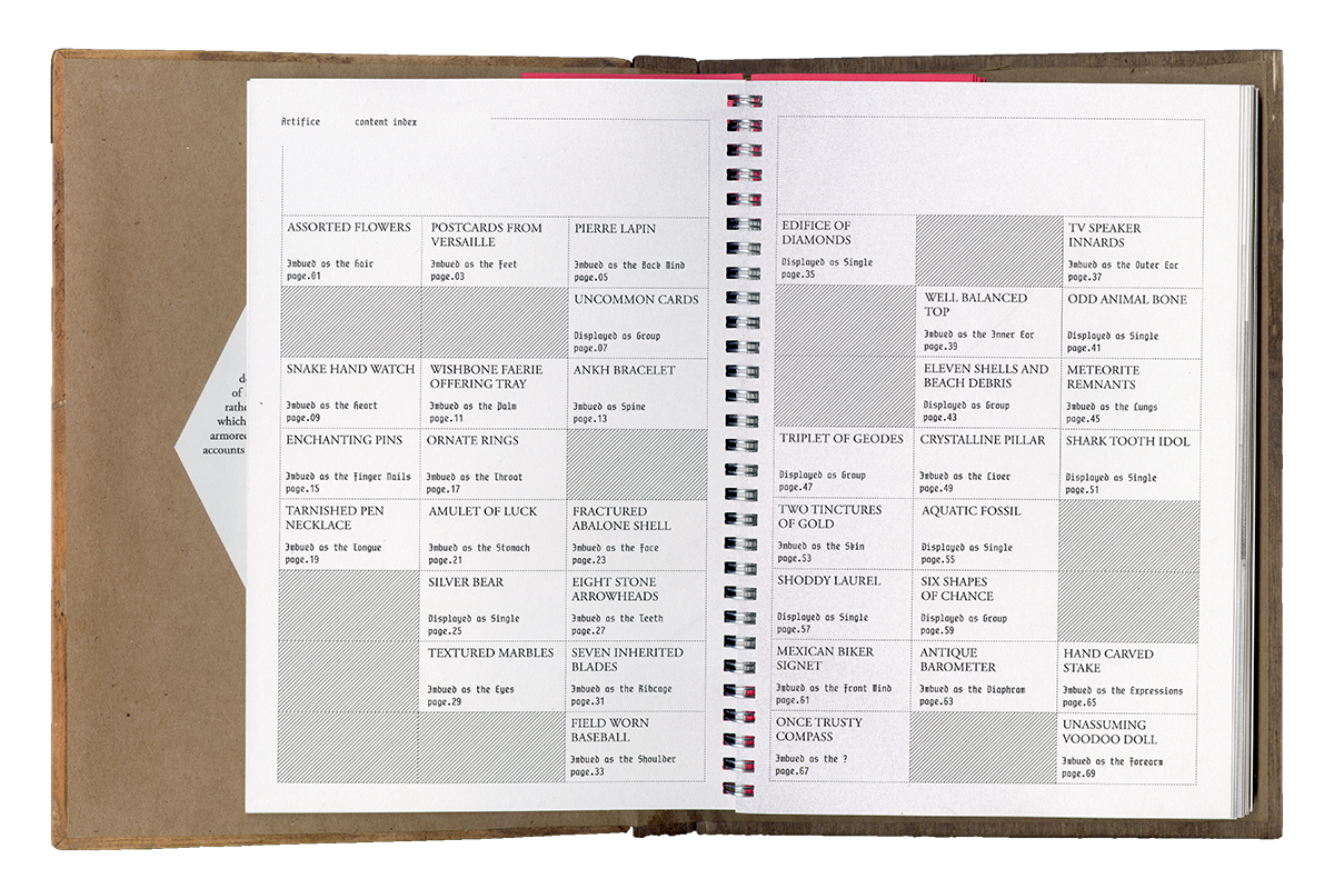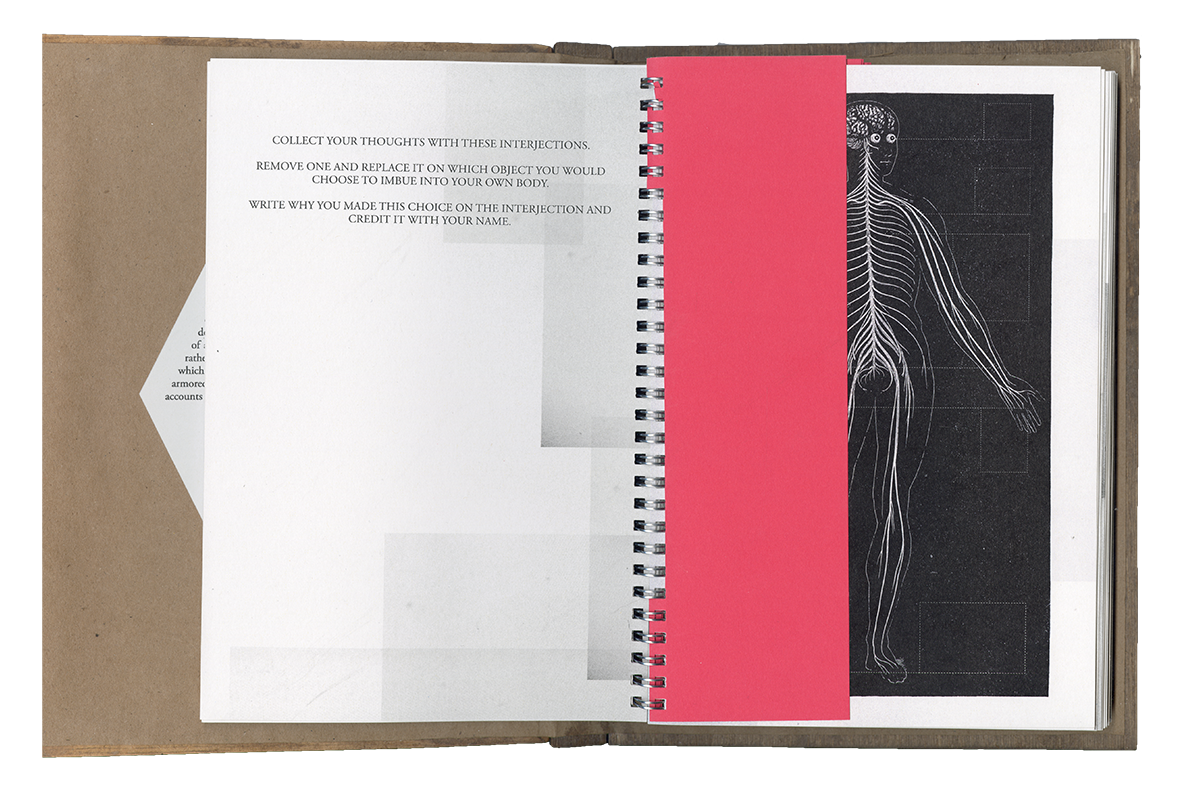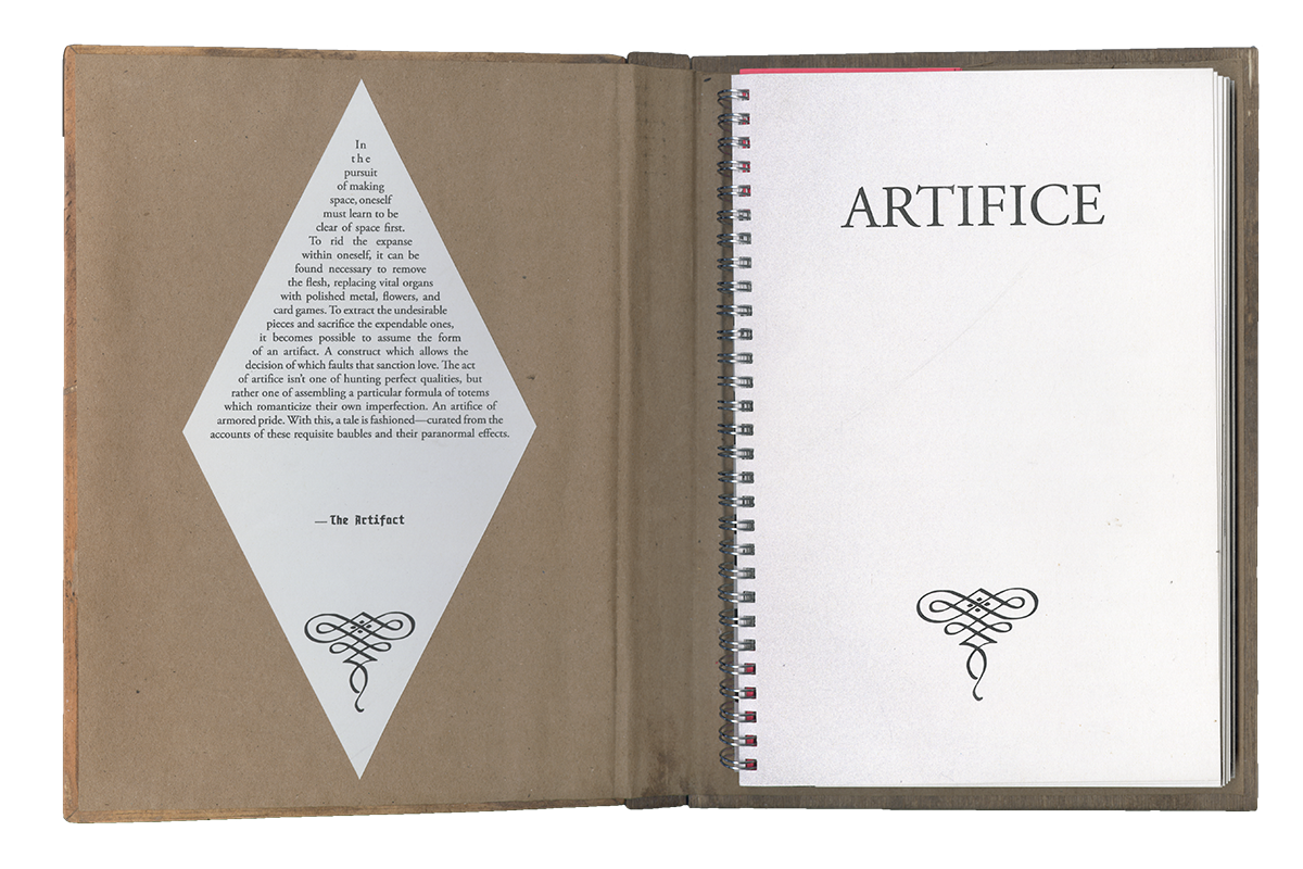 This project was completed in Info Design and Comics & Zines with Allison Dalton. The book design uses a handmade wooden cover, Neenah paper, silver o-ring binding, and red hand cut insert cards. All of the content in the book is made by me to form a narrative about items which can be grafted to gain power. This book used an interactive component in that while you read, you pick a favorite item, write why on the red card, insert it into the binding, then receive a temporary tattoo of the item.