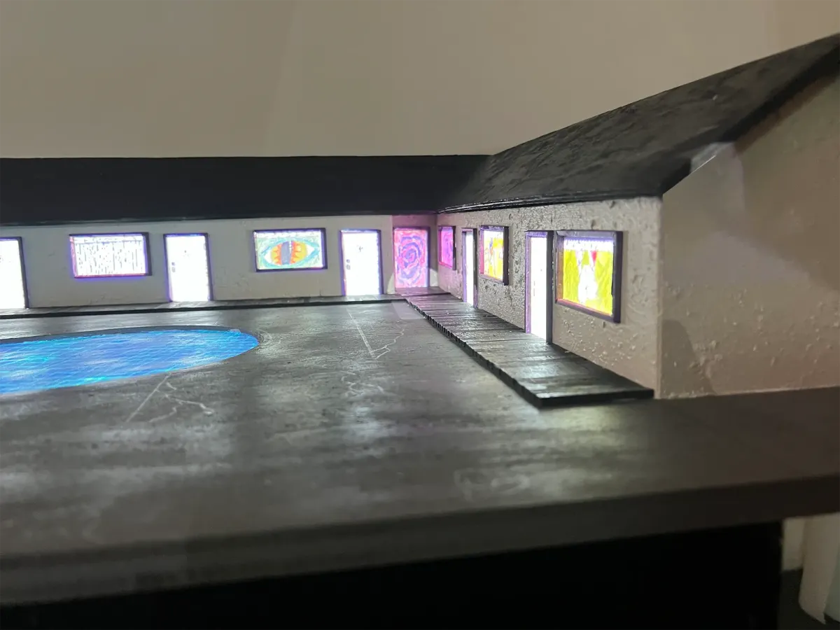 Graduates Select DepartmentBrand Design & StrategyCreative DirectionEntertainment DesignFilmFine ArtFurniture, Lighting and FixturesGraduate ArtGraduate FilmGraduate Graphic DesignGraduate Interaction DesignGraduate Spatial Experience DesignGraphic DesignIllustrationIndustrial DesignInteraction DesignMedia Design PracticesPhotography and ImagingProduct DesignSpatial Experience DesignTransportation DesignTransportation Systems and Design Back to Projects Nathan Turley BFA in Graphic Design — Graphic Design Course: GTRA-352 Mediatecture Faculty: Miles Mazzie The Midnight Motel [Projection+Spacial] The Midnight Motel is a sculpture made with the intent of provoking curiosity and delight. In this scene there is a motel in which the monsters of the world have gone to for a much needed vacation. Image Image Image Image