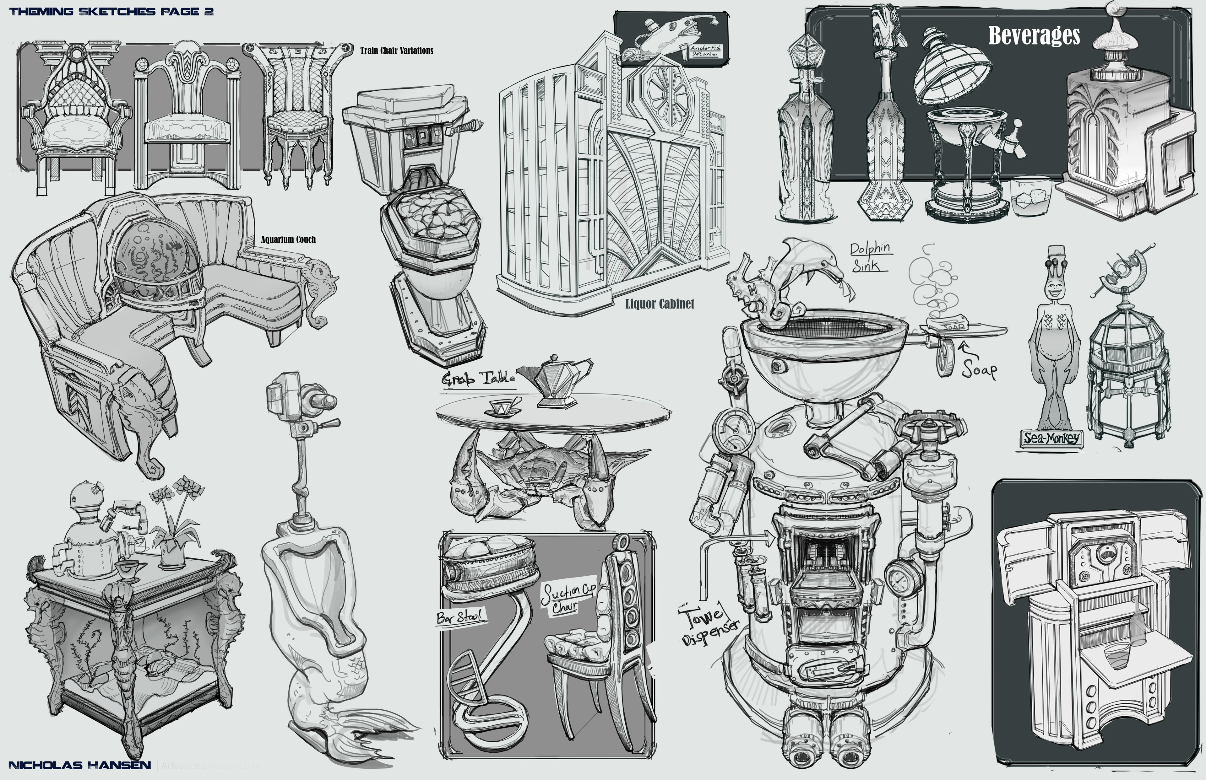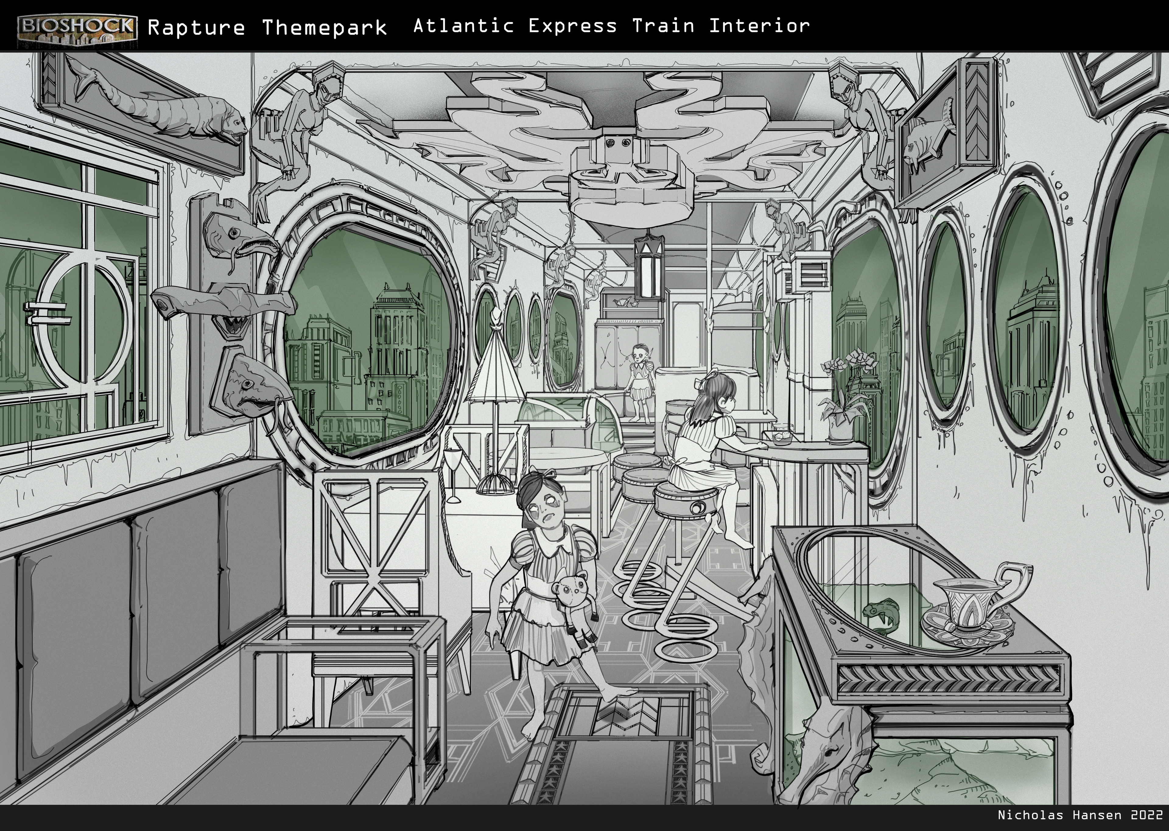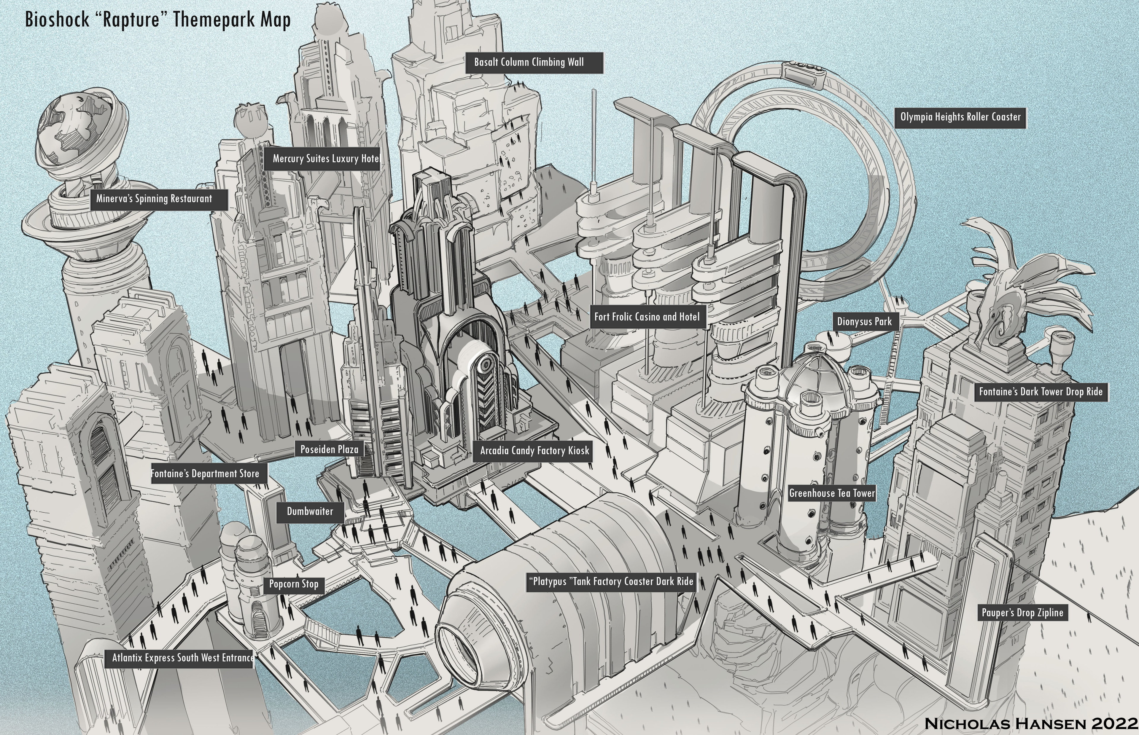 Graduates Select DepartmentBrand Design & StrategyCreative DirectionEntertainment DesignFilmFine ArtFurniture, Lighting and FixturesGraduate ArtGraduate FilmGraduate Graphic DesignGraduate Interaction DesignGraduate Spatial Experience DesignGraphic DesignIllustrationIndustrial DesignInteraction DesignMedia Design PracticesPhotography and ImagingProduct DesignSpatial Experience DesignTransportation DesignTransportation Systems and Design Back to Projects Nicholas Hansen BS in Entertainment Design - Concept — Entertainment Design Bioshock Themepark Design Design sketches and drawings for a Bioshock themepark Image Image Image Image Image Image Image