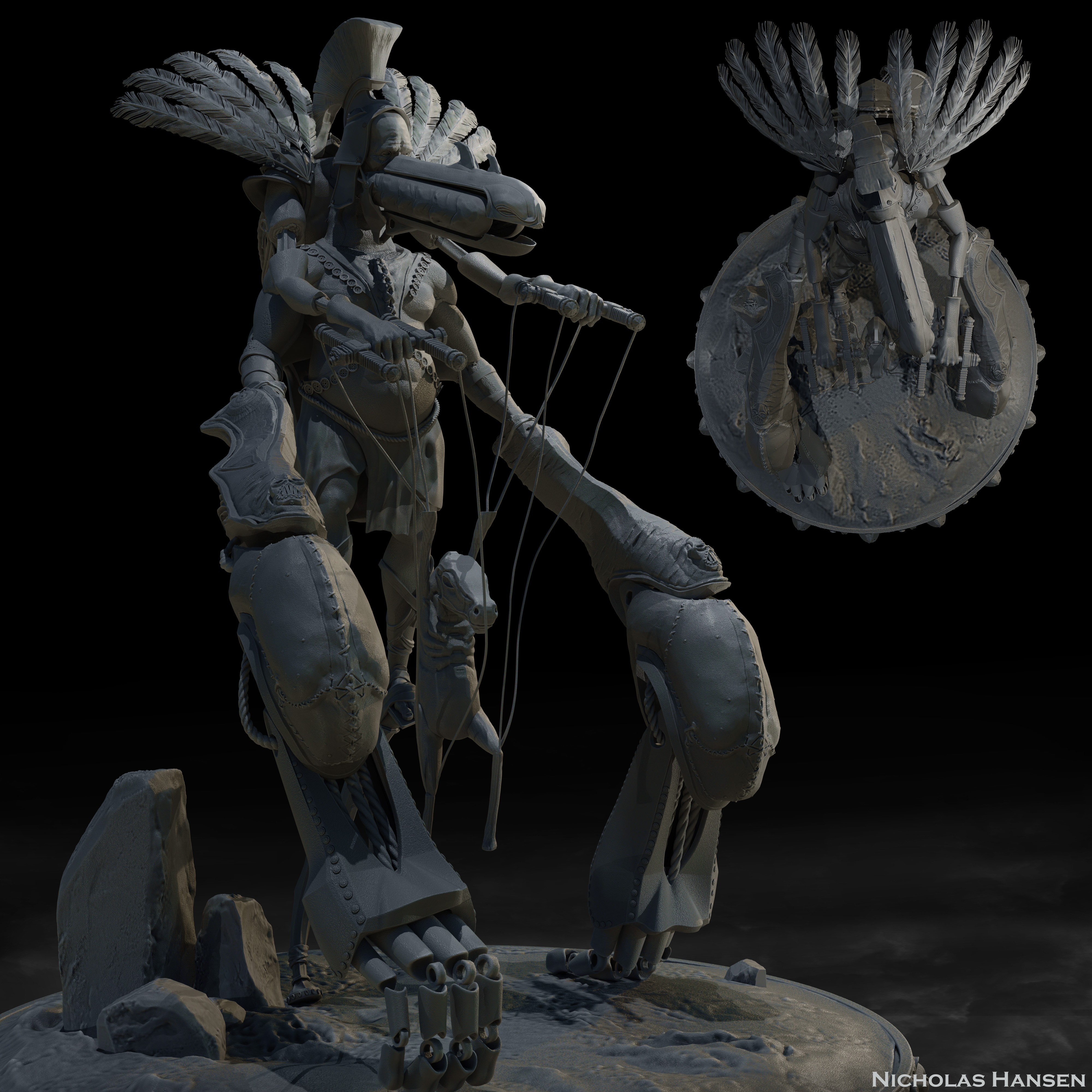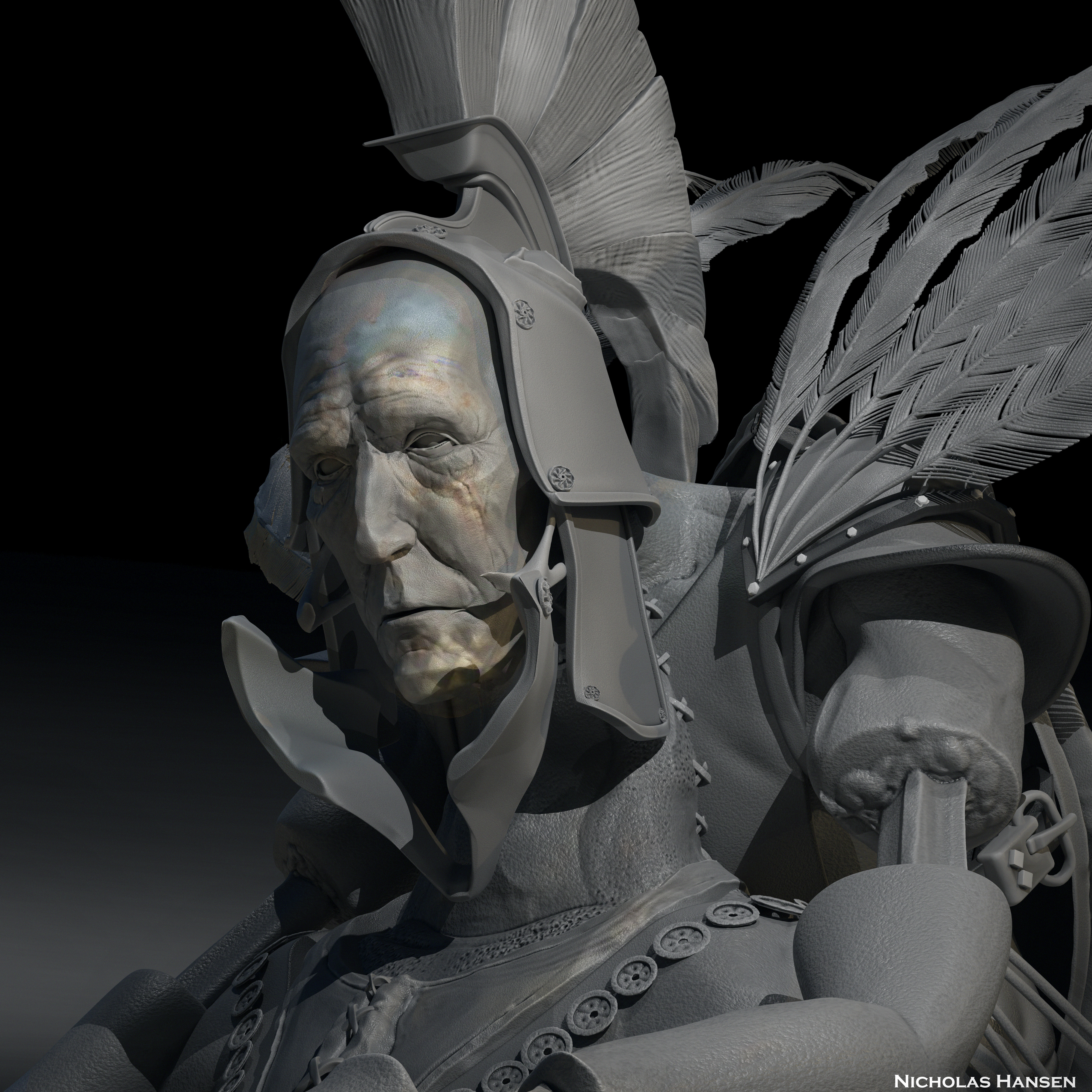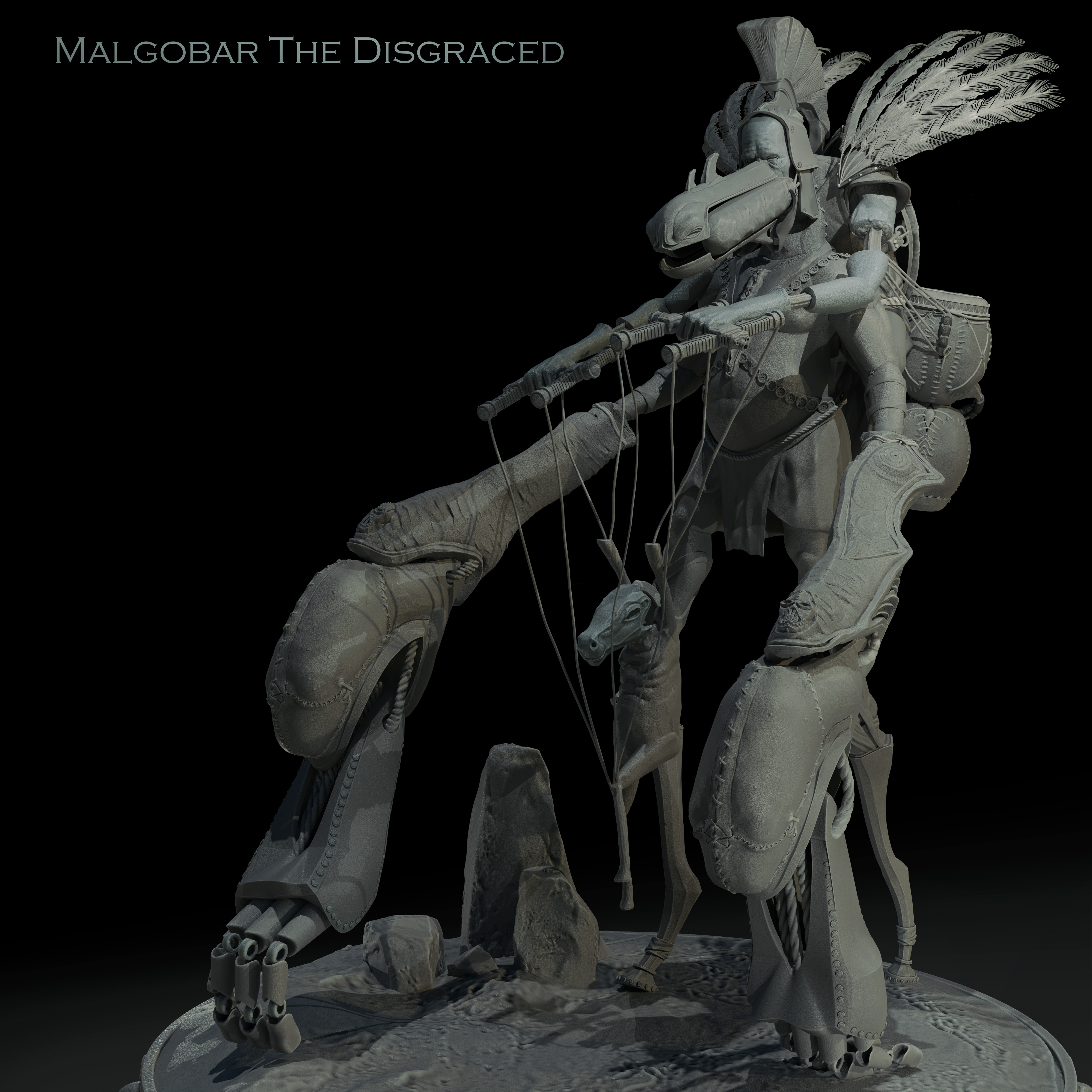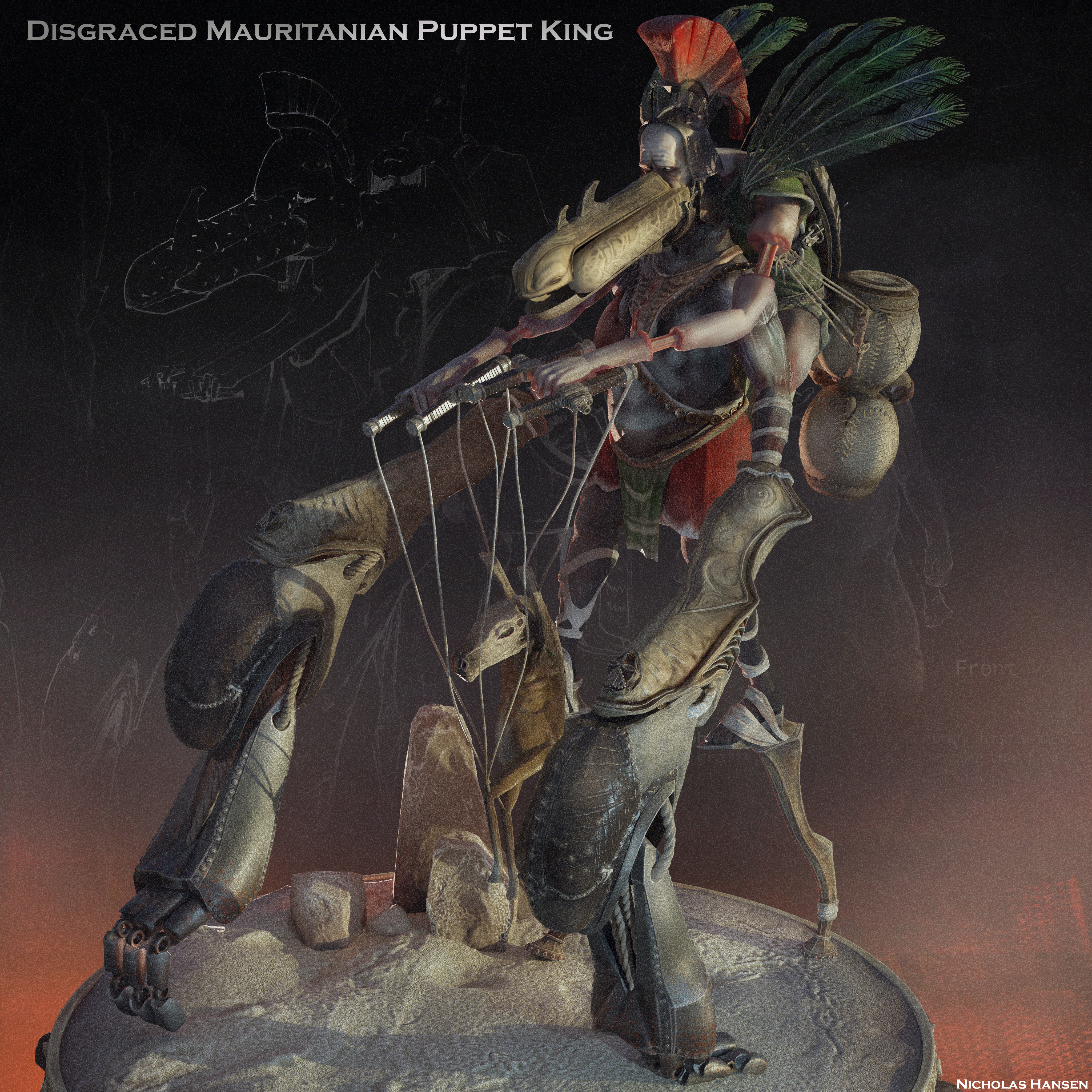 Malgobar the Disgraced Mauritanian Puppet King Sculpted in Zbrush, Colored with Zbrush PolyPaint, Rendered in Blender Cycles. By Nicholas Hansen, 2023.