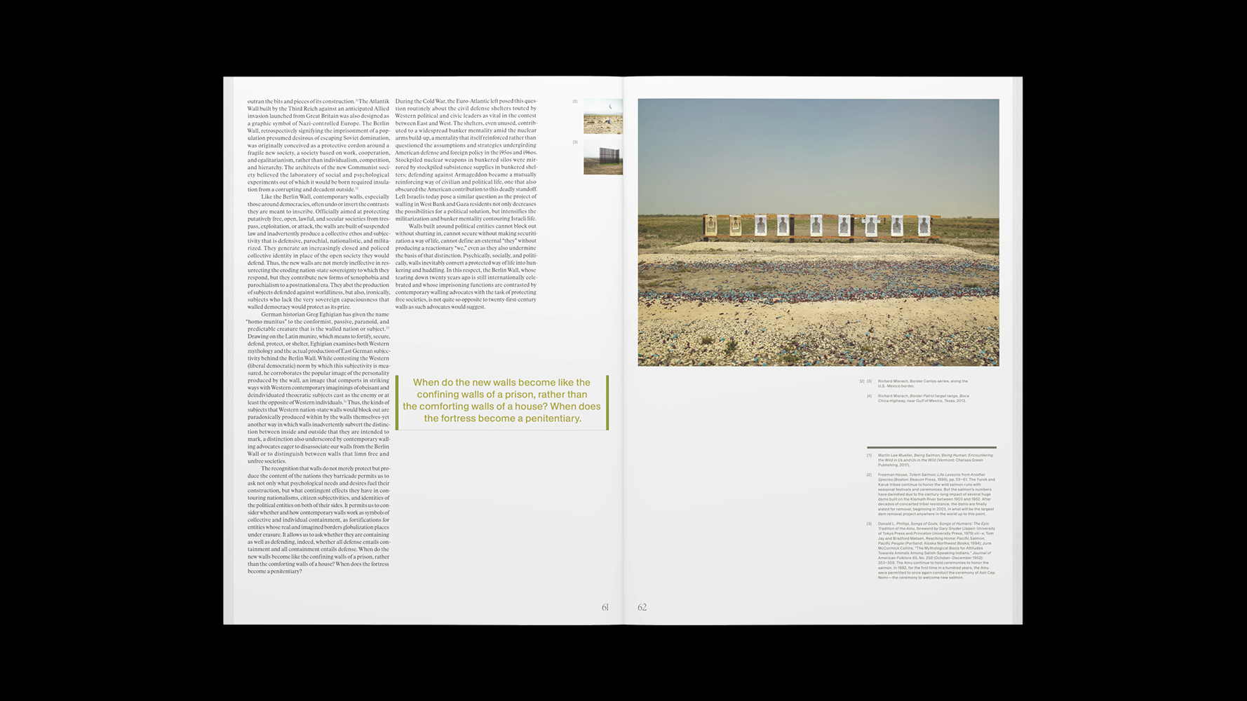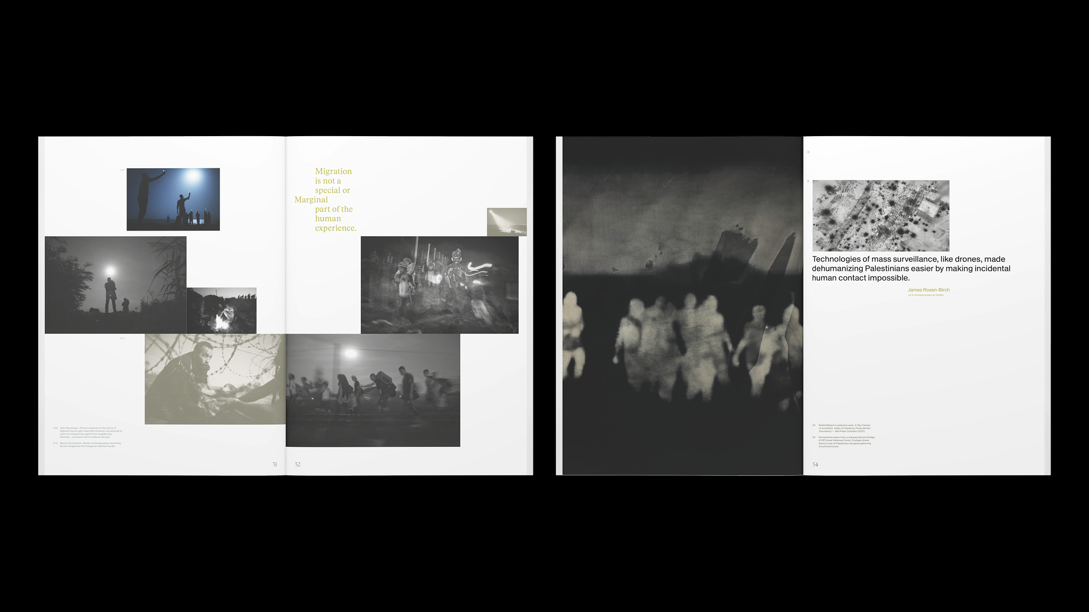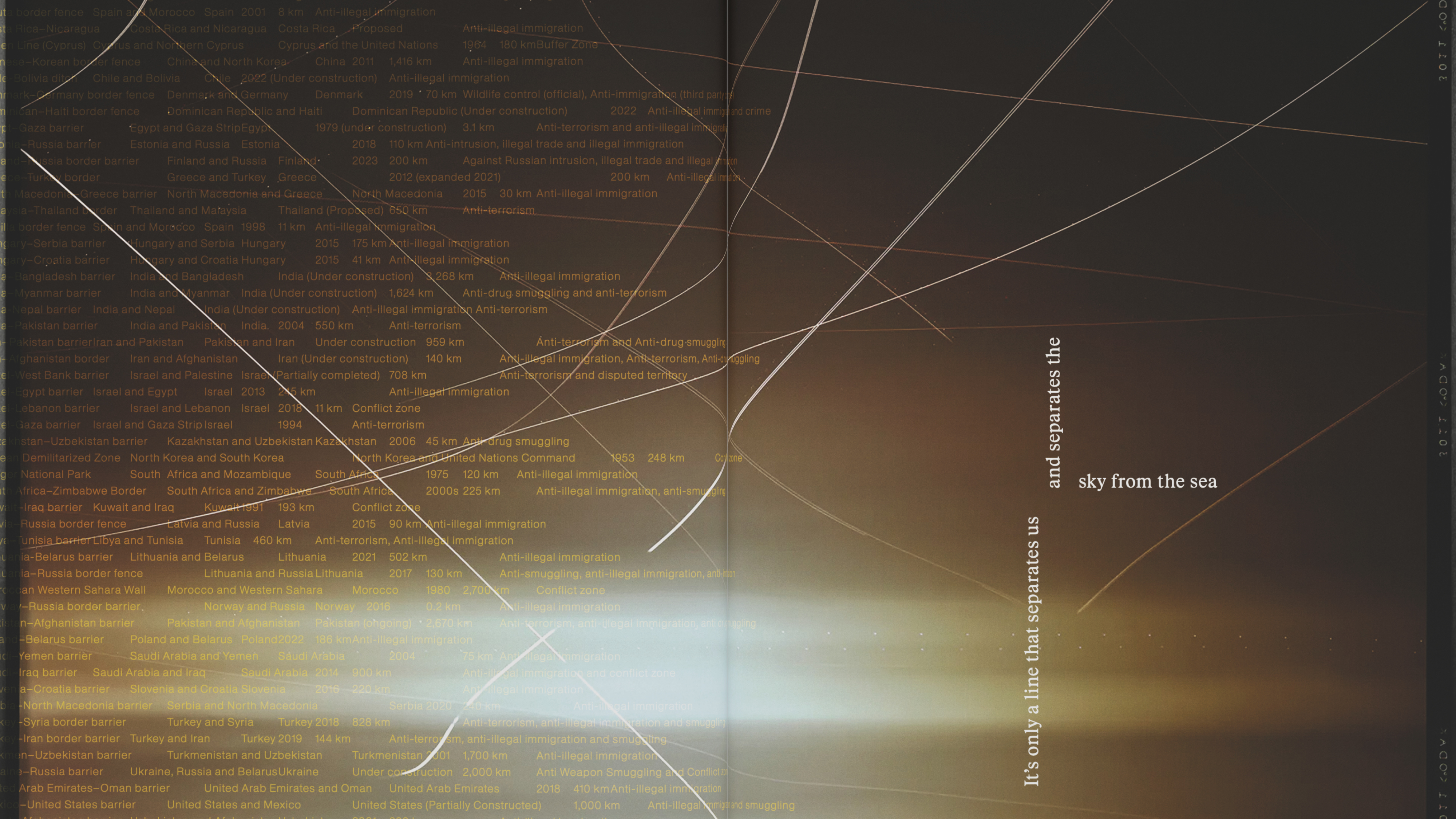 “Lines That Divide Us” is a hypothetical exhibition & publication centered around migration, displacement, and border walls. The publication shares experiences of the displaced population and questions rights to citizenship. A sense of movement and shifting scales is a core element in the design, depicting the implications for the often “unseen.” The end of the publication provides a moment for alternative thinking through nomadic experiences and the transient nature of drawn borders.