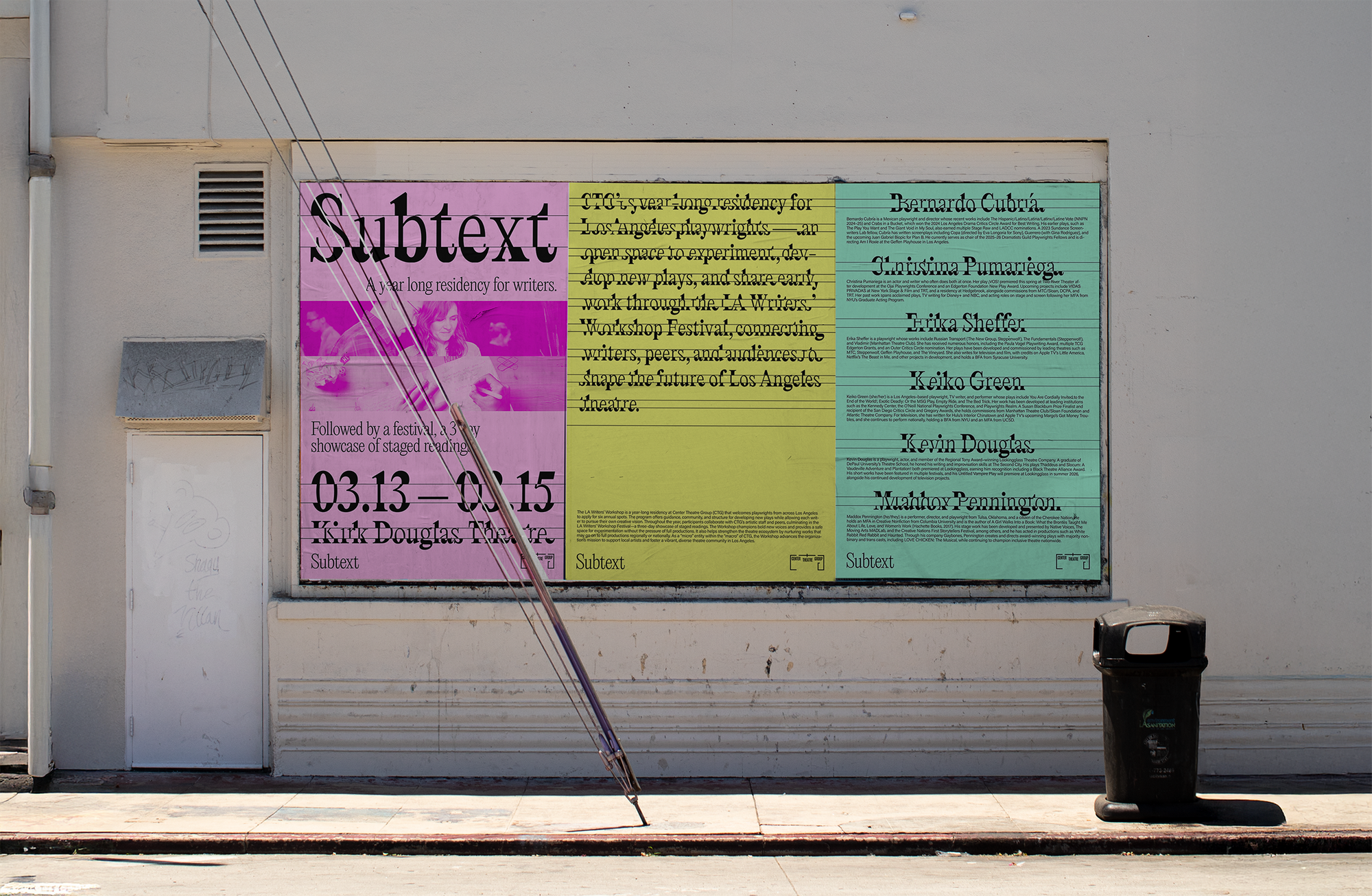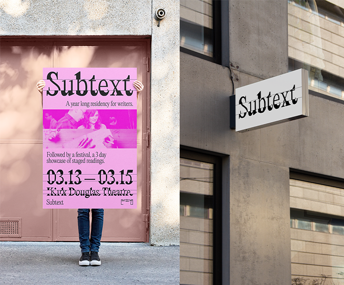 Its identity centers on writing and process rather than traditional theatrical imagery. A generative typographic tool defines the visual language, creating an intentionally text-heavy system that embodies the idea of “reading between the lines.” Layouts reference script formatting through centered titles and subtitles with left-aligned body copy, while a Post-it–inspired palette nods to brainstorming and iteration.