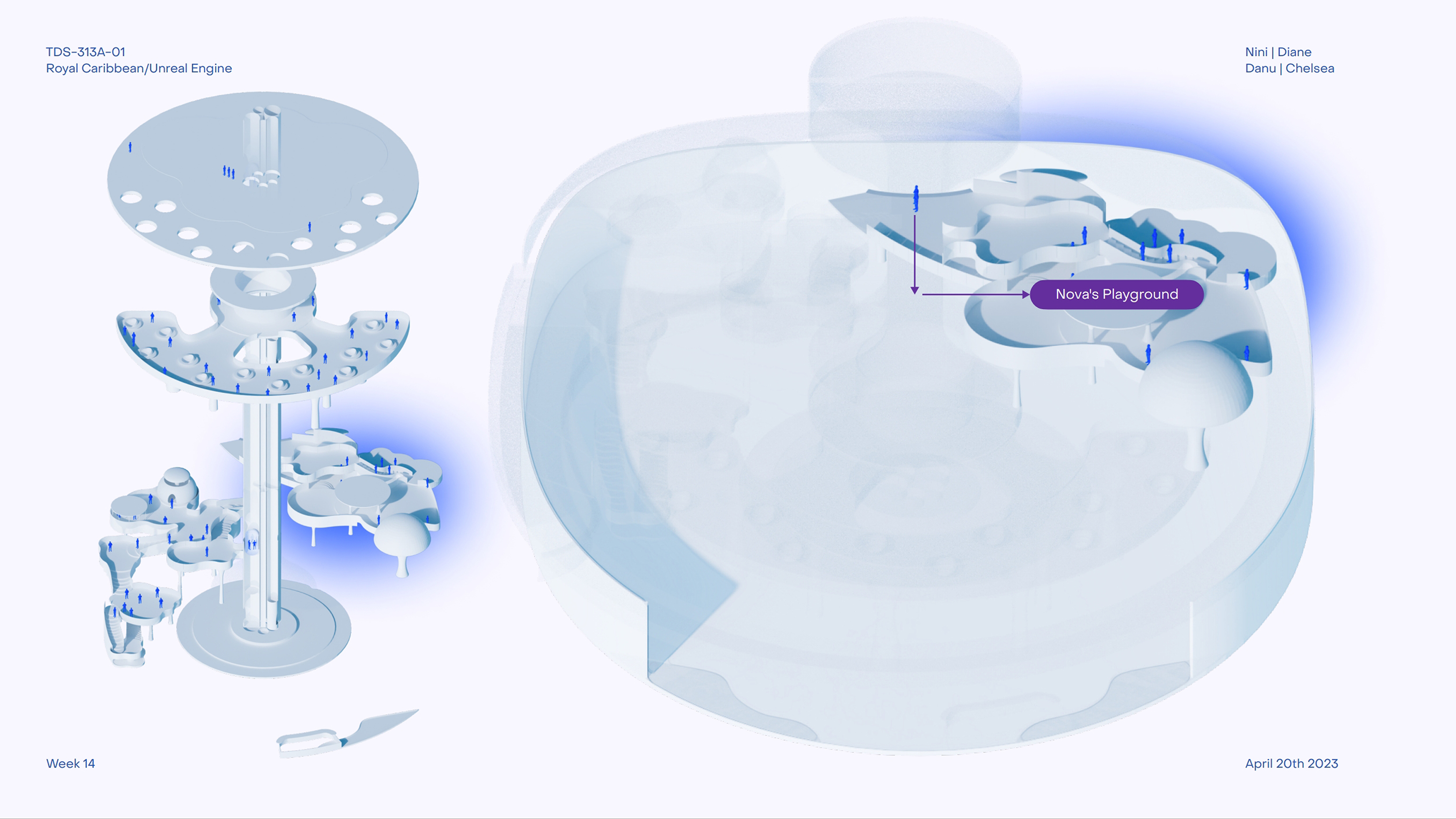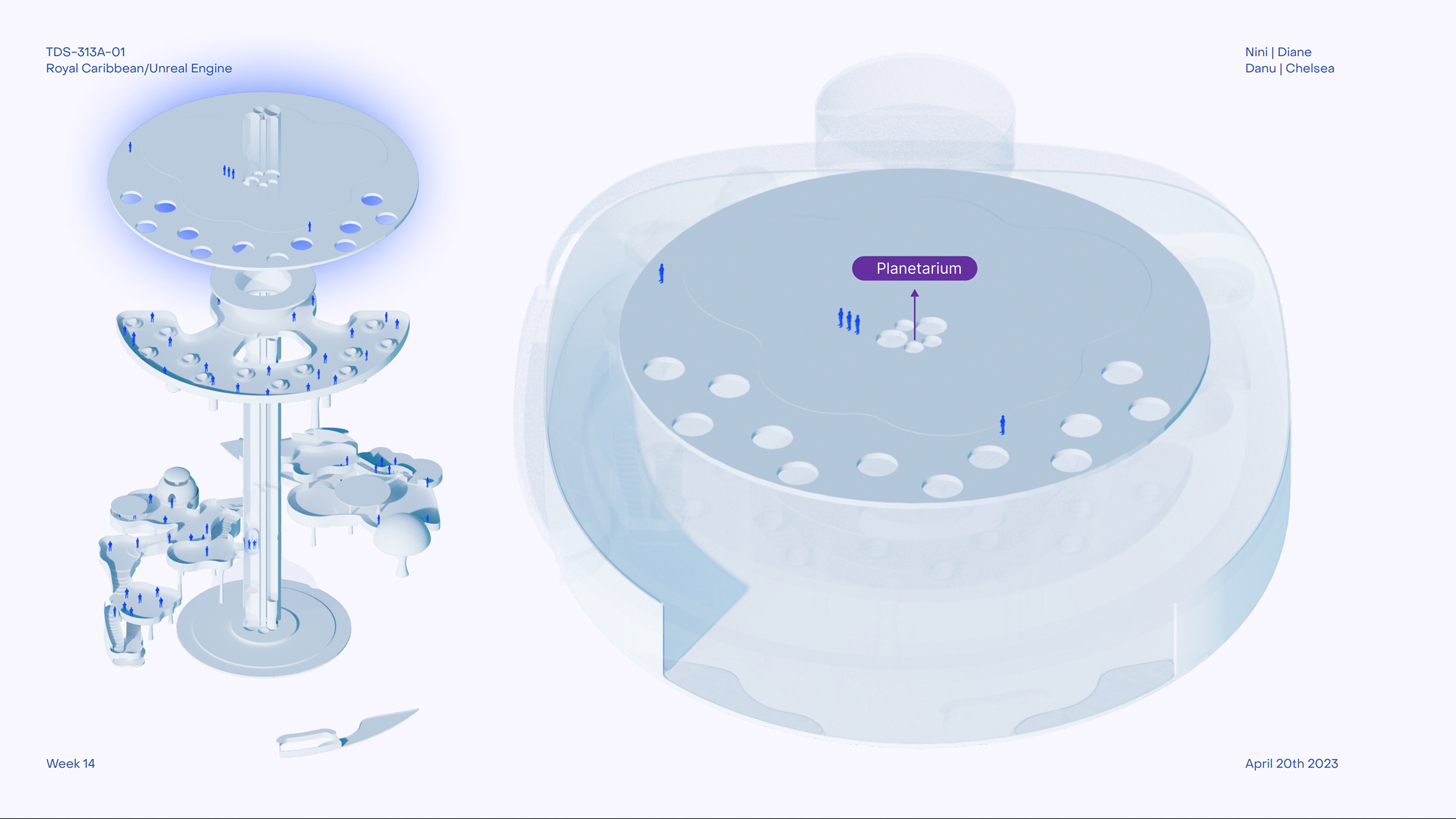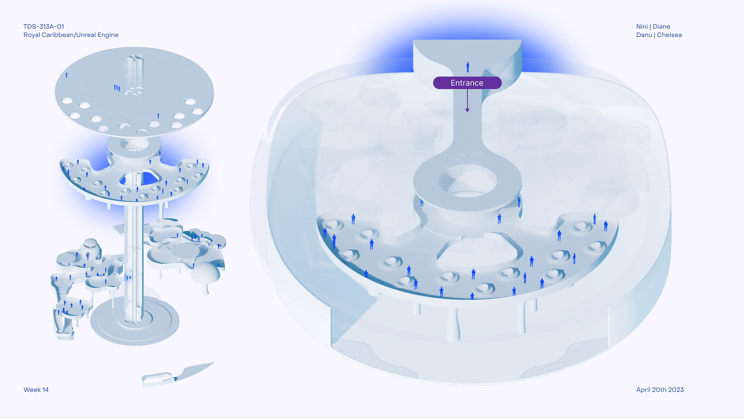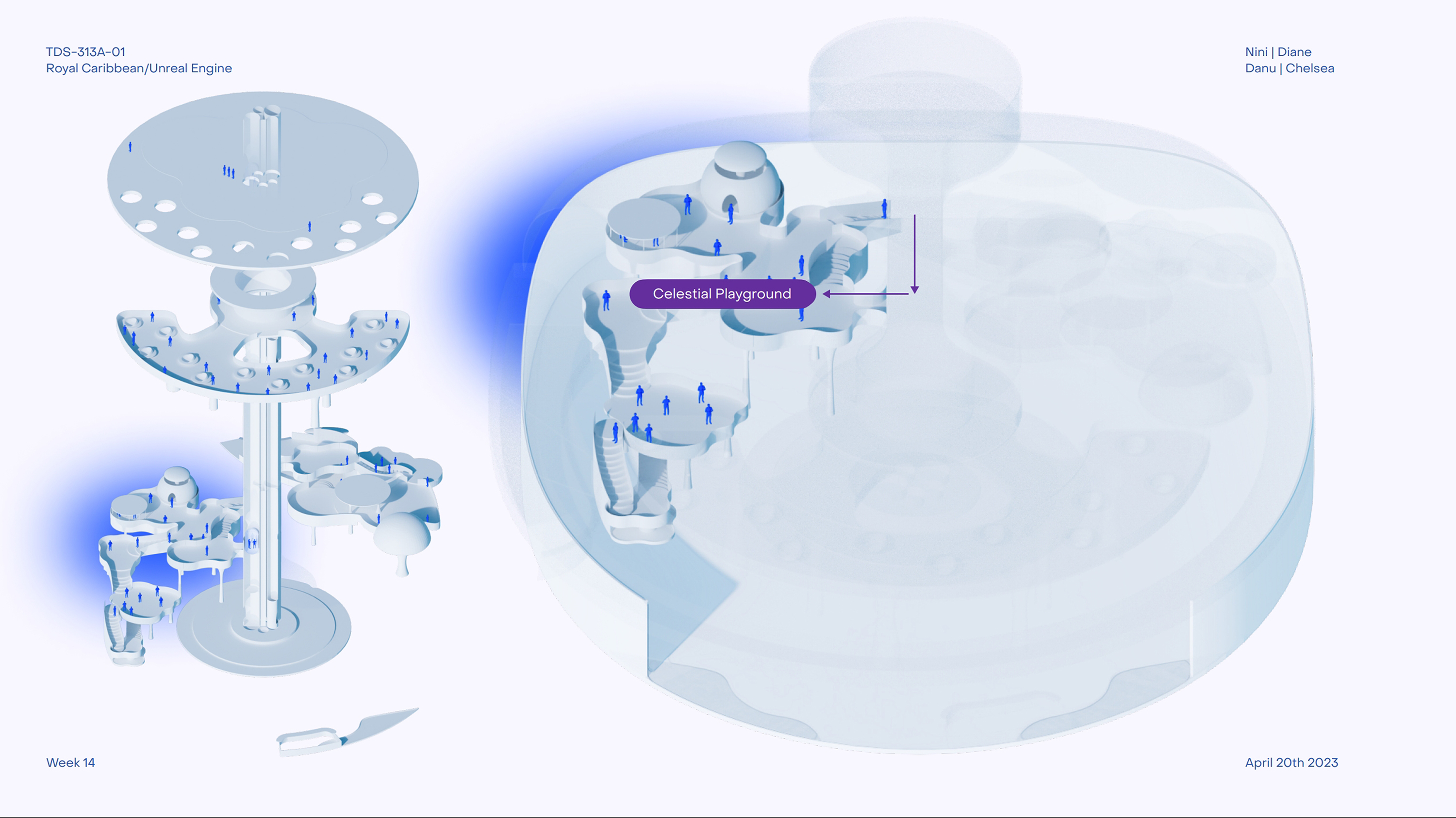 Royal Caribbean sponsors the project to create an engaging cruise experience. With a team of interdisciplinary designers—Chelsea Cheung, Danu Danari, and Diane Liu—we aim to design a dynamic community space for guests' enjoyment. From dining to entertainment, retail to leisure, every aspect of daily life is considered.
