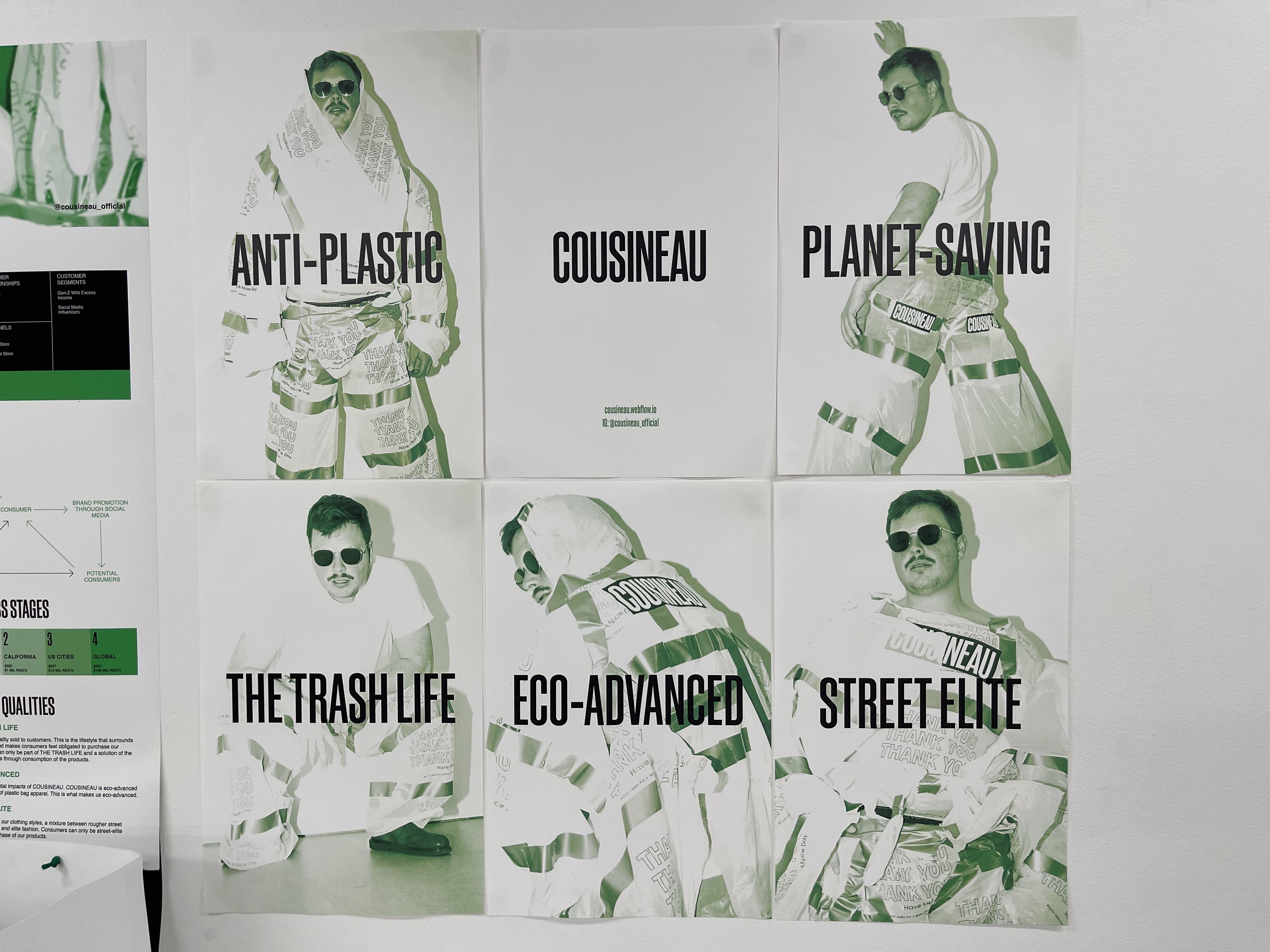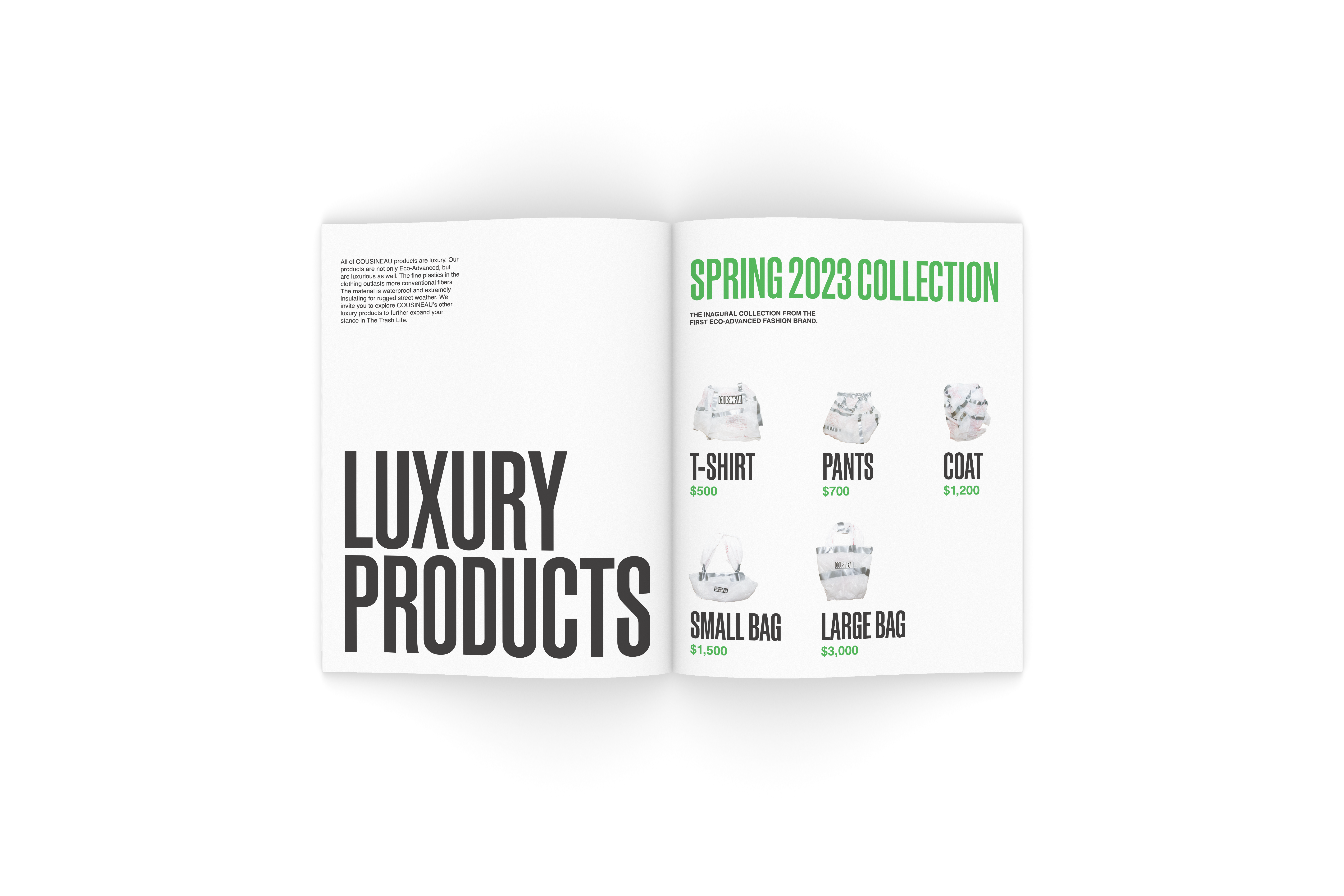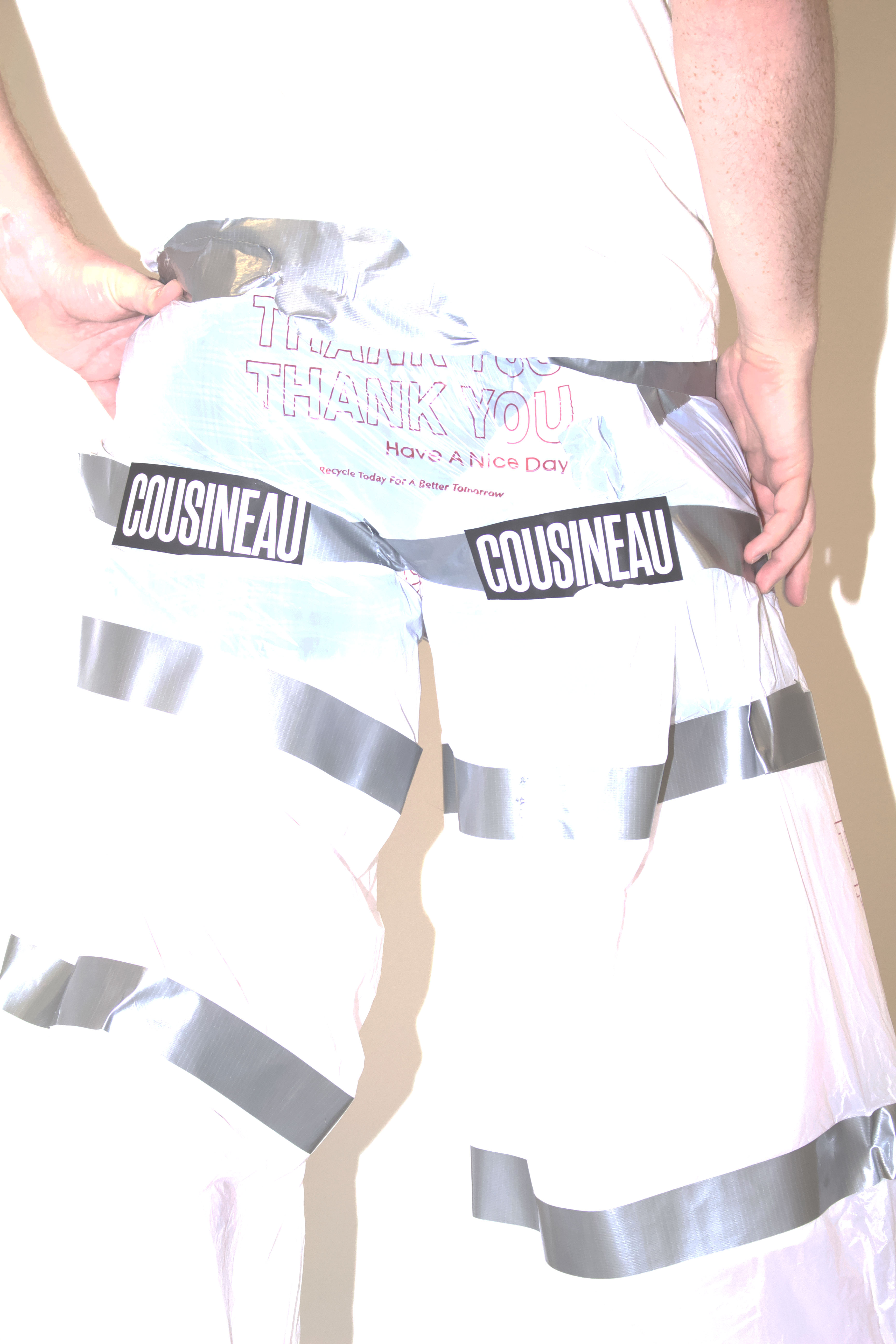 COUSINEAU is a business created for Lauren Cantor's Grad Studio 4 course. This project was made as an artistic statement about consumerism and design. COUSINEAU treats itself as a serious high-end luxury fashion brand that sells horribly made plastic bag clothing. This project shows how businesses commonly get away with selling consumers junk they don't need while making the consumers feel good about themselves at the same time.