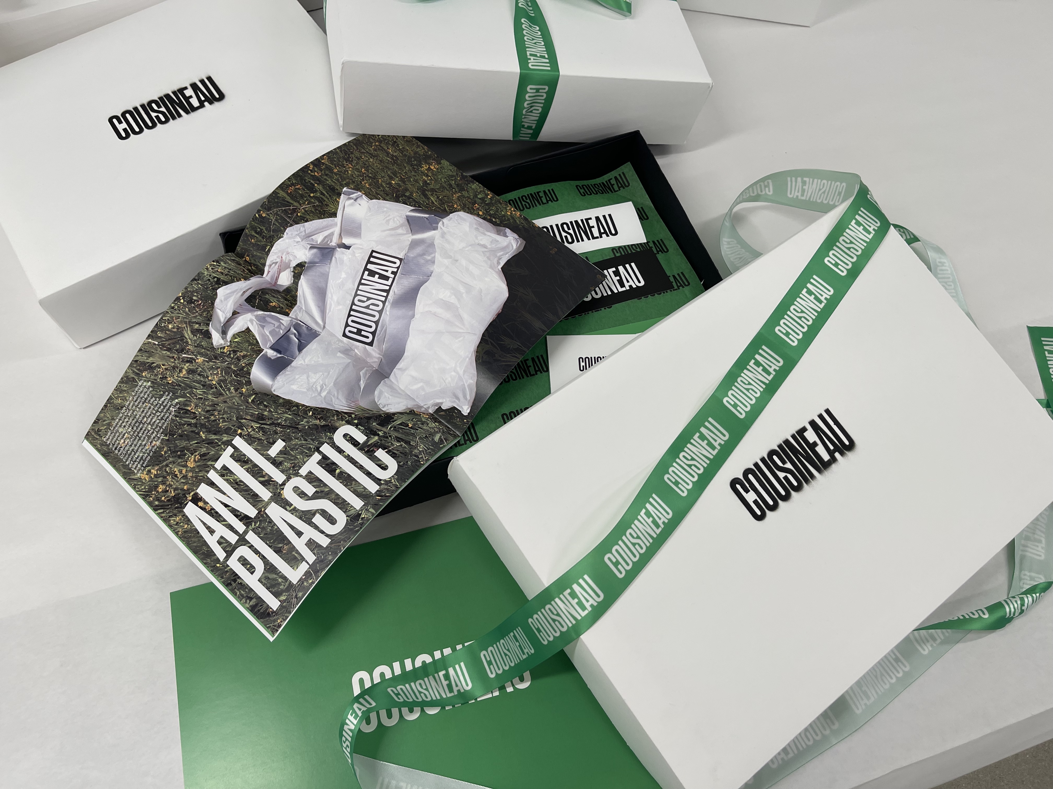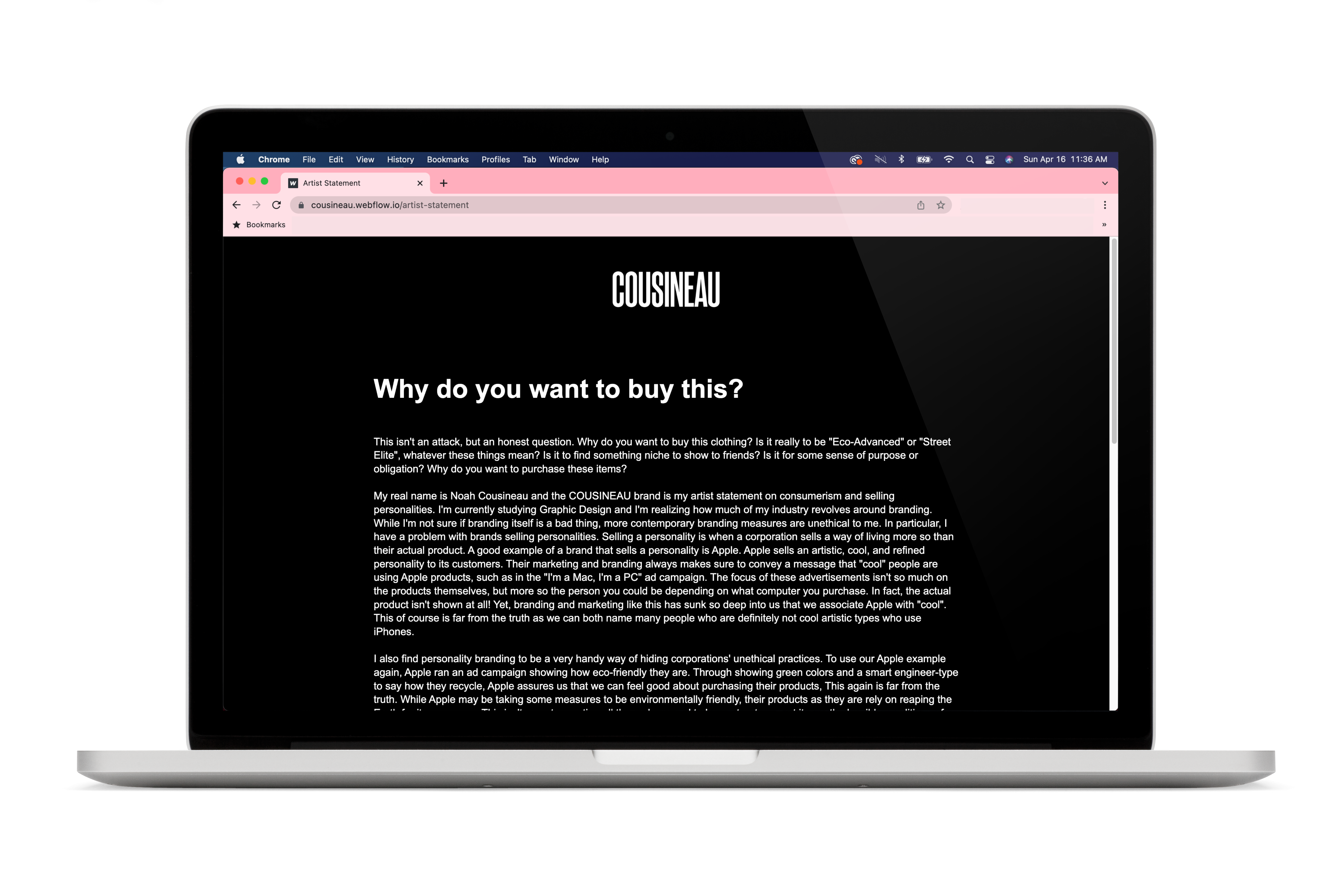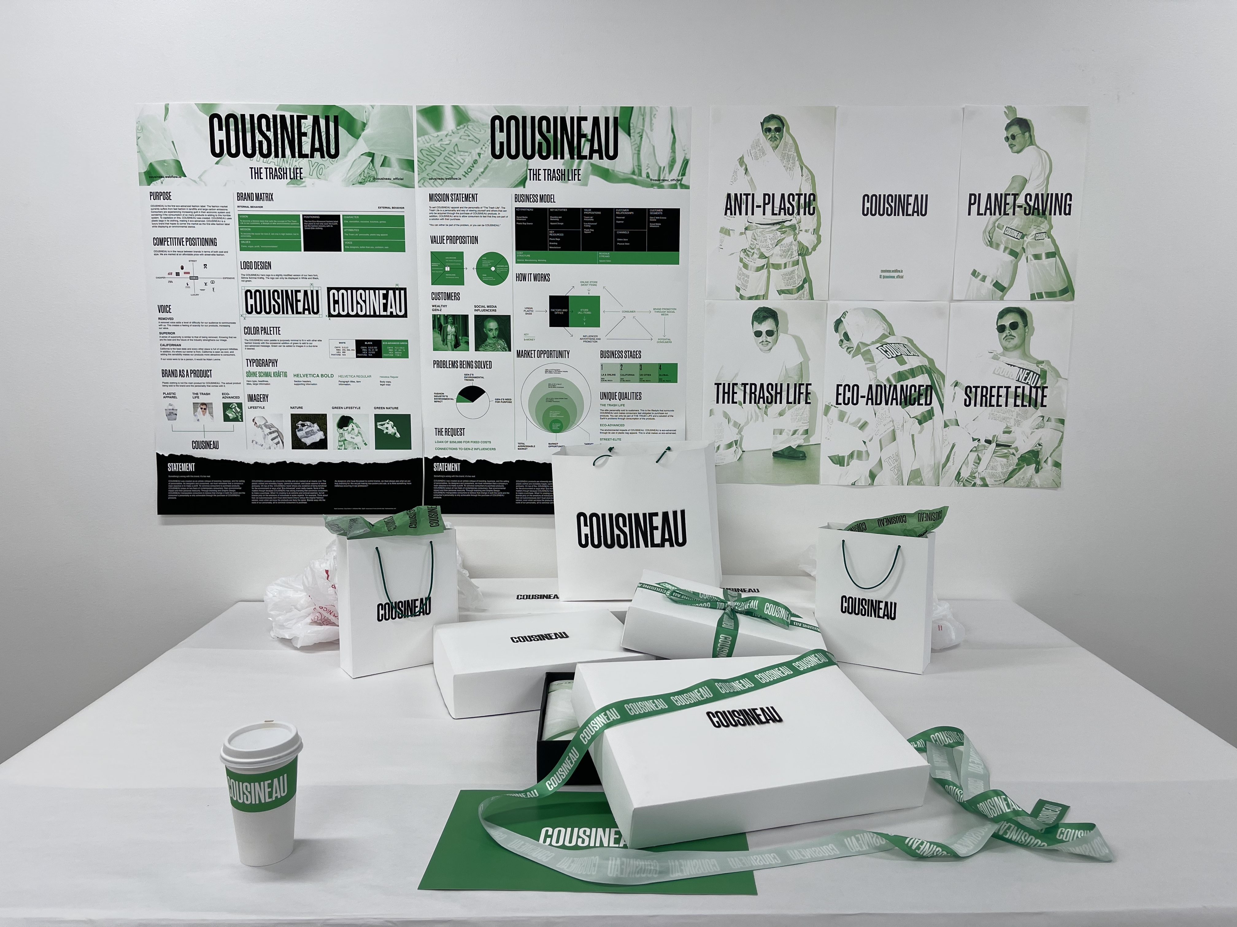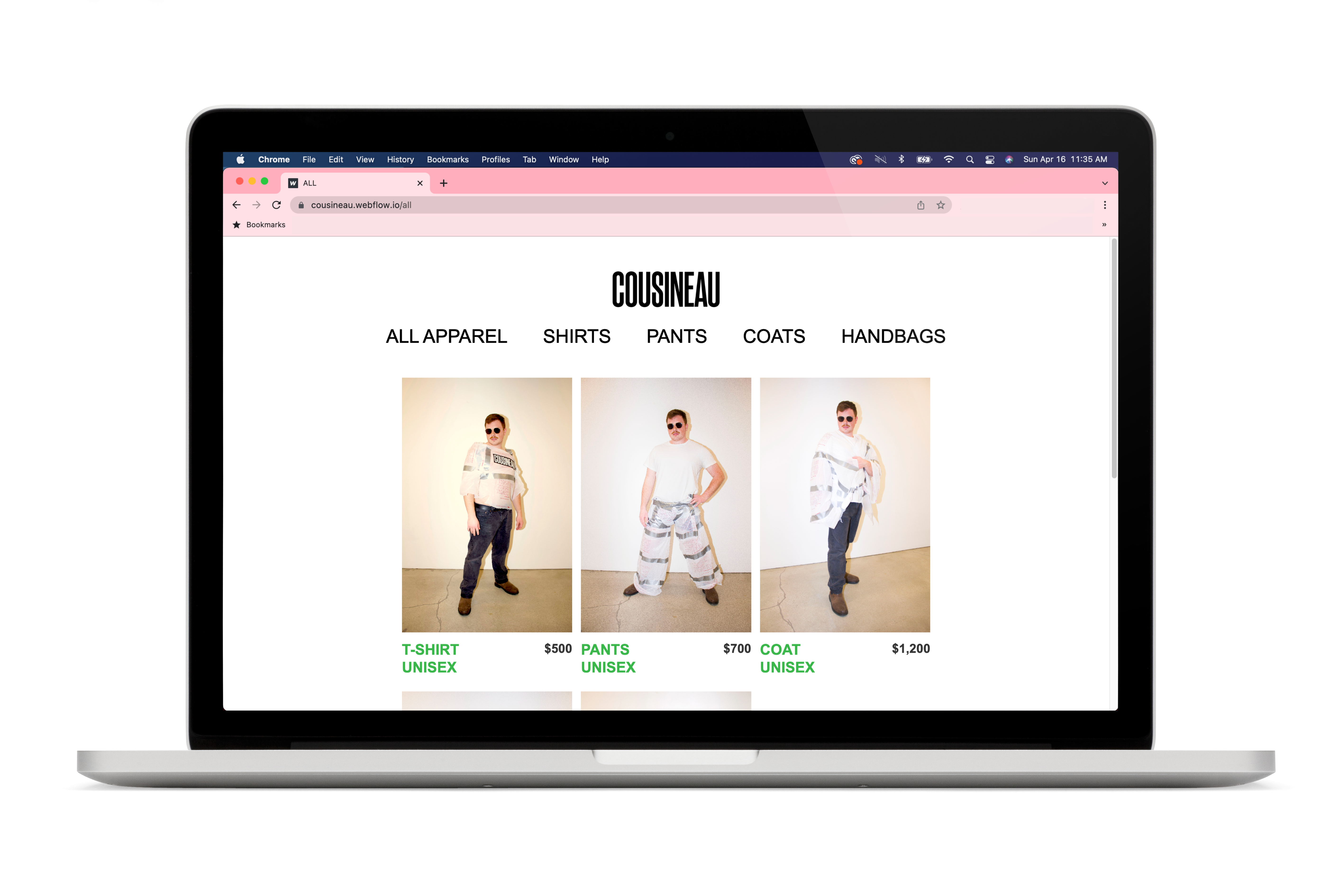 COUSINEAU is a business created for Lauren Cantor's Grad Studio 4 course. This project was made as an artistic statement about consumerism and design. COUSINEAU treats itself as a serious high-end luxury fashion brand that sells horribly made plastic bag clothing. This project shows how businesses commonly get away with selling consumers junk they don't need while making the consumers feel good about themselves at the same time.