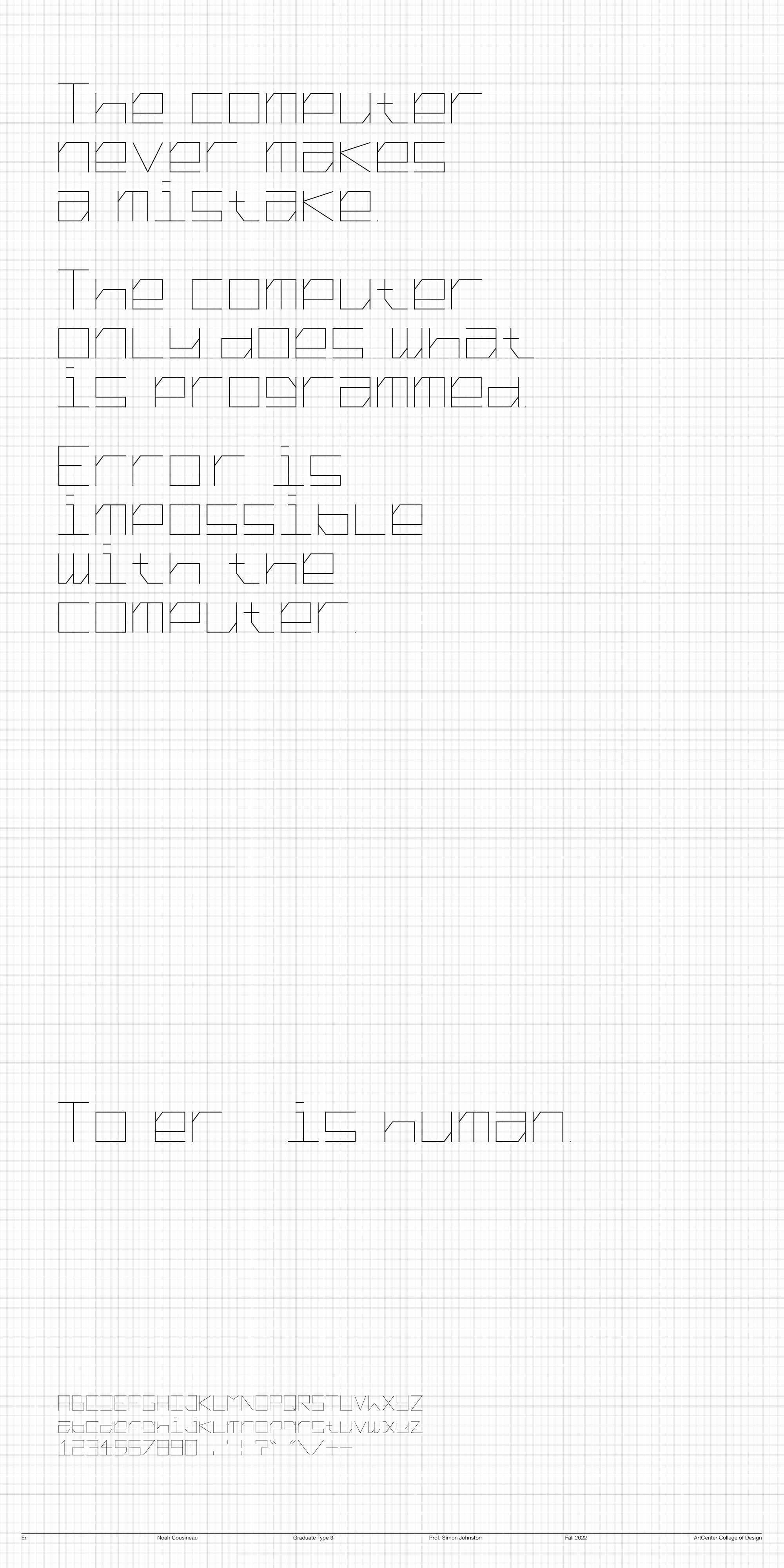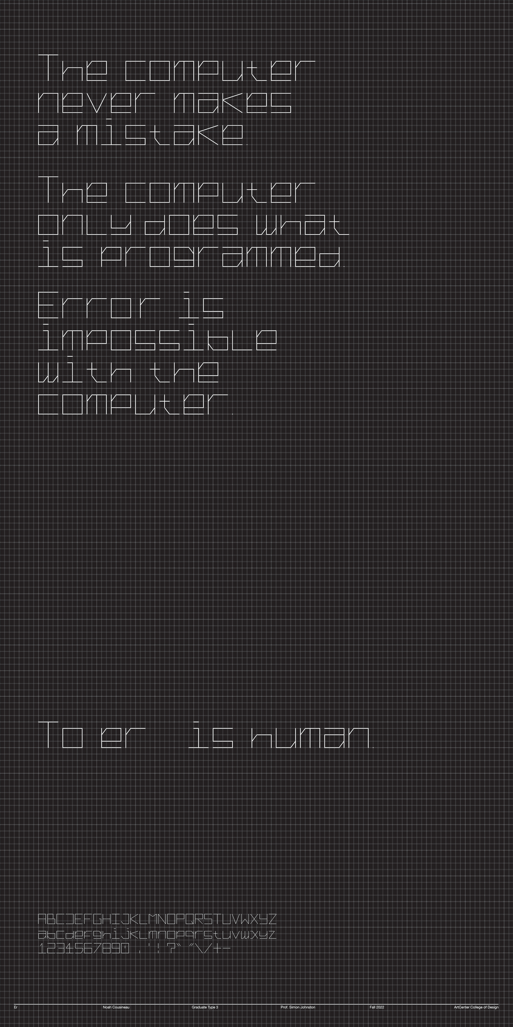 For Graduate Typography 3, students were assigned to create a modular typeface in the span of four weeks. When trying to find a design for my typeface, I realized I was creating sketches that reminded me of early computing and word processing. I leaned into that concept and created Er. The concept of early computing fascinated me as the discussions of the time focused around how error would be impossible with the computer. I added this language with a bit of humor in the final poster.