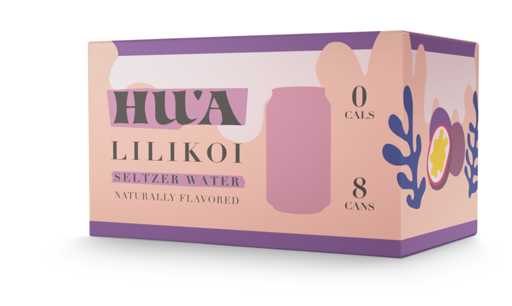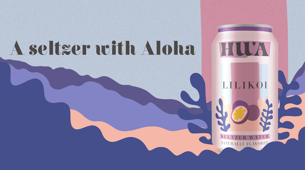 Branding for a fictitious seltzer company, Hu'a. Hu'a, Hawaiian for bubble, specializes in seltzers made with flavors found around the Hawaiian islands. All designs and illustrations were created by the artist and made to show skillset in branding and package design.
