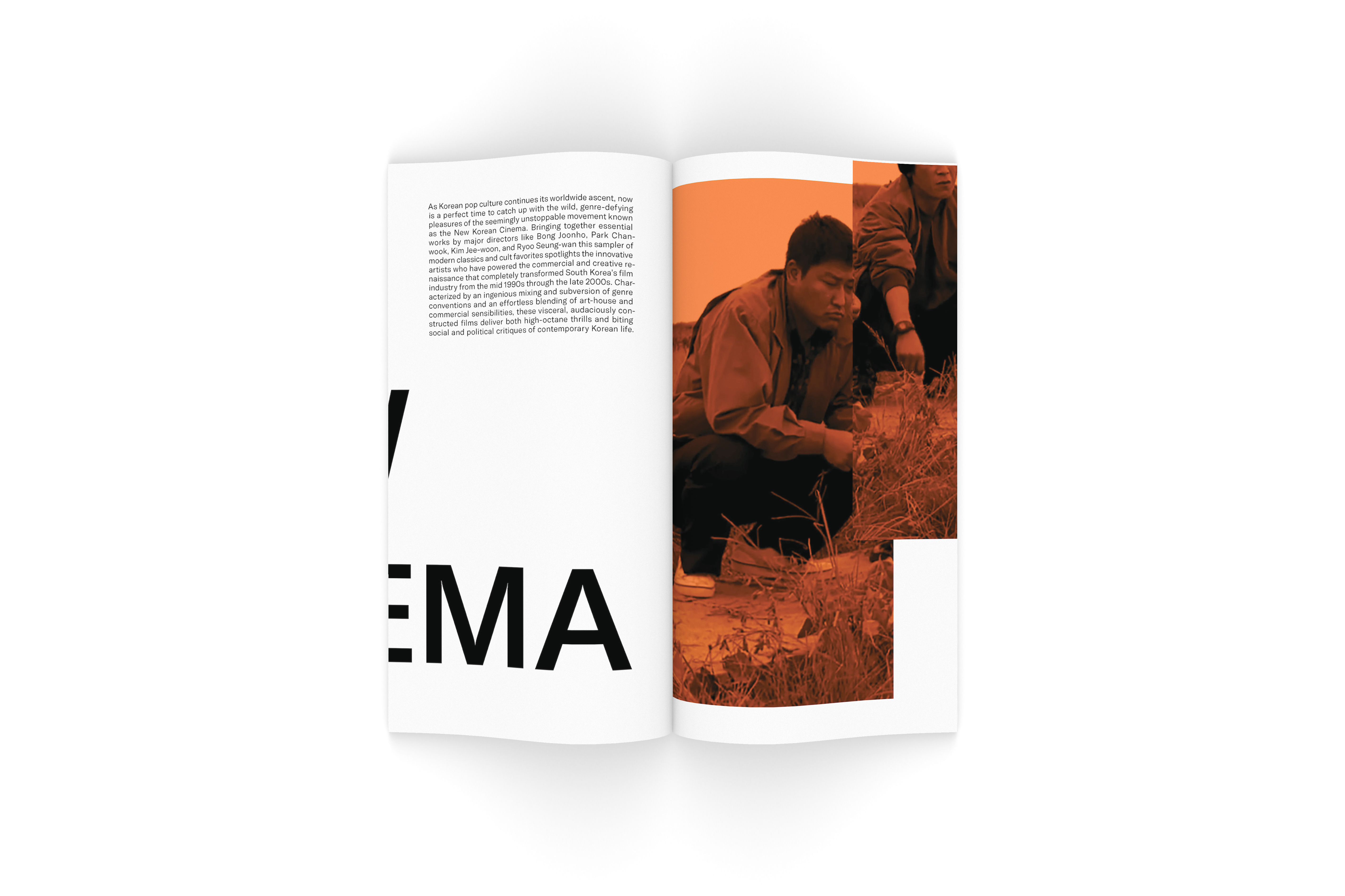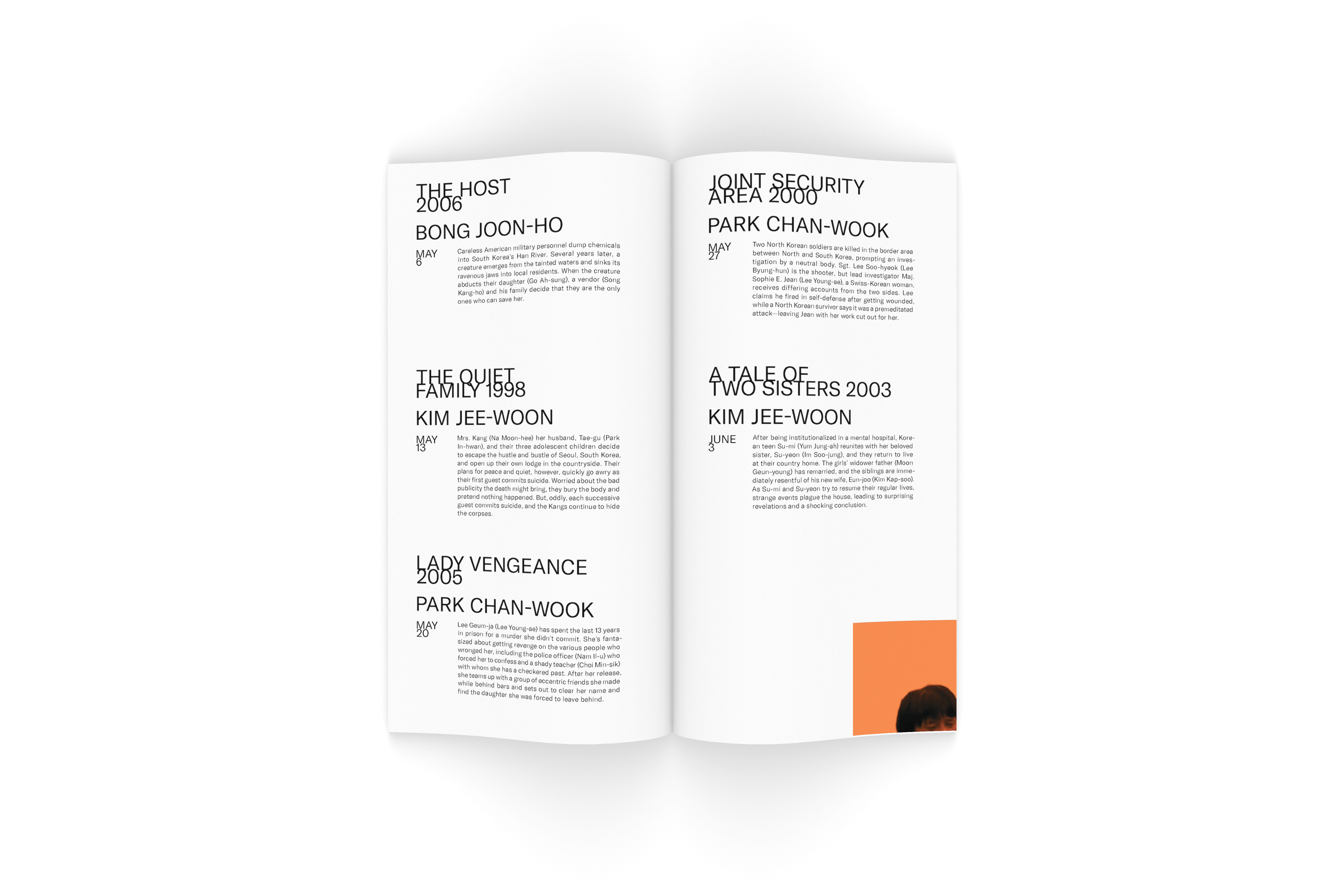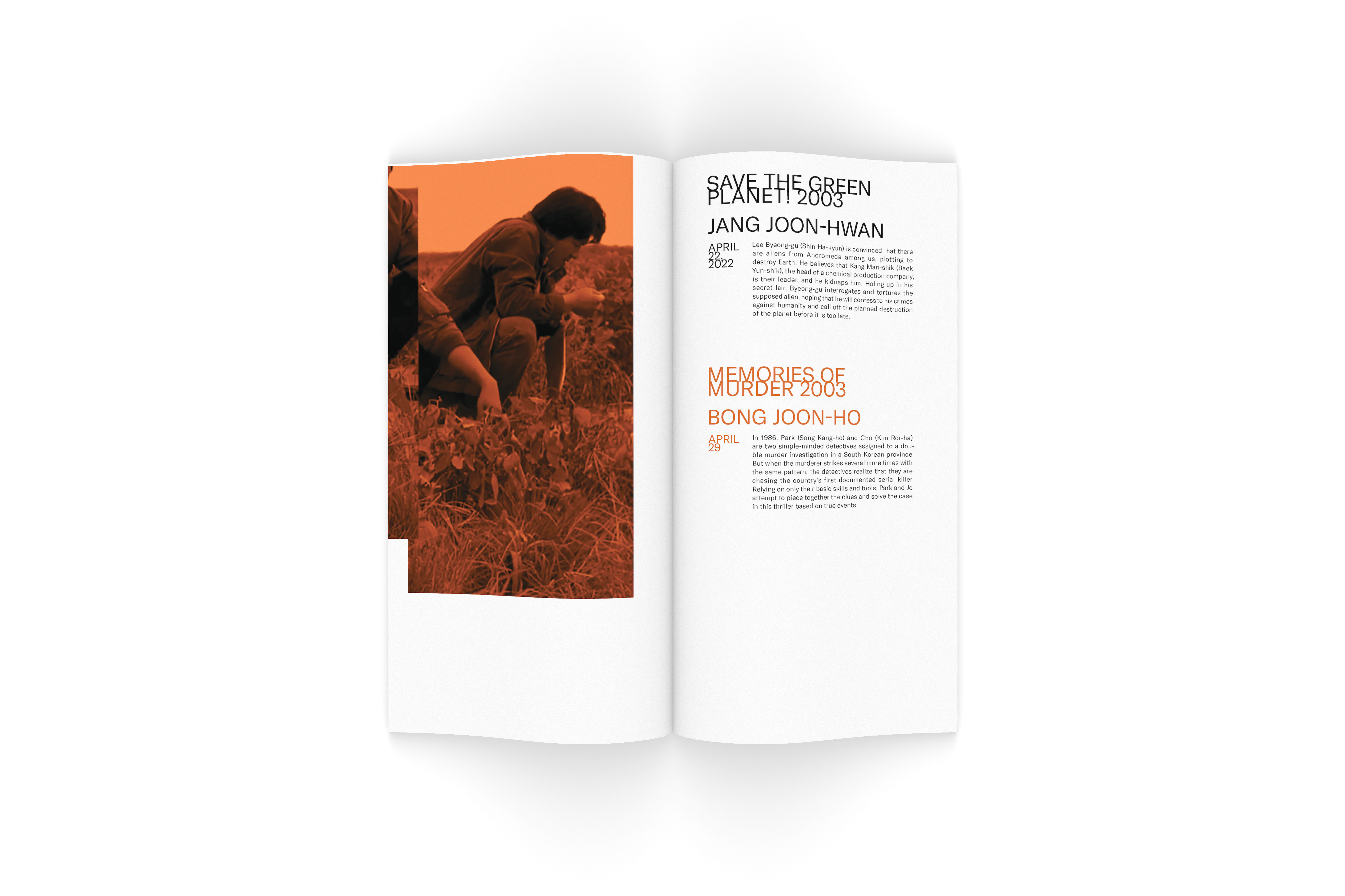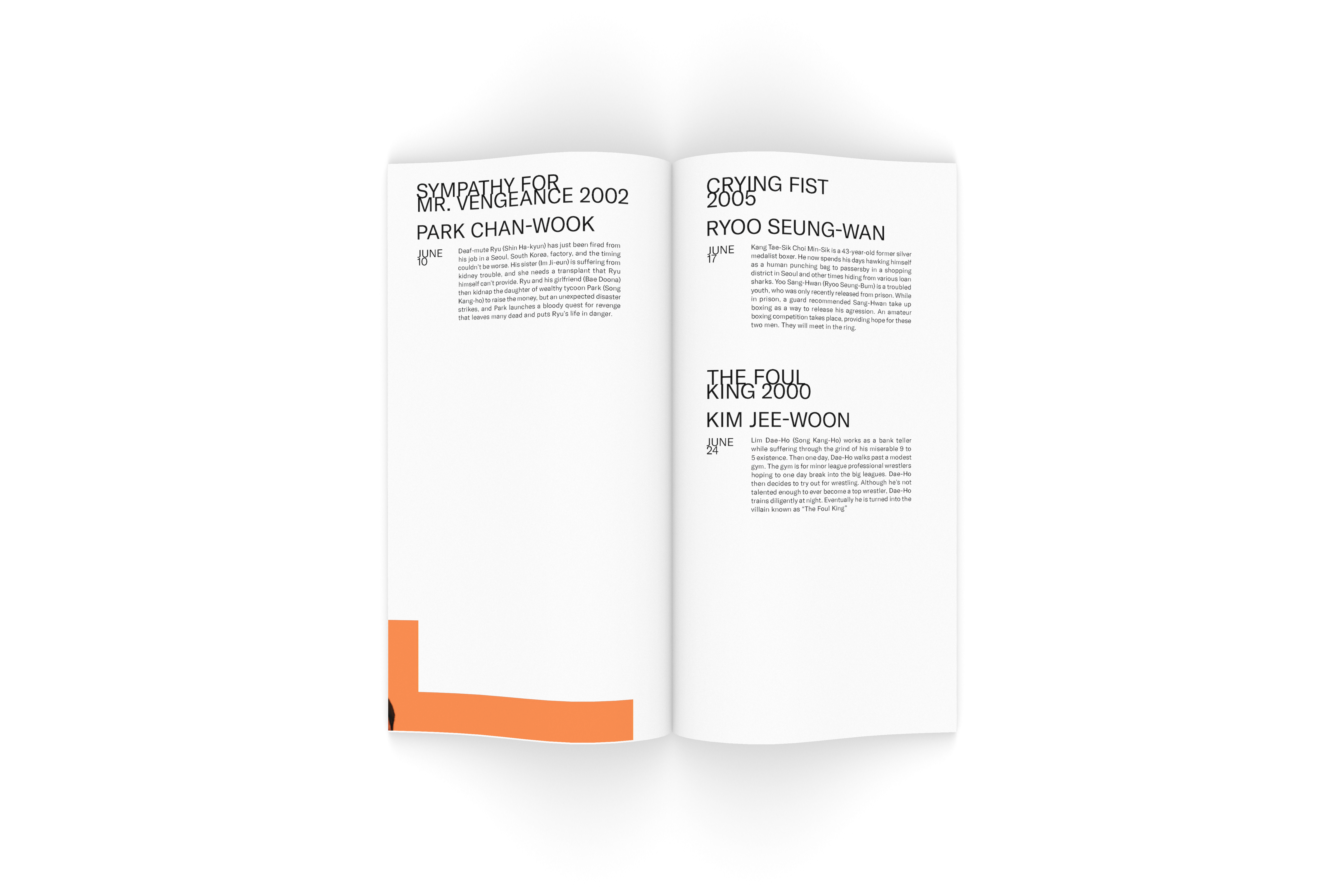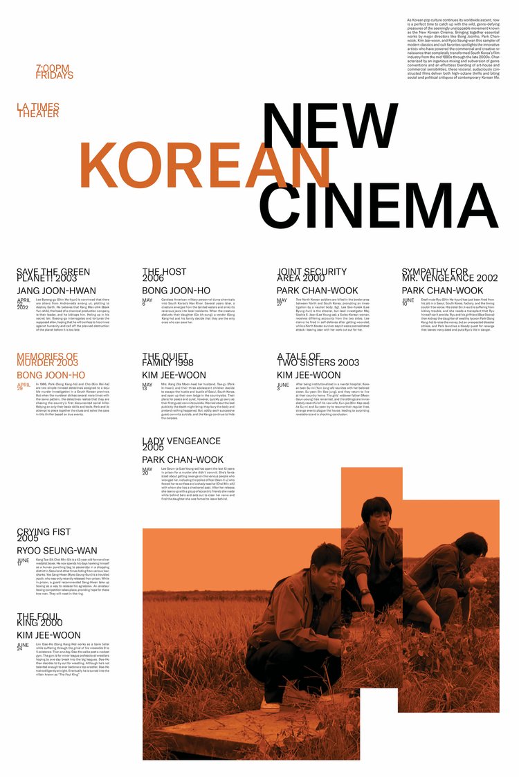 Students were assigned to create a poster that also functioned as a french fold brochure for a mock film festival called "New Korean Cinema". The contents of the poster (except for the movie descriptions) were assigned to students. I chose to focus on how these movies focused on breaking the rules, so I made a poster and booklet that broke some common rules of typography.
