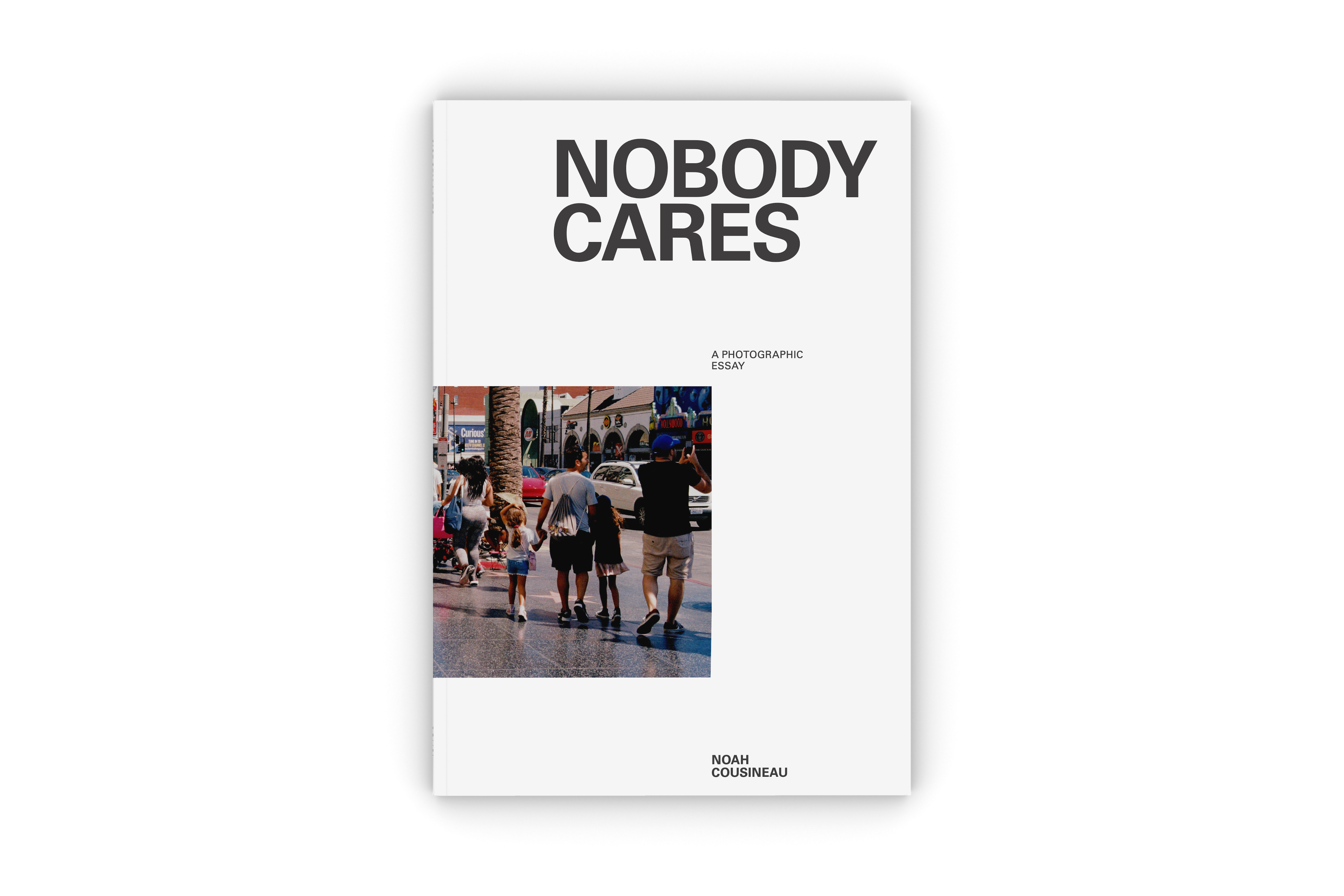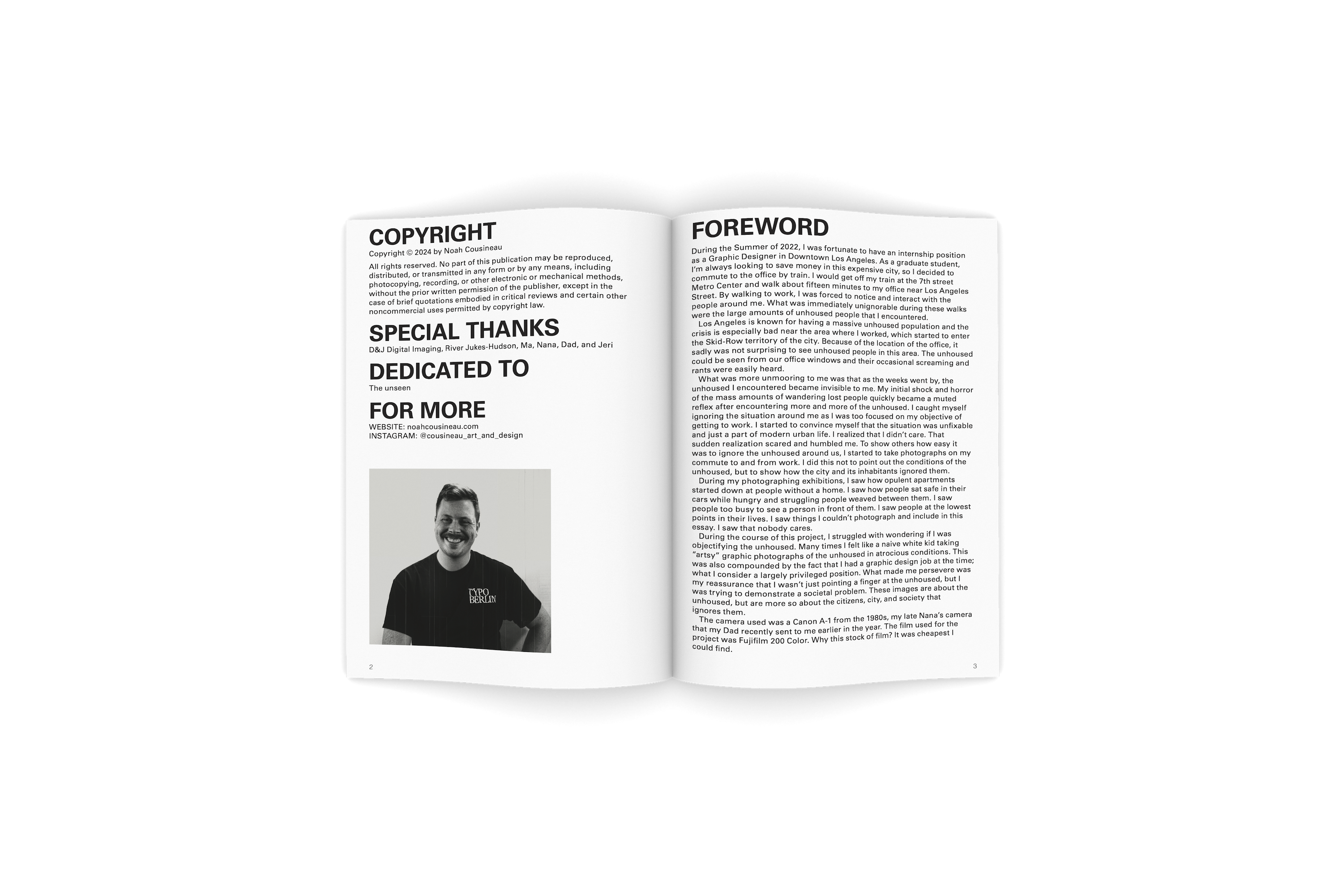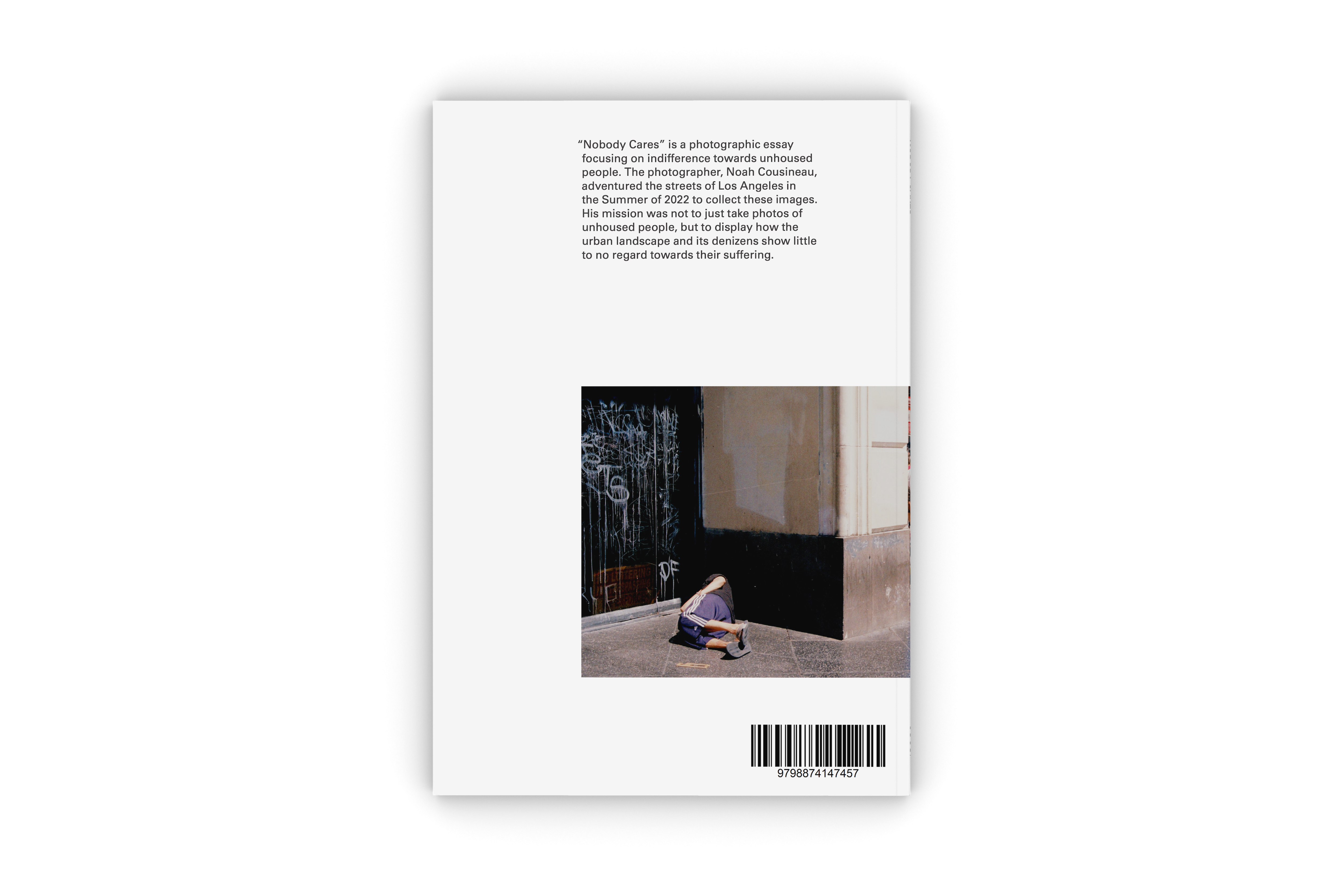 During my Summer internship of 2022, I commuted to work in DTLA by train and walking. During my commute, I encountered hundreds of unhoused individuals that were ignored by the pedestrians walking by. Shocked at this lack of care, I decided to use my film camera given to me by my father to capture the split between our world and the world of the unhoused. These images were collected to create a self-published book called NOBODY CARES. This project shows the cover and some example spreads.