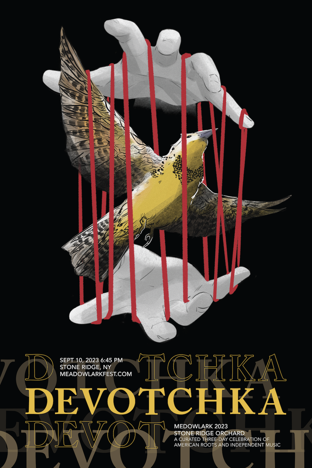 This poster, for Devotchka's upcoming show, features a piece of custom typography based on the band's logo. The concert information is paired with an illustration of a bird, which is being restrained by a cat's-cradle cage, held together by two mysterious hands. The poster and imagery is meant to capture the themes of the band's music and sound.