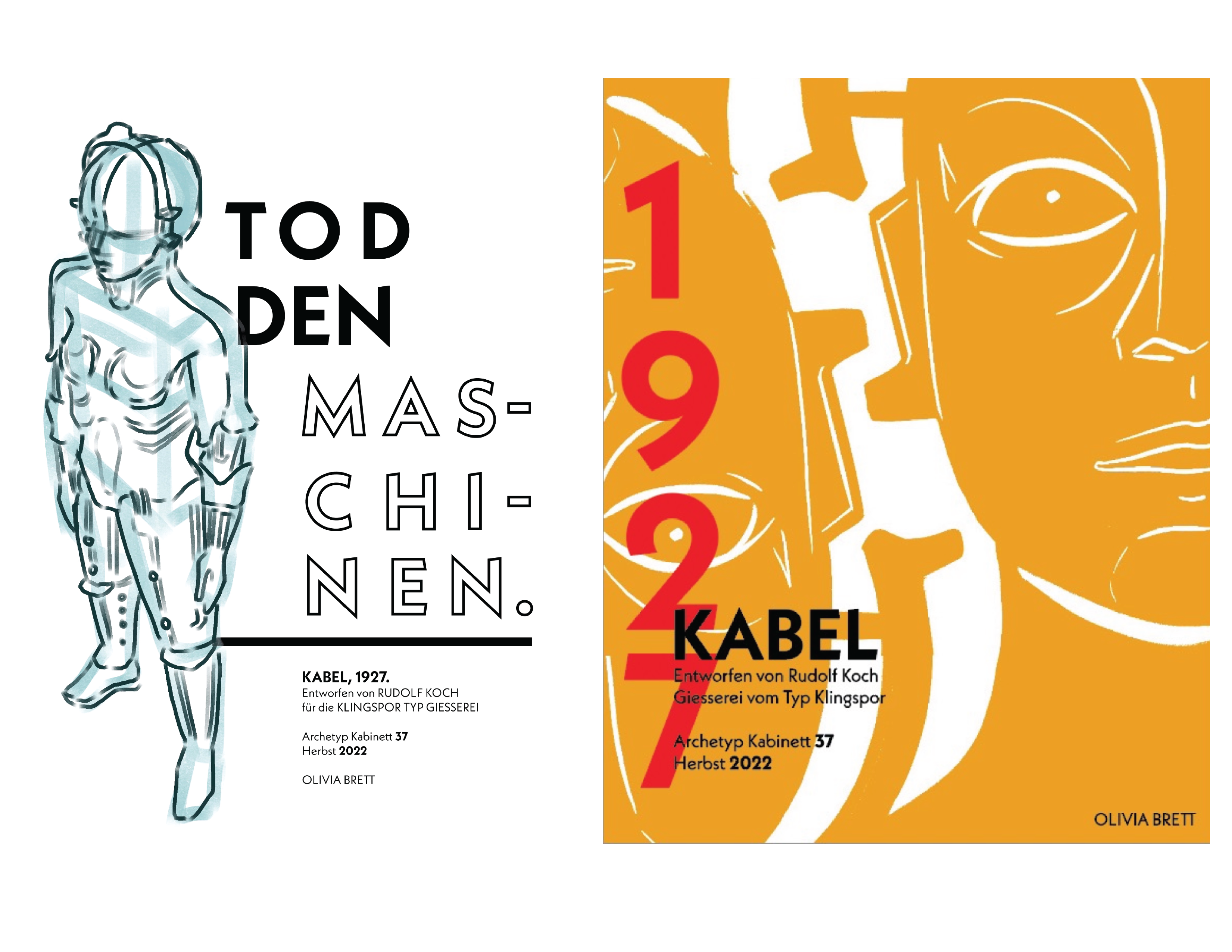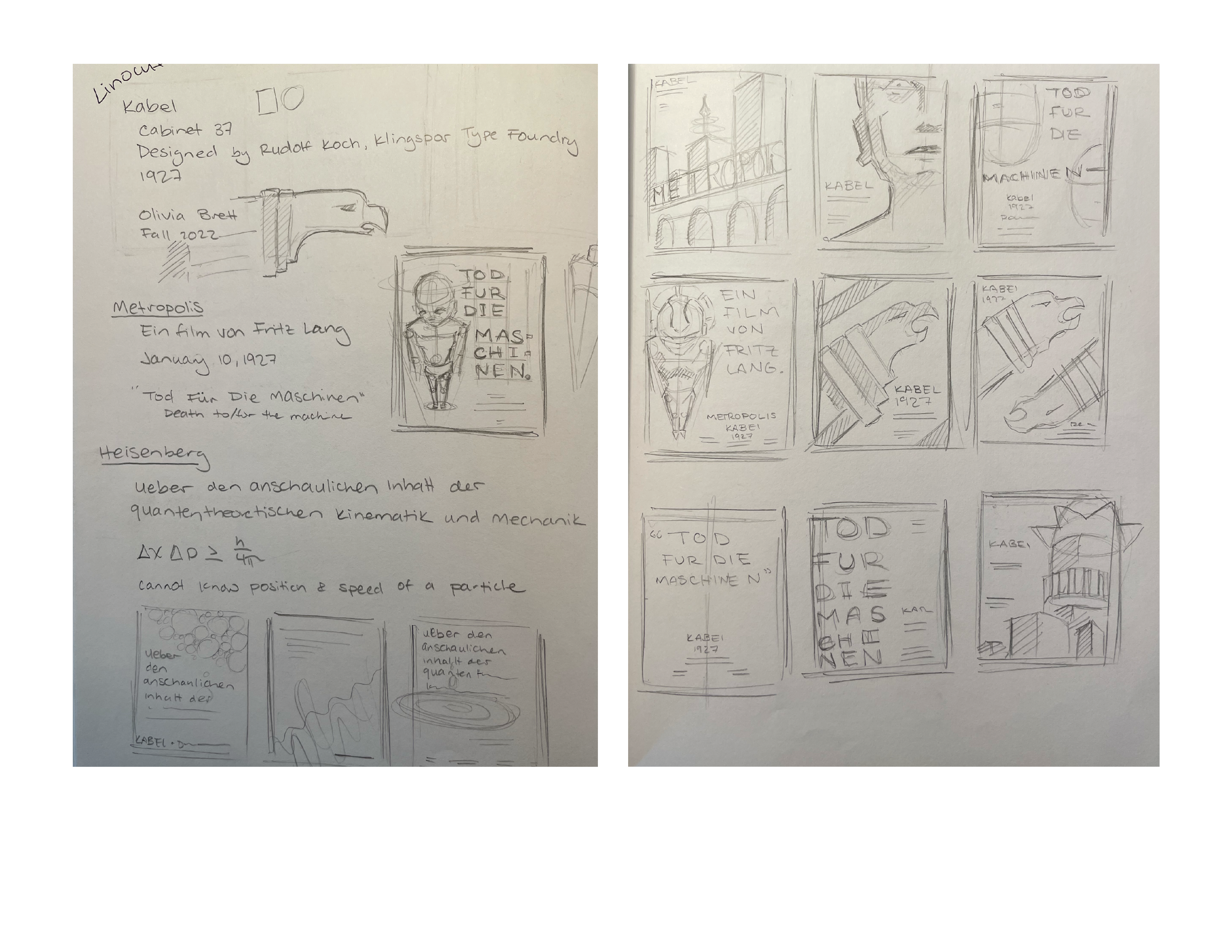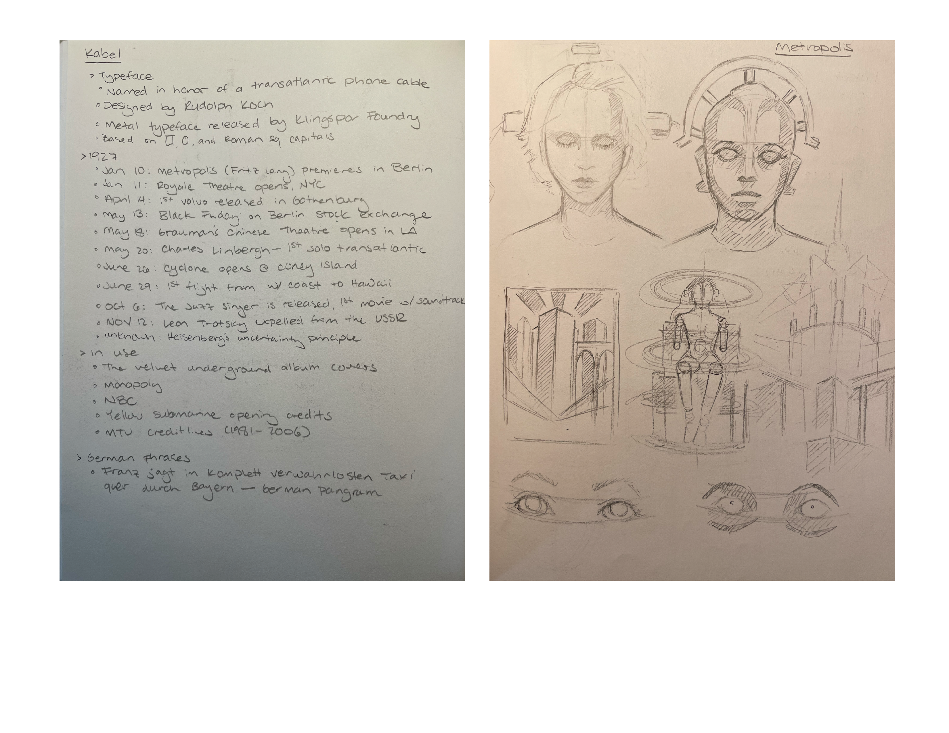 This project, in progress, involves creating a poster that relates to a chosen typeface. My poster is centered around Kabel. It focuses on the movie Metropolis, as this film directly relates to the typeface's German (expressionist) roots. The type on my poster is set in German, and features a large "1927," the year that the Metropolis and Kabel was released. The type is set on a gold background, which features a stylized, pared down depiction of the robot from the film.