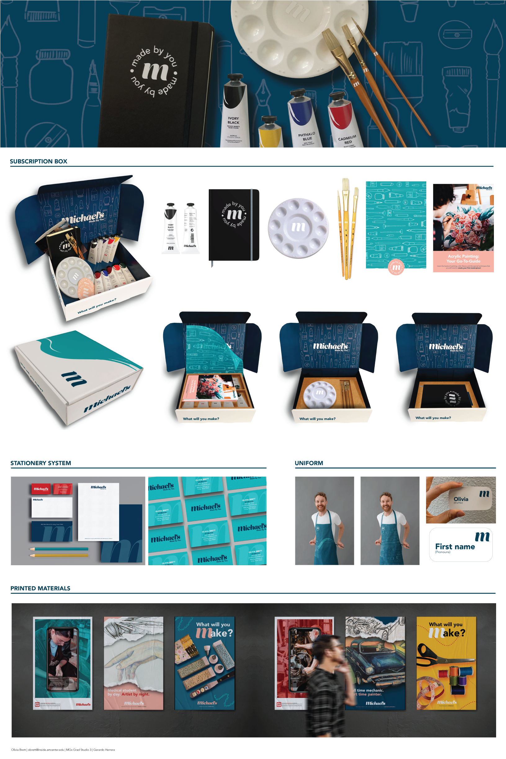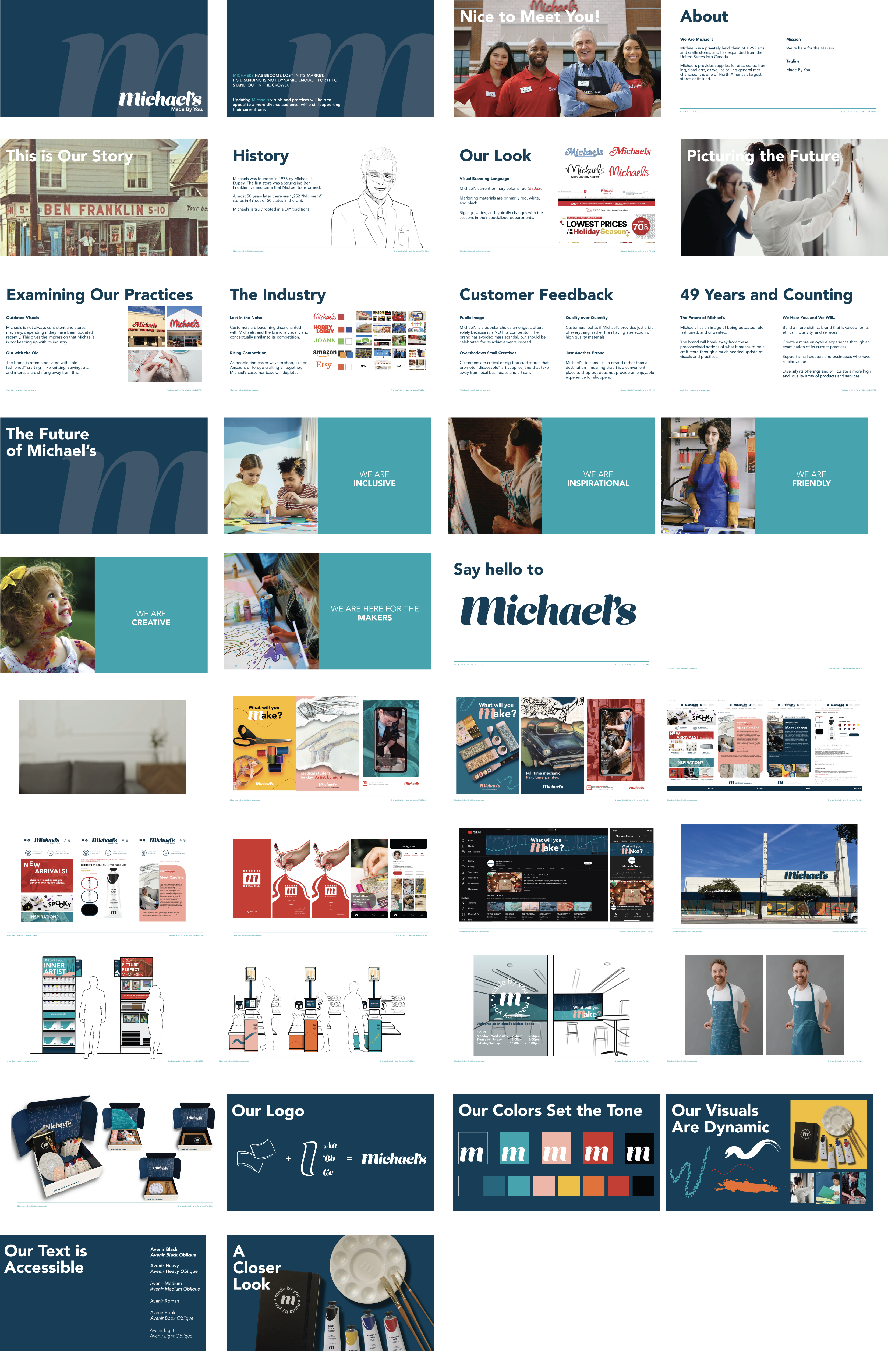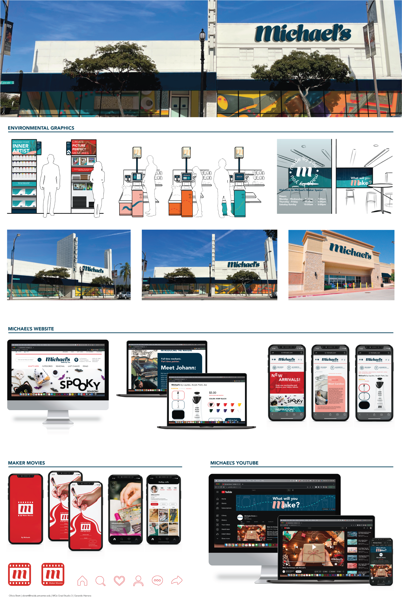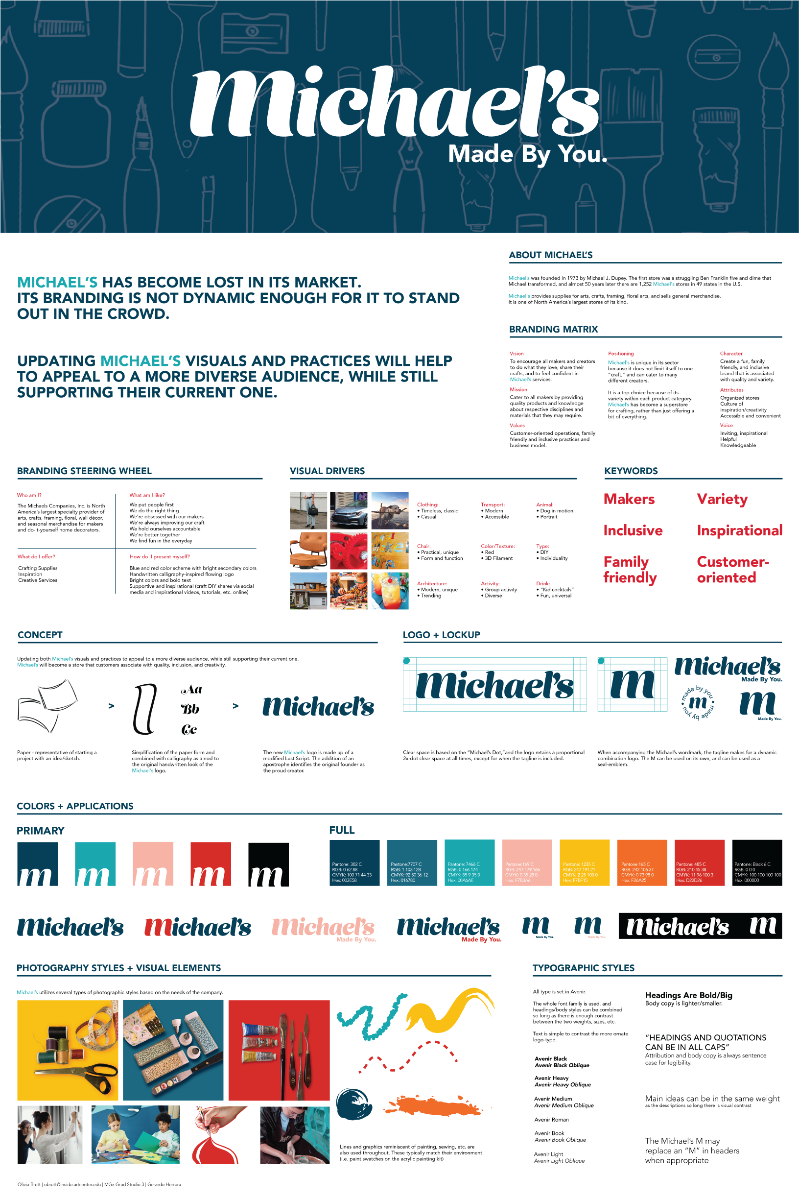 Throughout this semester, I worked on rebranding "Michael's" through a fresh update of their visuals and practices. "Michael's" image was modified to appeal to a more diverse audience, while still supporting their current one. Please find the Michael's brand video here: https://drive.google.com/file/d/1hX8PihxiemTGt1lgwAKbDQxk1lHLq4Gv/view?usp=share_link
