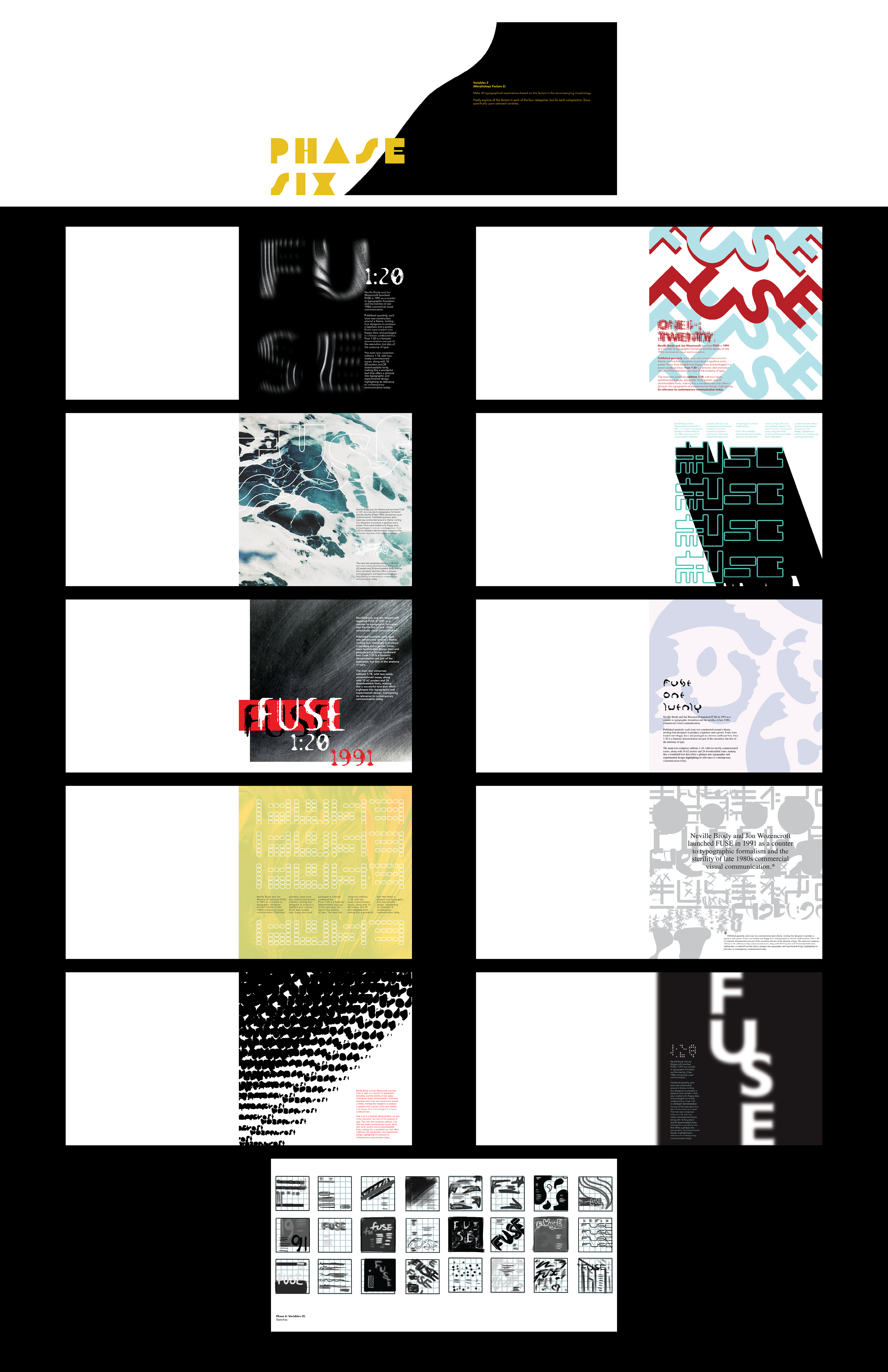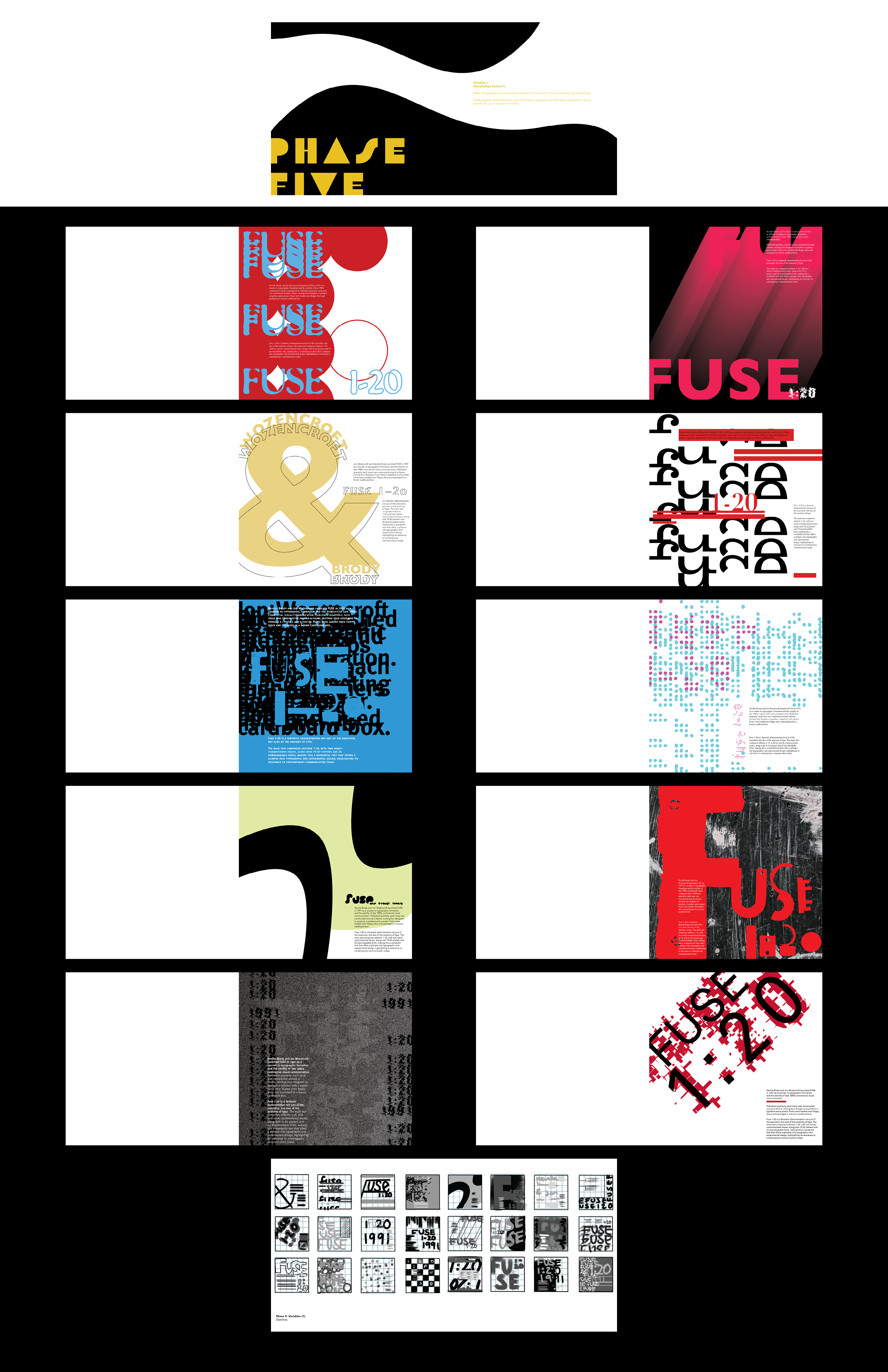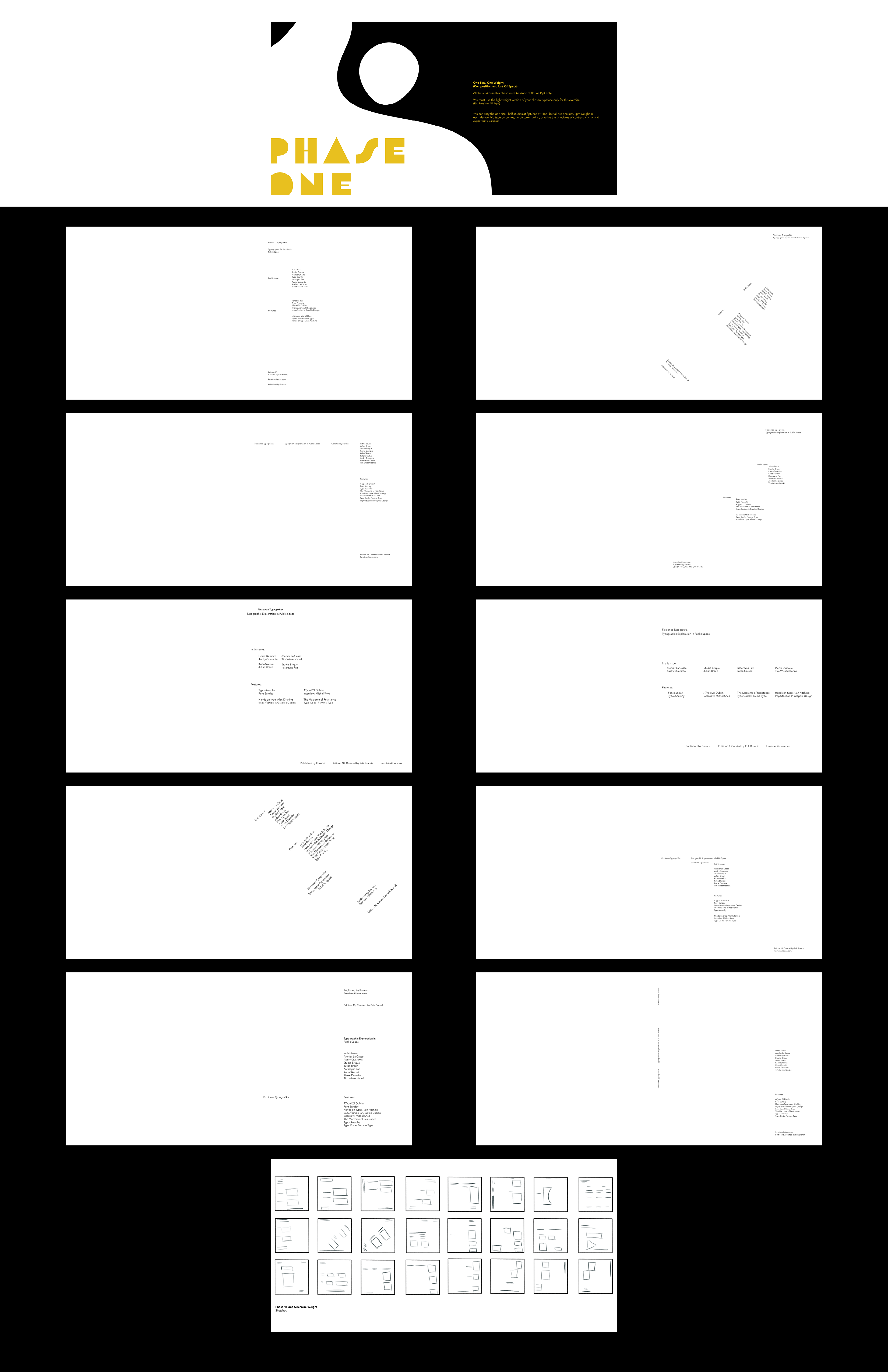 "Typographic Structures in 6 Phases" is a book comprised of 60 type-based exercises that were completed over the course of 8 weeks. Each set of studies had its own parameters to follow, which are described on the dividing pages at the beginning of each section. Phases 1-4 are based on Erik Brandt's "Ficciones Typografika" project, and phases 5-6 are based on Neville Brody and Jon Wozencroft's "Fuse" typefaces.