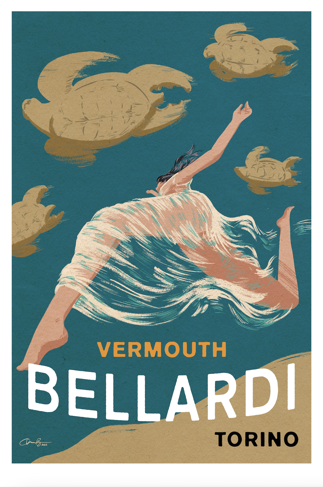 This project involved the creation of a piece of art that was meant to represent someone, or something. Inspired by my mother's love of the ocean, I decided to create a piece honoring 'mother Earth.' This poster was inspired by vintage alcohol posters and artists like Dudovich, and features a dynamic figure jumping into a sky filled with turtles. The type was created to mimic that of a real vintage Vermouth poster.