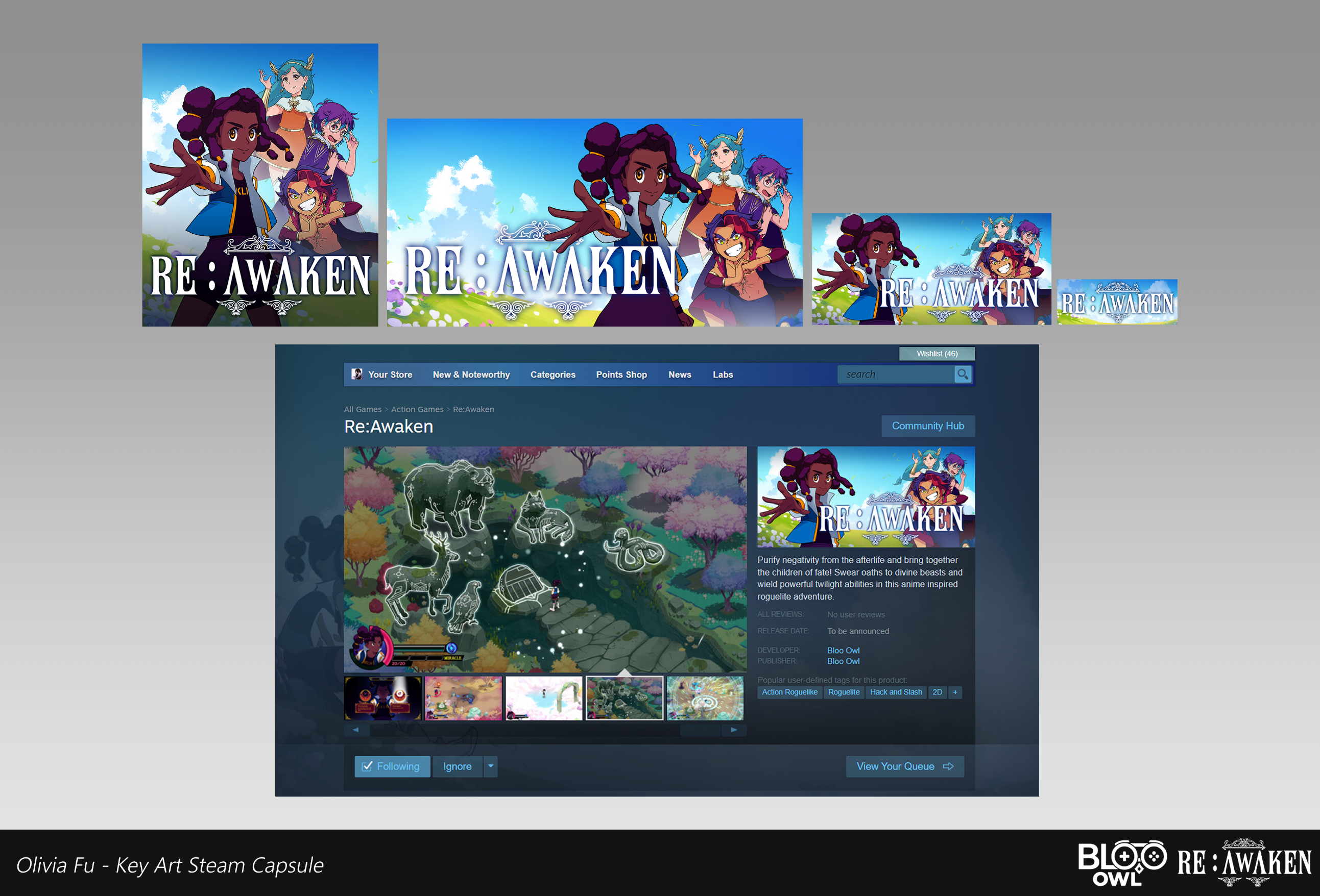 (FREELANCE) Work made at Bloo Owl Studios as a game artist on Re:Awaken, mainly focusing on comic-styled cutscene illustrations and character art. "Purify negativity from the afterlife and bring together the children of fate! Swear oaths to divine beasts and wield powerful twilight abilities in this anime inspired roguelite adventure."
