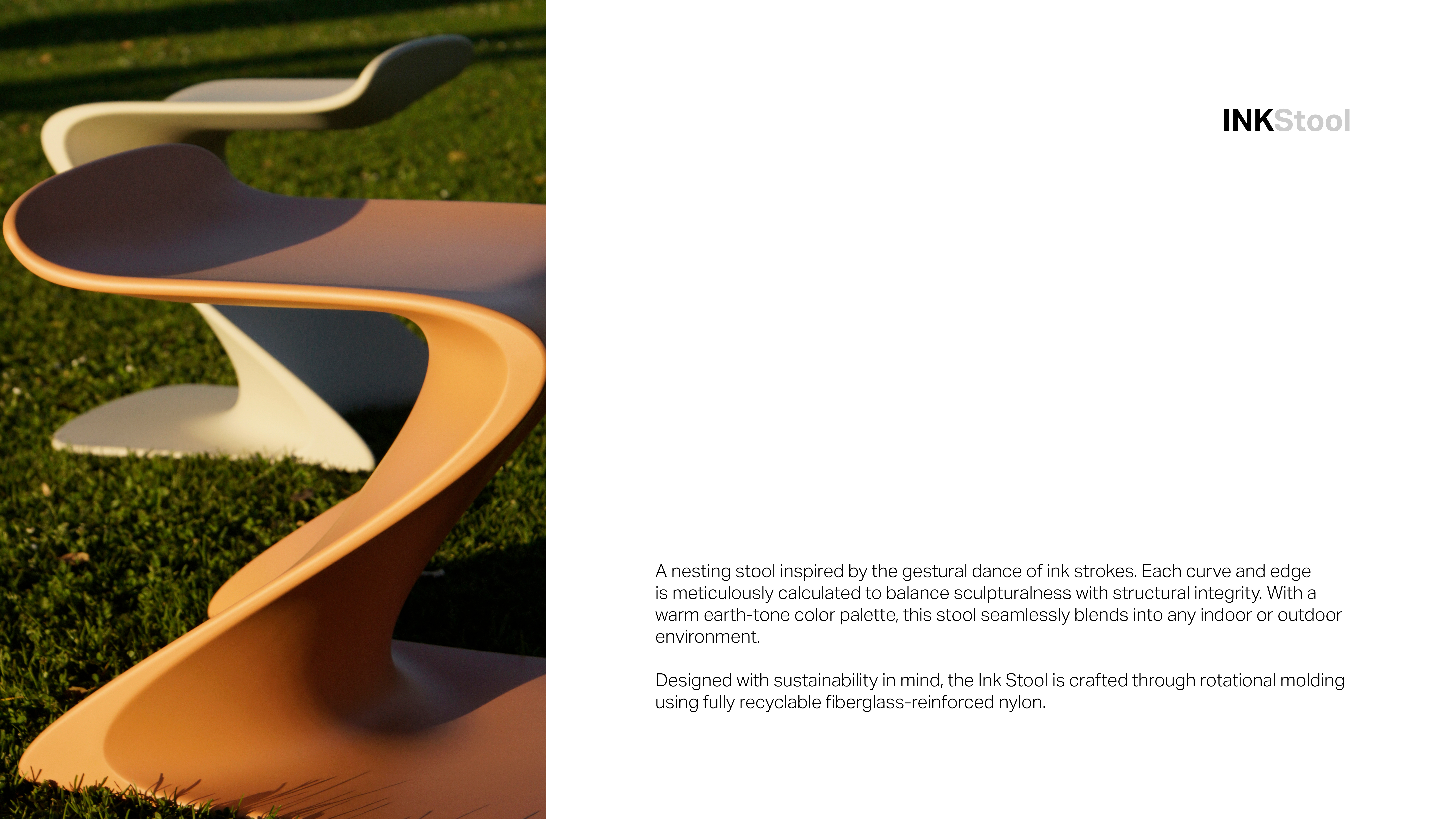 A nesting stool inspired by the gestural dance of ink strokes. Each curve and edge is meticulously calculated to balance sculpturalness with structural integrity. With a warm earth-tone color palette, this stool seamlessly blends into any indoor or outdoor environment. Designed with sustainability in mind, the Ink Stool is crafted through rotational molding using fully recyclable fiberglass-reinforced nylon.