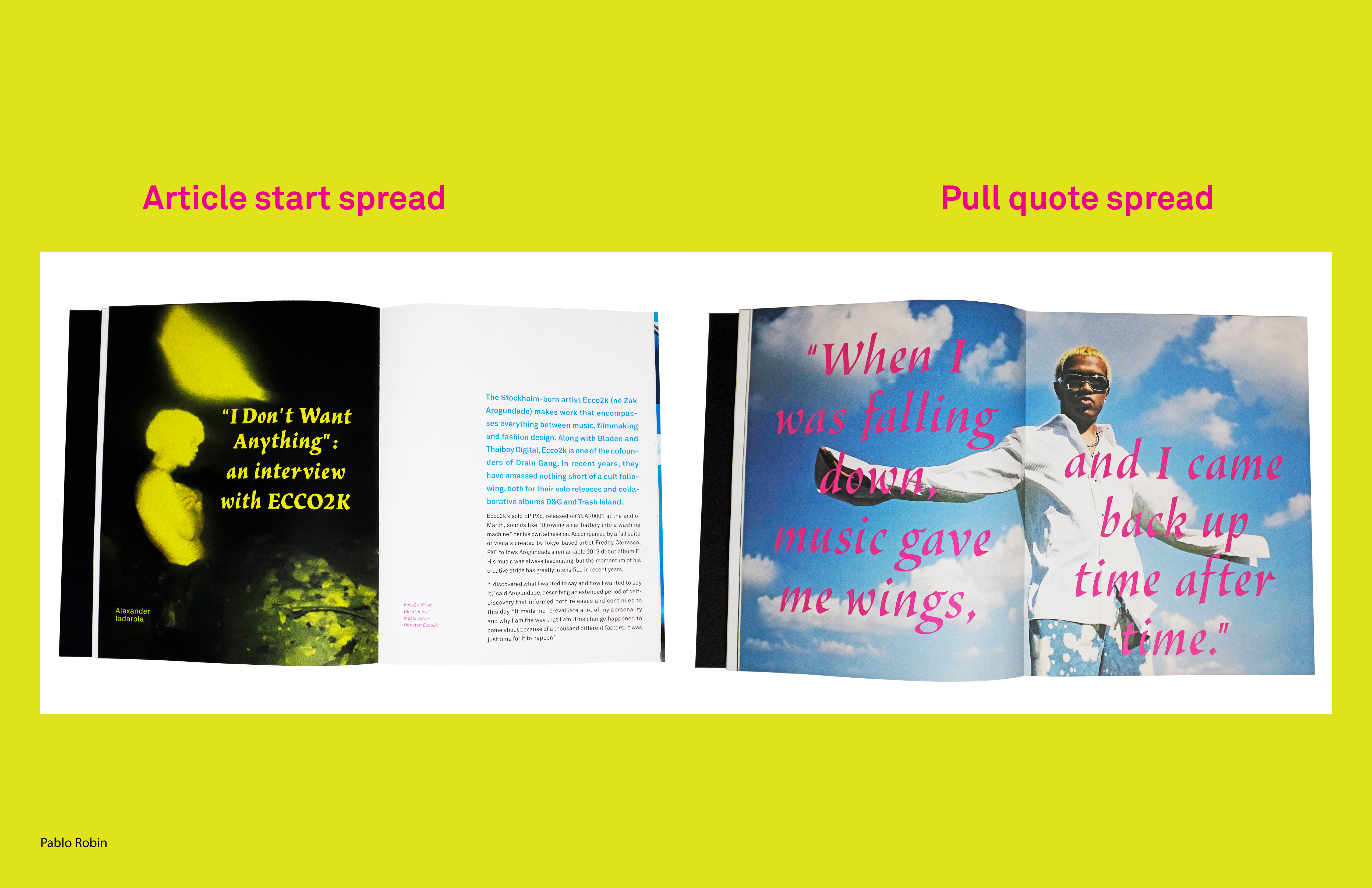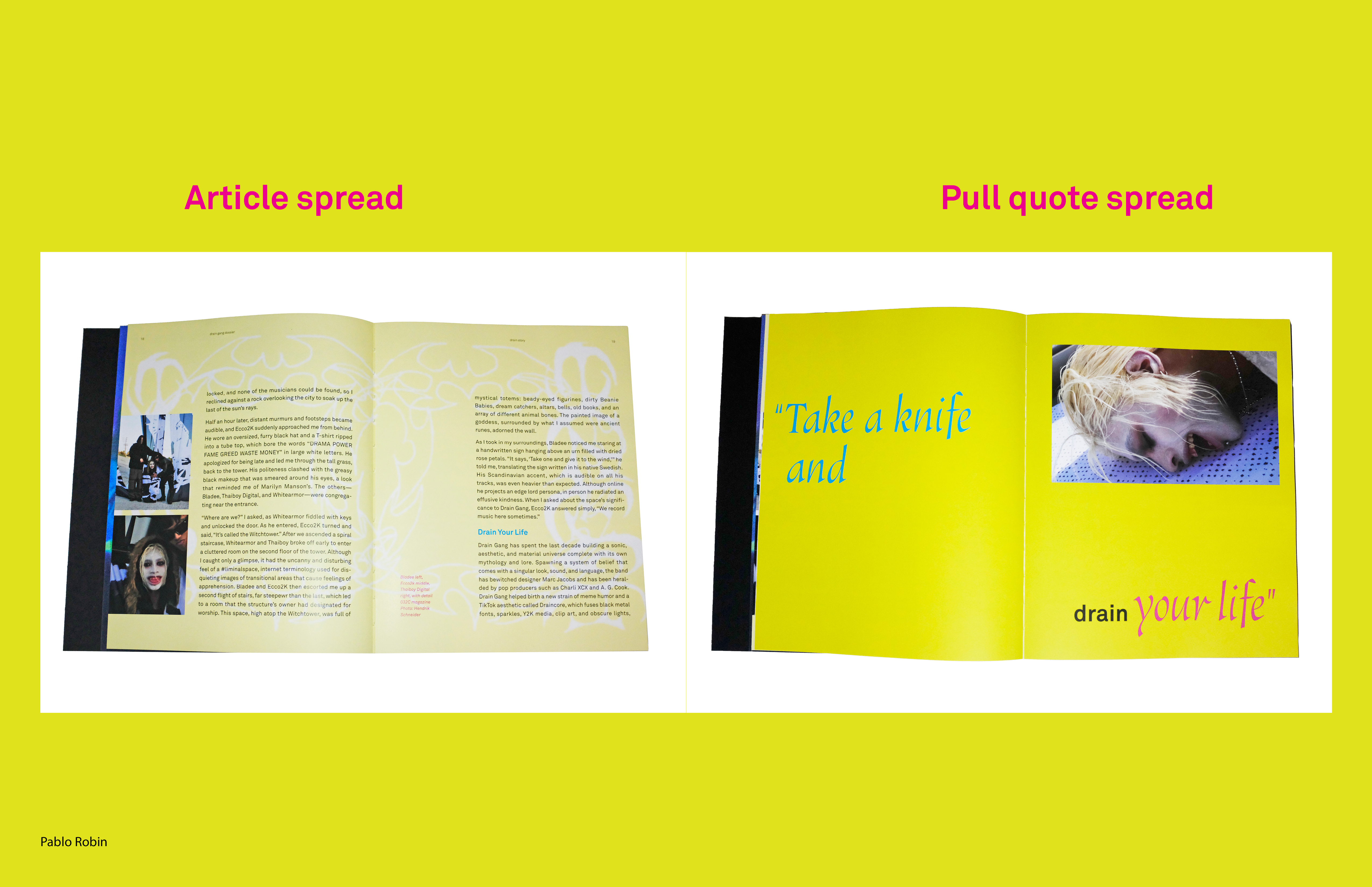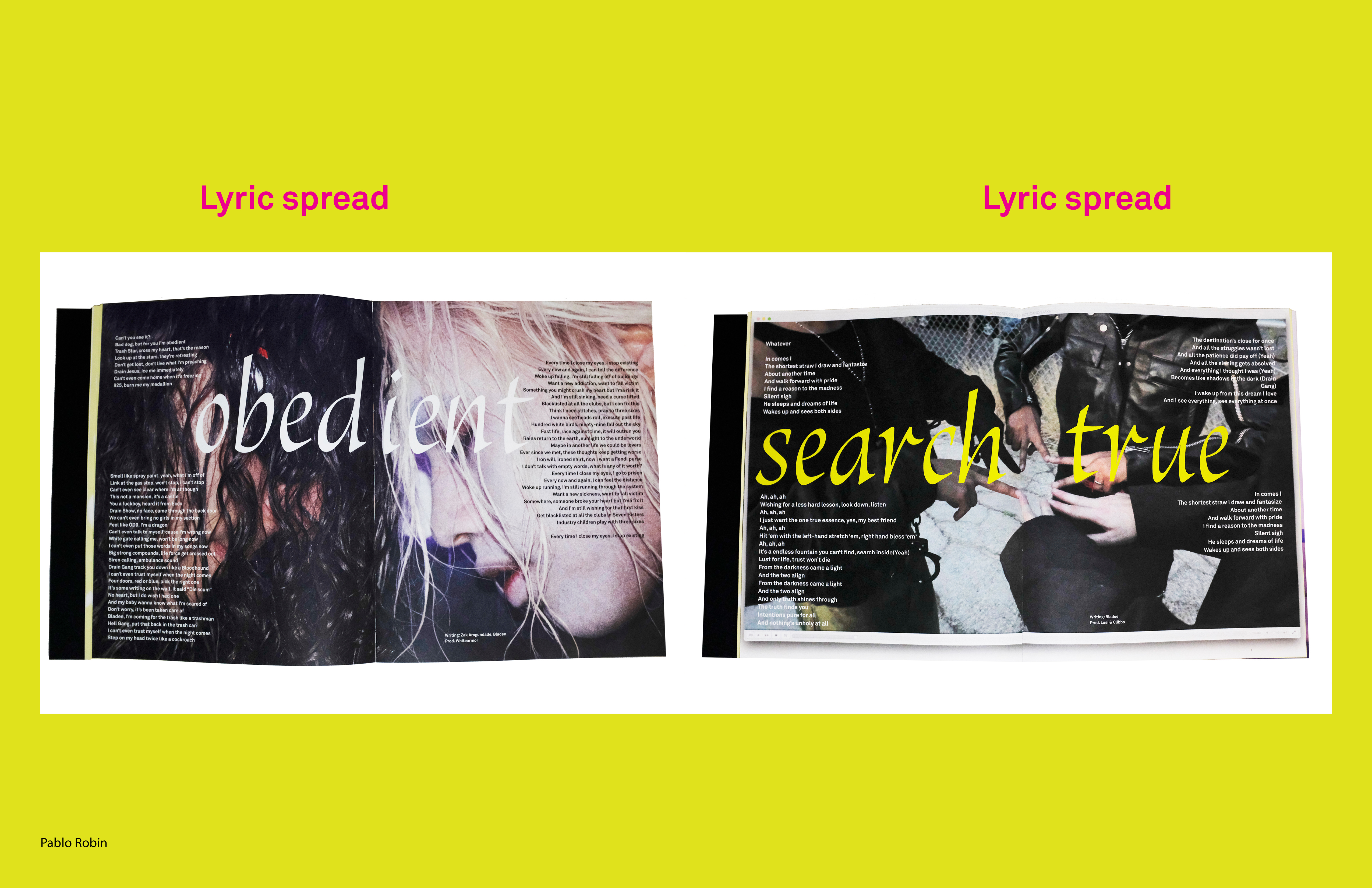 My designs in the book are inspired by the aesthetic of the Drain gang, which is a multi-racial group of Swedish rappers who rap in English with a heavily auto-tuned style. The book brings together a lot of content from Drain Gang that gives the audience context into how their aesthetic influences their music and vice versa.