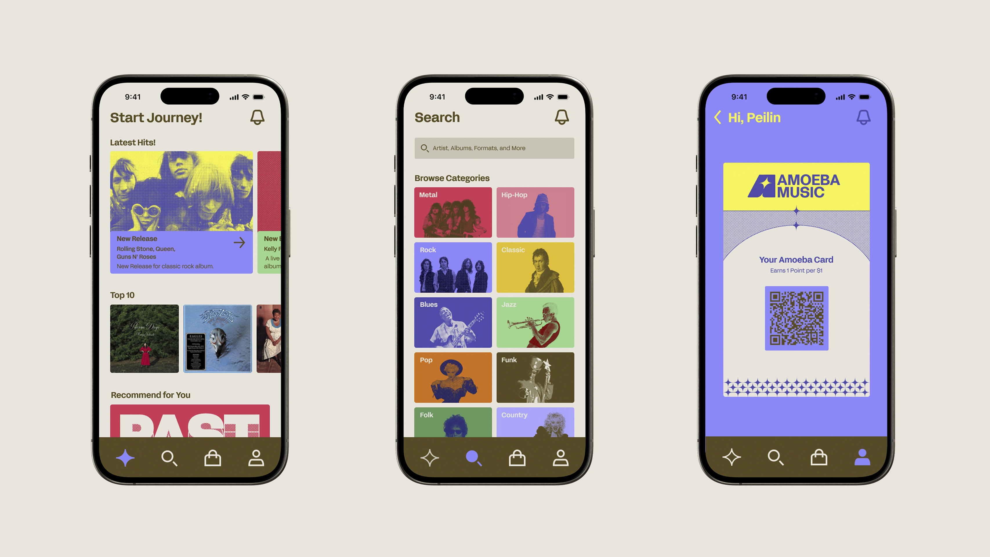 As a designer and illustrator, I aimed to infuse the UX/UI experience with the expressive energy of Amoeba Music’s personality. My goal was to create a system that extends beyond the physical record store, making it accessible to a global, multigenerational audience.