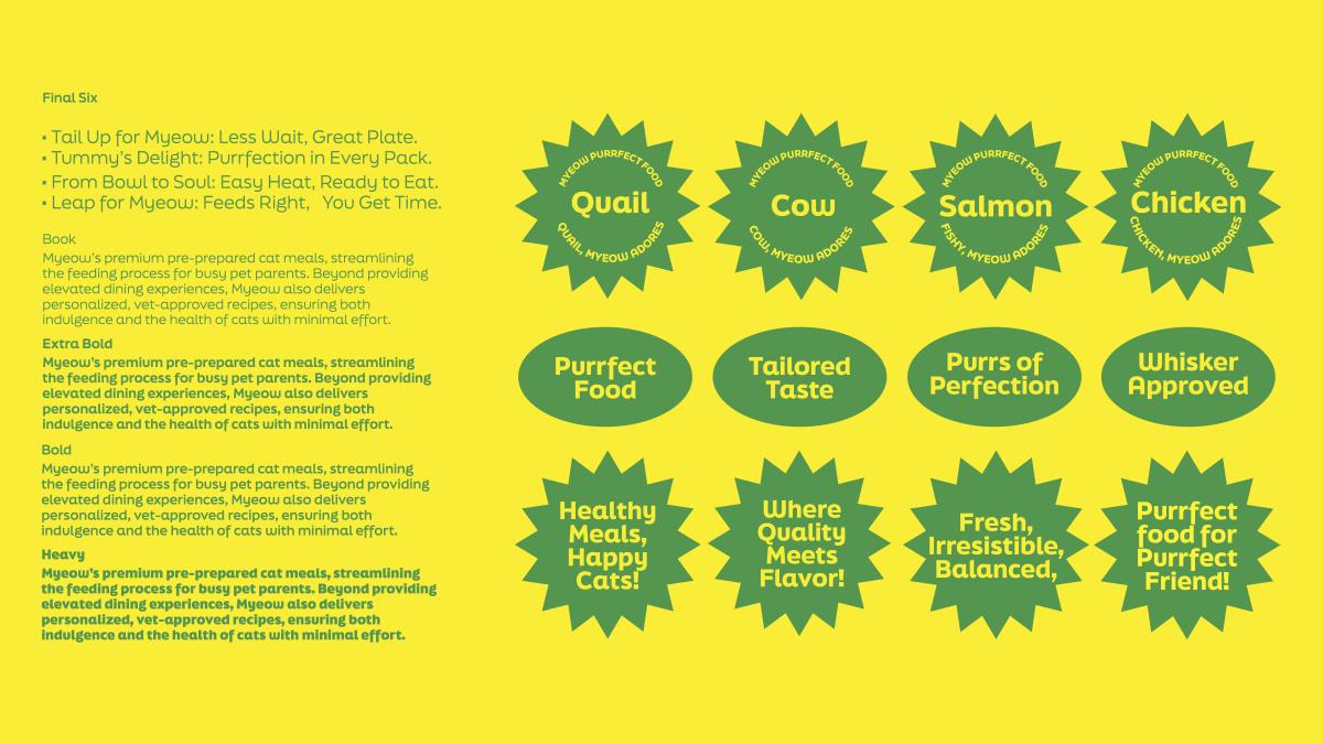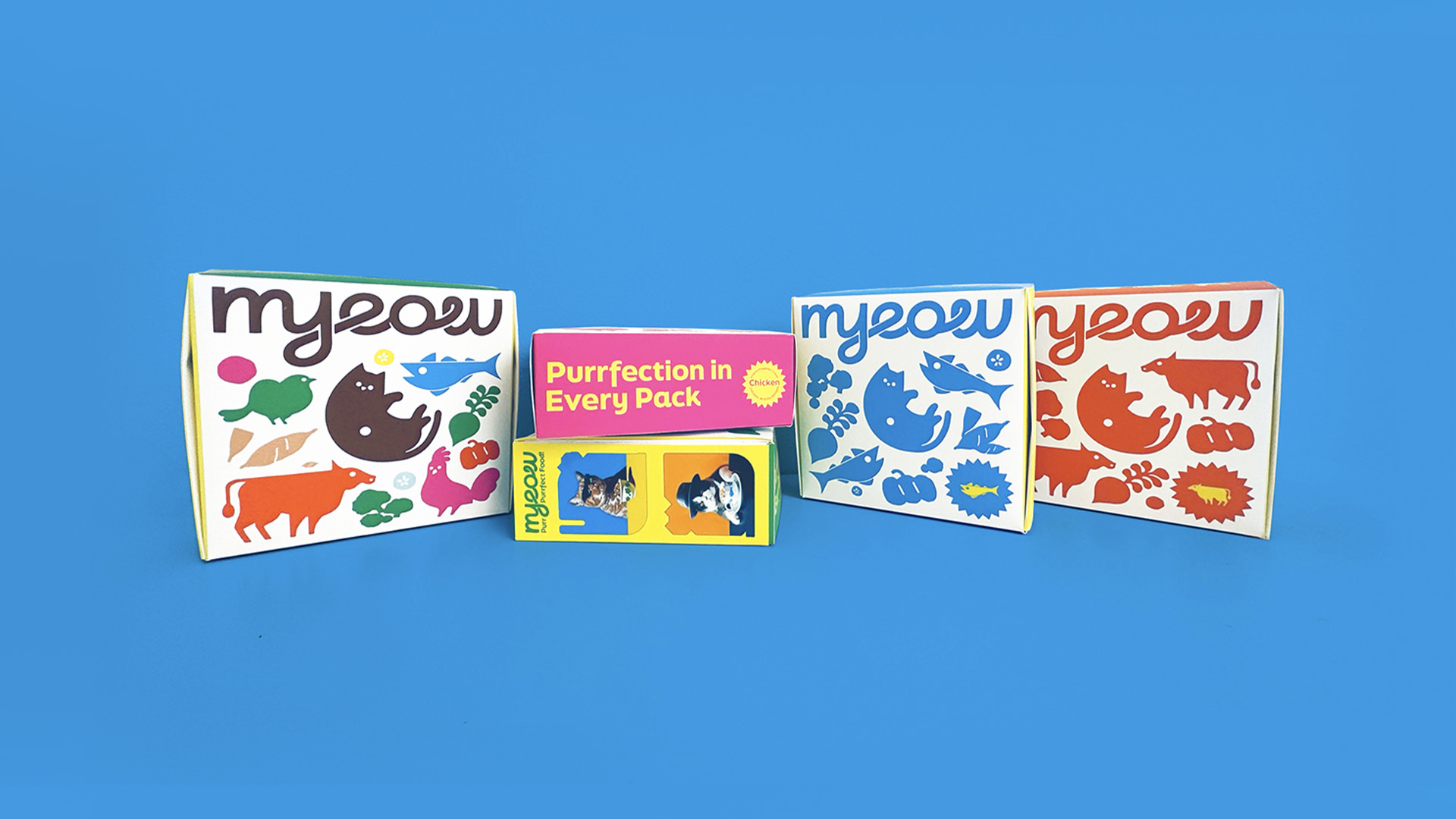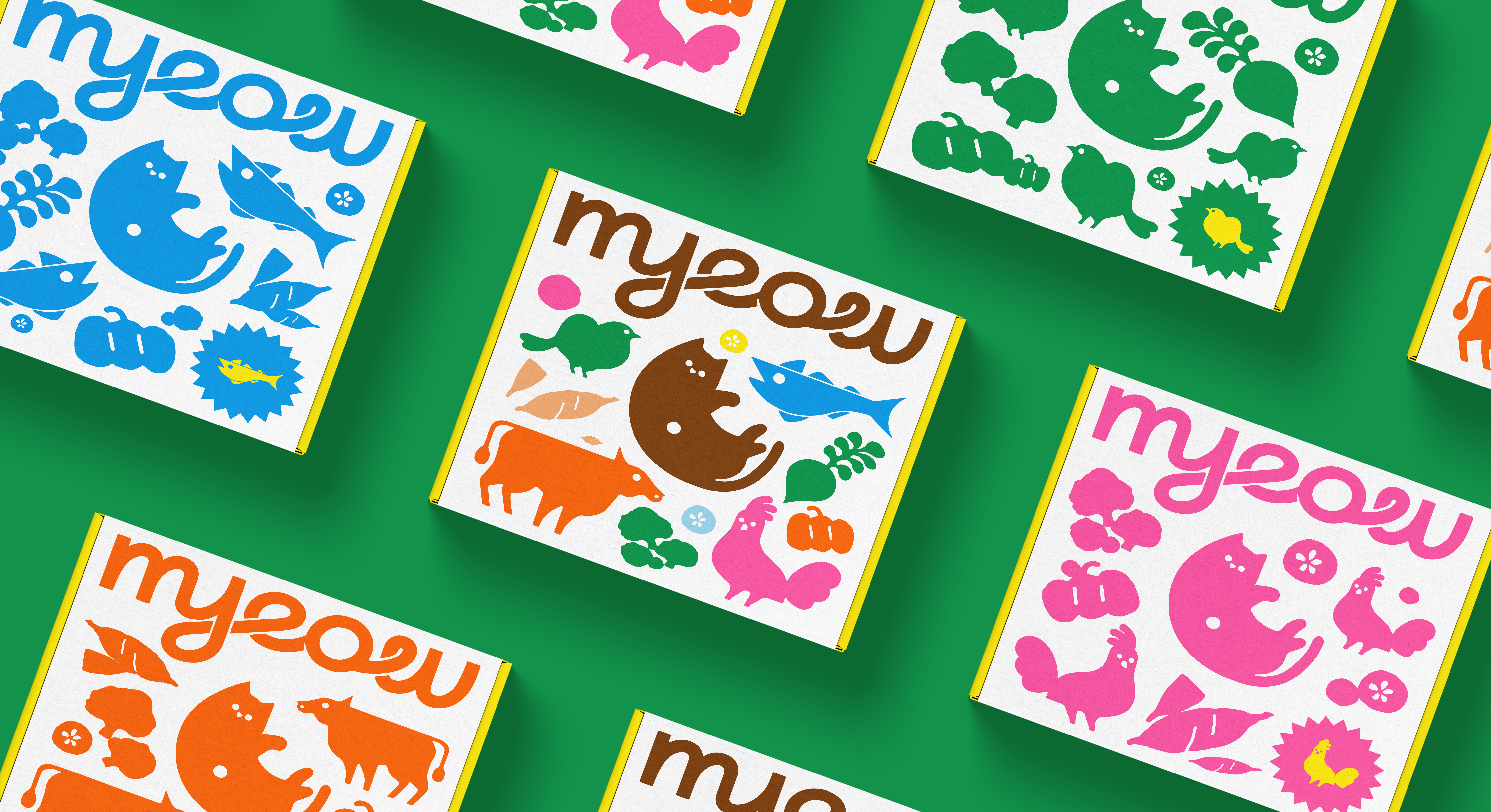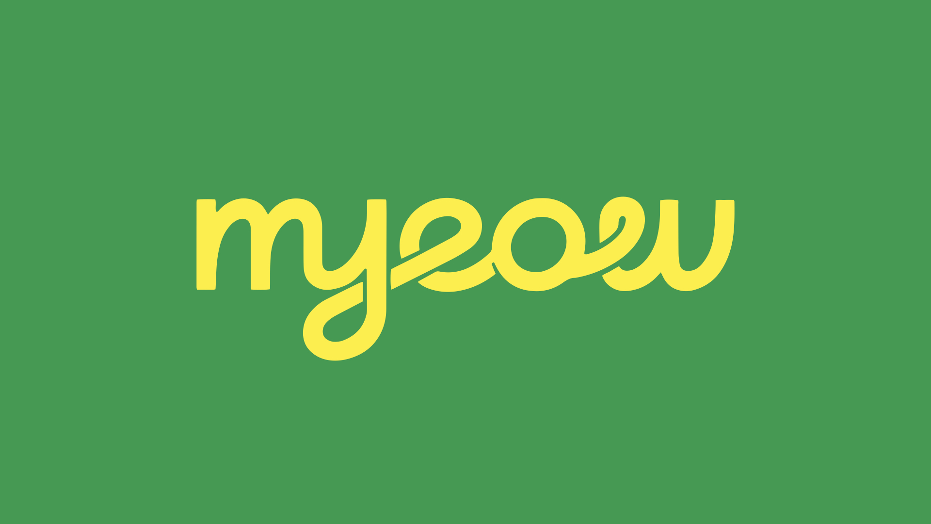 Myeow can be split into ‘my’ and ‘eow,’ which is like ‘my’ in cat language. The upward lines and loops in the logo are designed to evoke the feeling of a cat leaping.