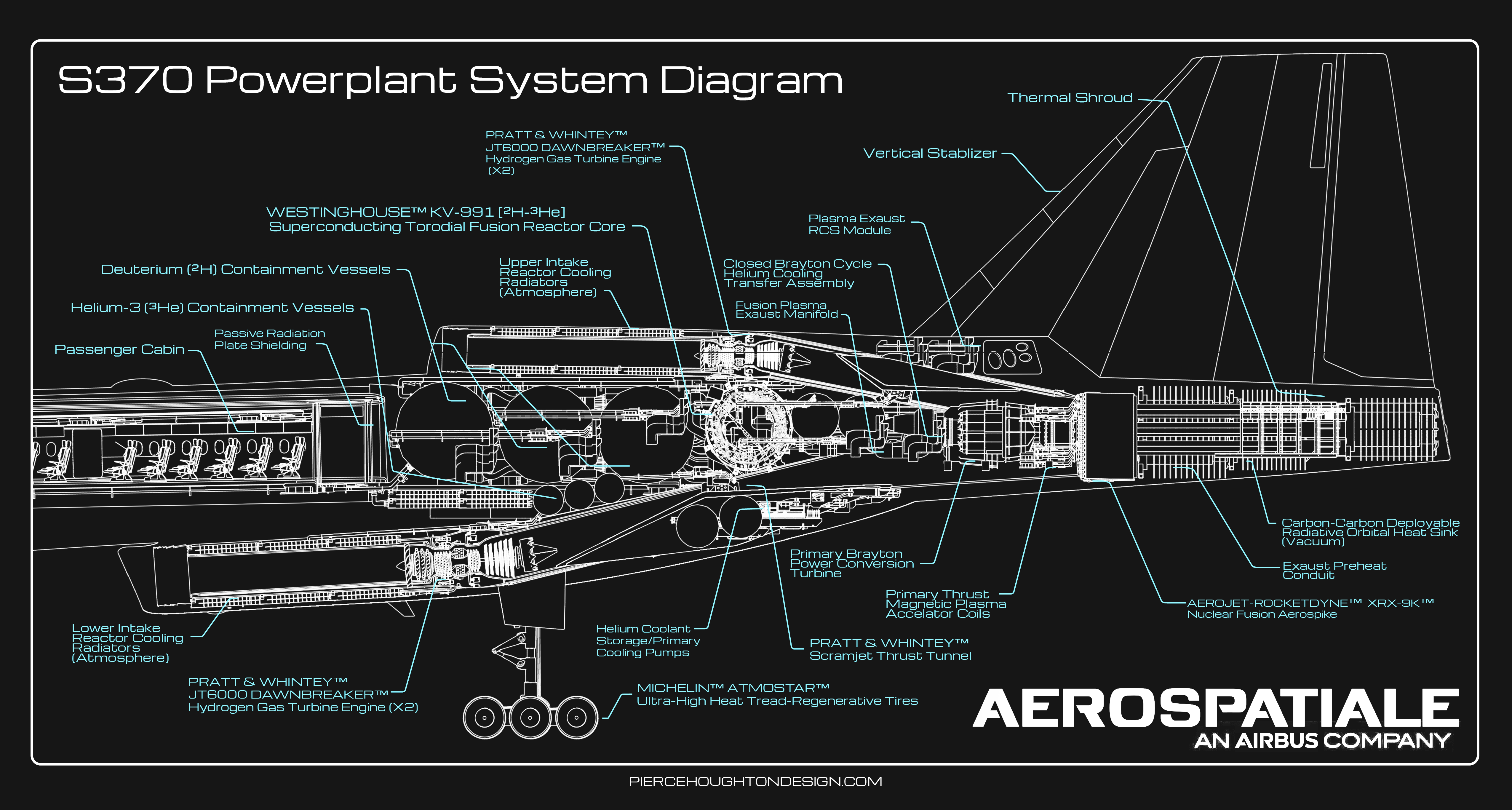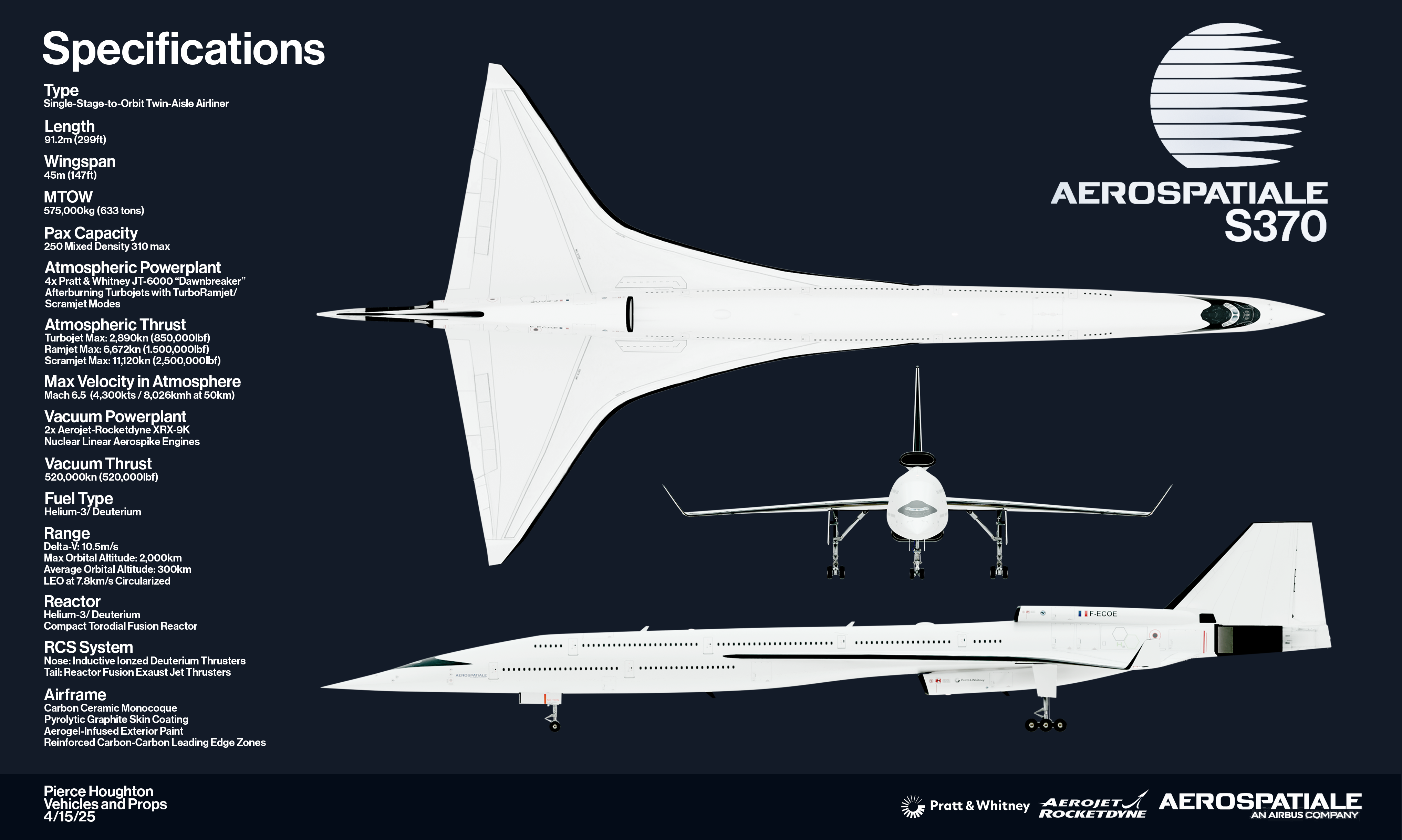 A SSTO (Single-Stage-To-Orbit) nuclear spaceplane, the Aerospatiale S370 is a dive into what the future of commercial space travel may look like in the late 21st century.