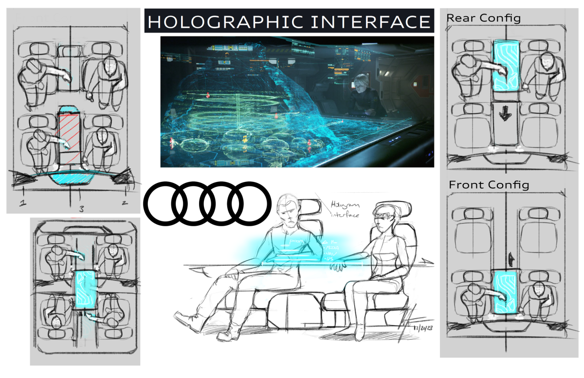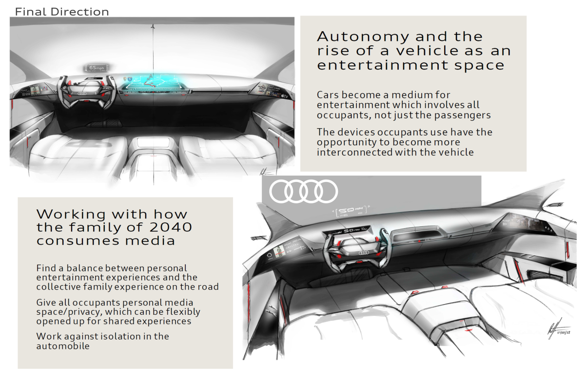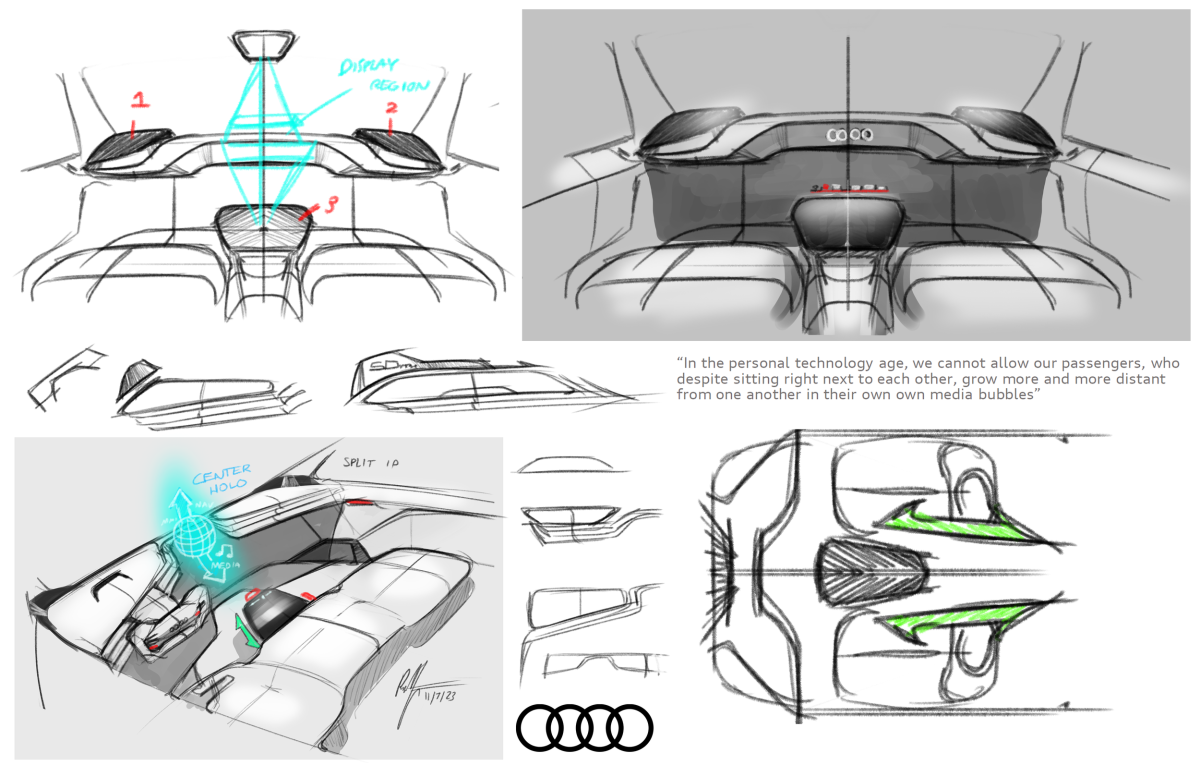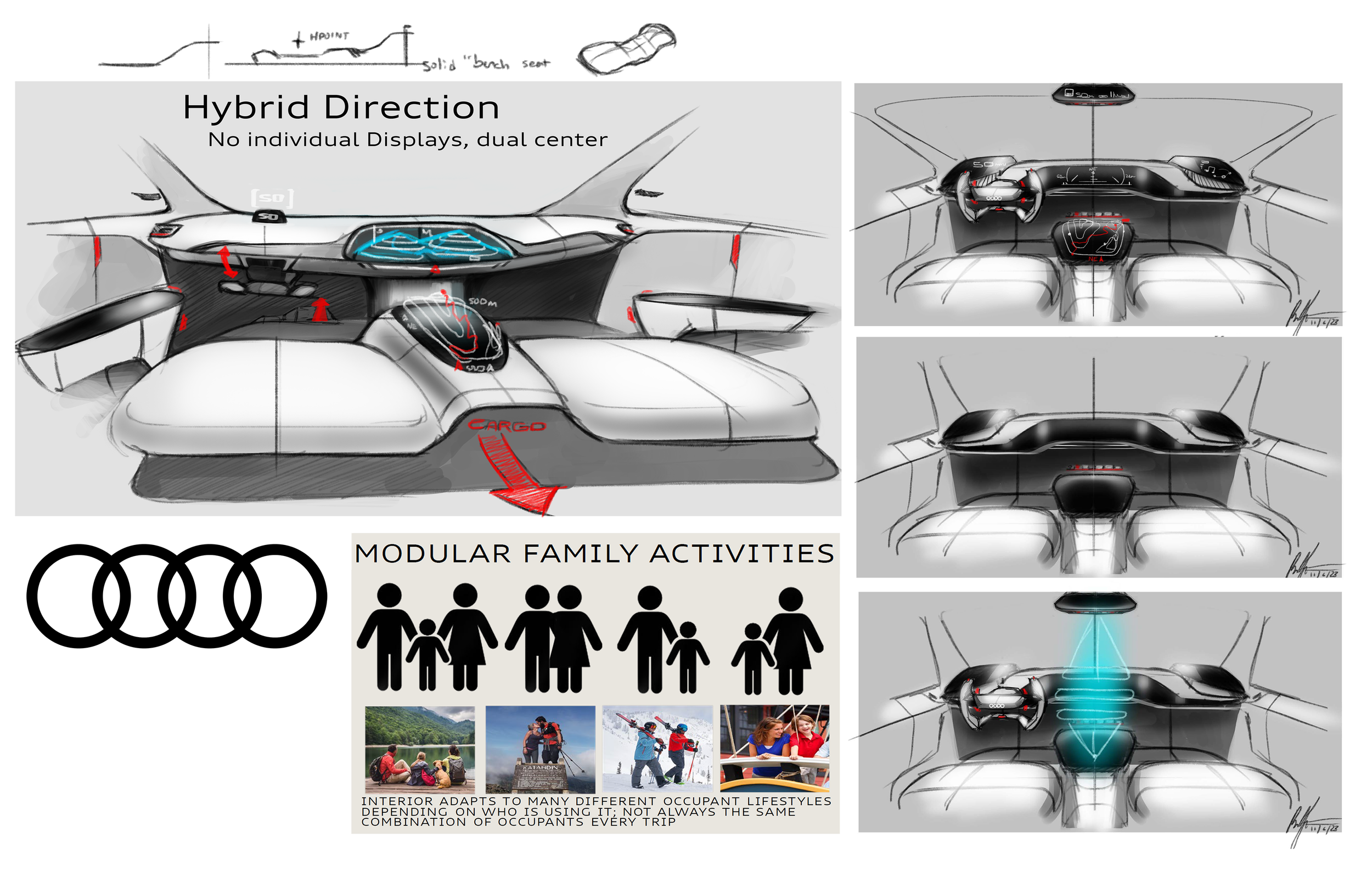 A family adventure vehicle for the North American market, this ArtCenter 5th term interior project works to create a functional Audi interior ready for the digital headspace of 2040. Designed to tackle the growing personal isolation coming in an increasingly digitized world, the Adventure America Interior concept is designed to balance personal media interactions, with a collective familial one.