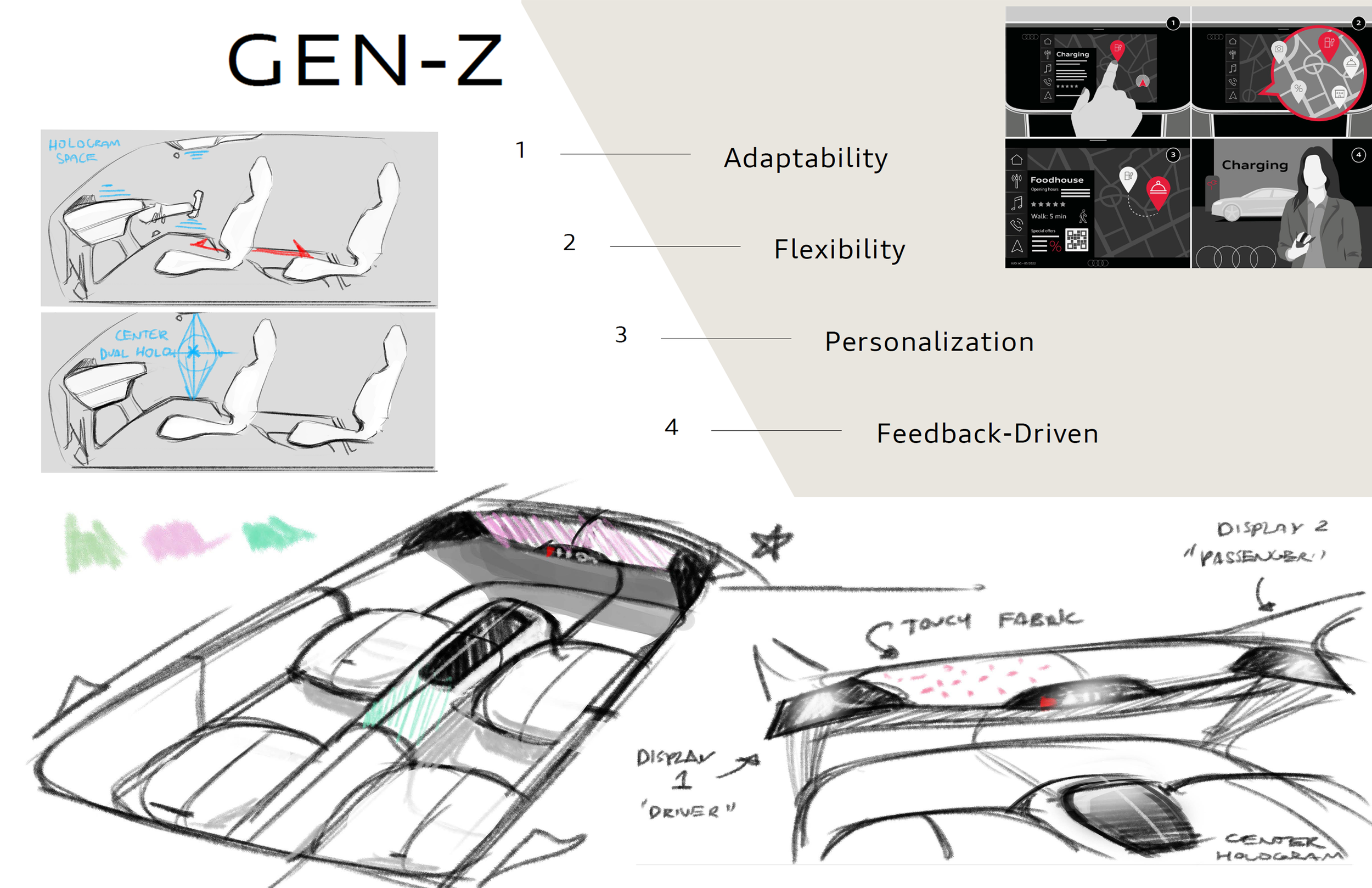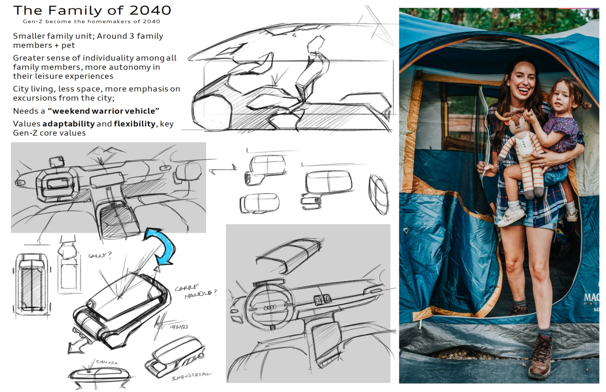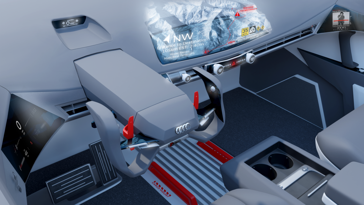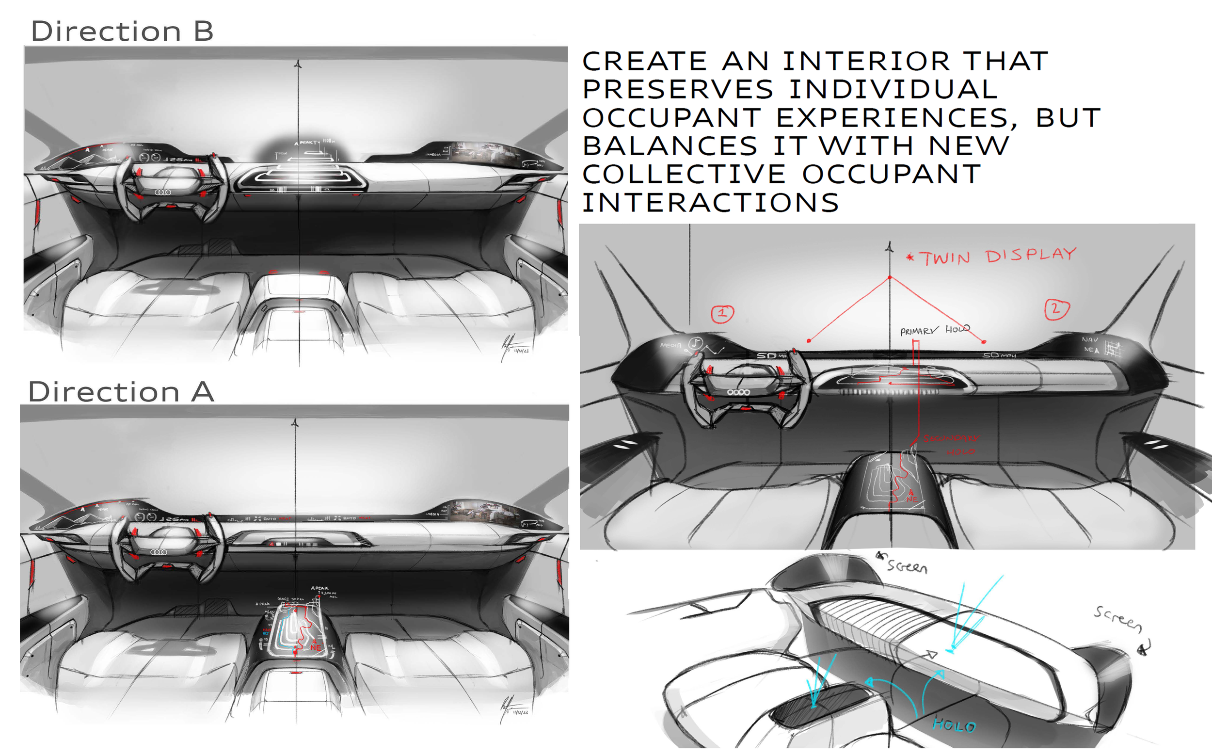 A family adventure vehicle for the North American market, this ArtCenter 5th term interior project works to create a functional Audi interior ready for the digital headspace of 2040. Designed to tackle the growing personal isolation coming in an increasingly digitized world, the Adventure America Interior concept is designed to balance personal media interactions, with a collective familial one.