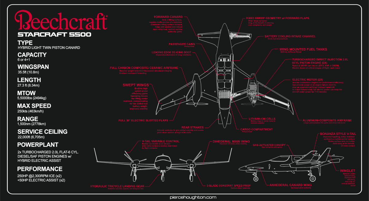 Developed independently from my official studies at ArtCenter, the Starcraft was designed as a spiritual successor to the revolutionary Beechcraft Starship, building on its successes and learning from its failures; continuing its revolutionary legacy though a new design study which shows what the next evolution of a twin-engine piston aircraft in the general aviation market may look like.