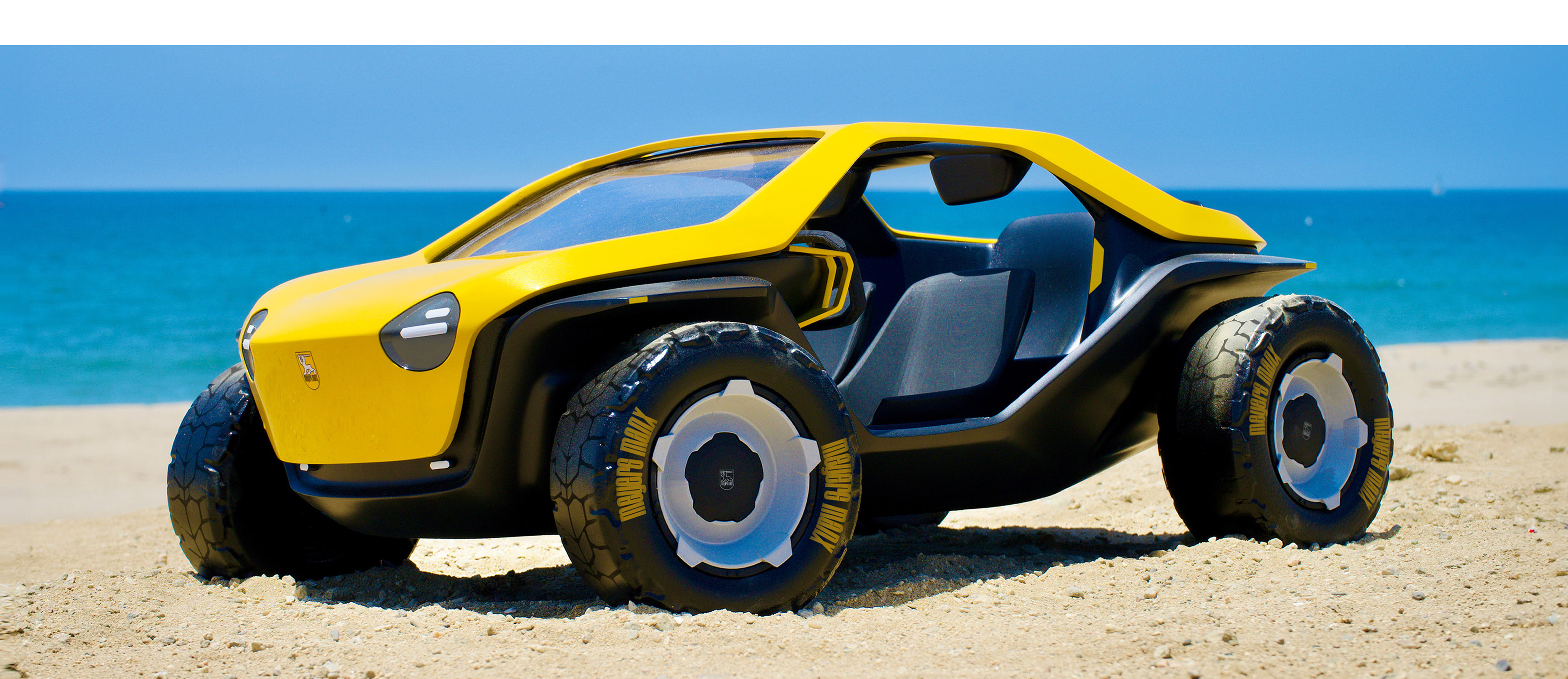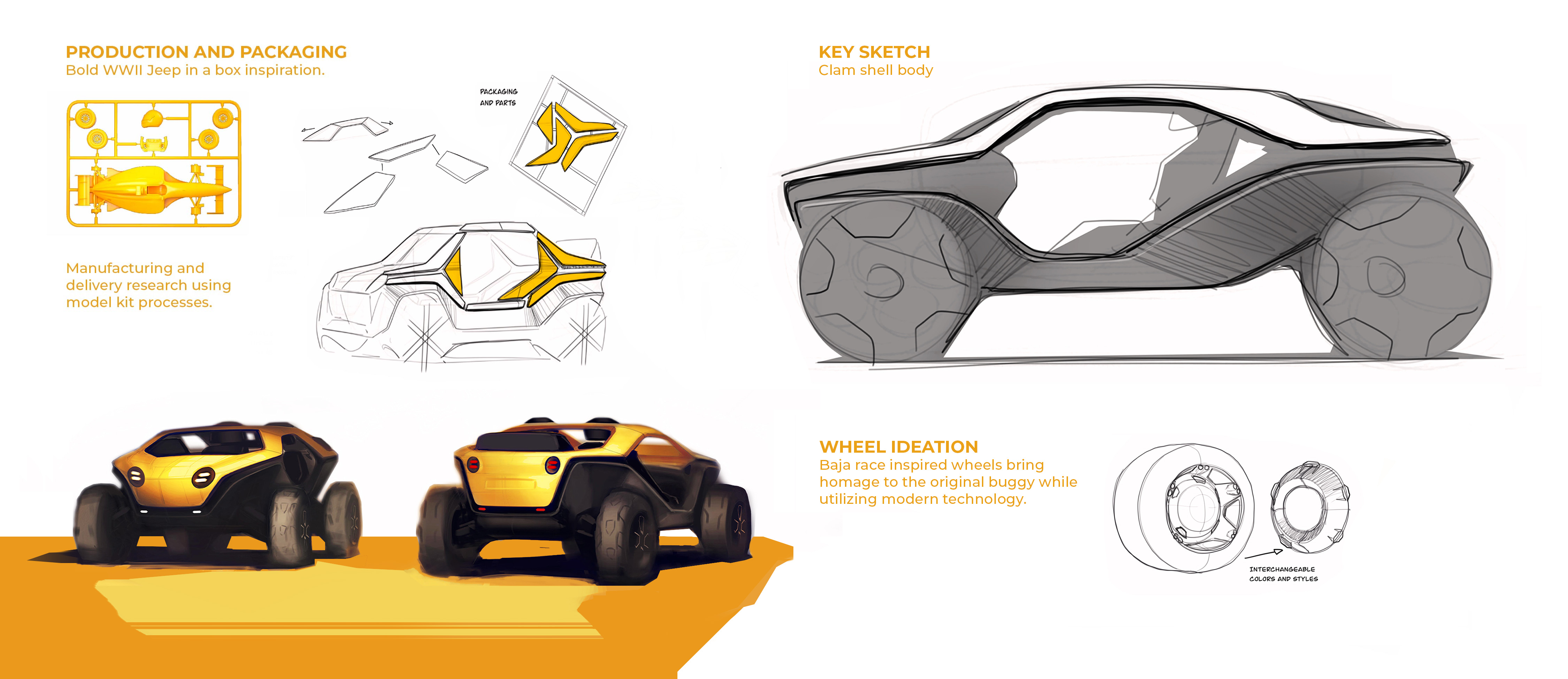 Meyers Manx Sponsored Project. An Icon reimagined! Retaining the same endearing and loving character in a whole new body. Designed with sustainability and modularity at the forefront, for an authentic, first-time car buyer.