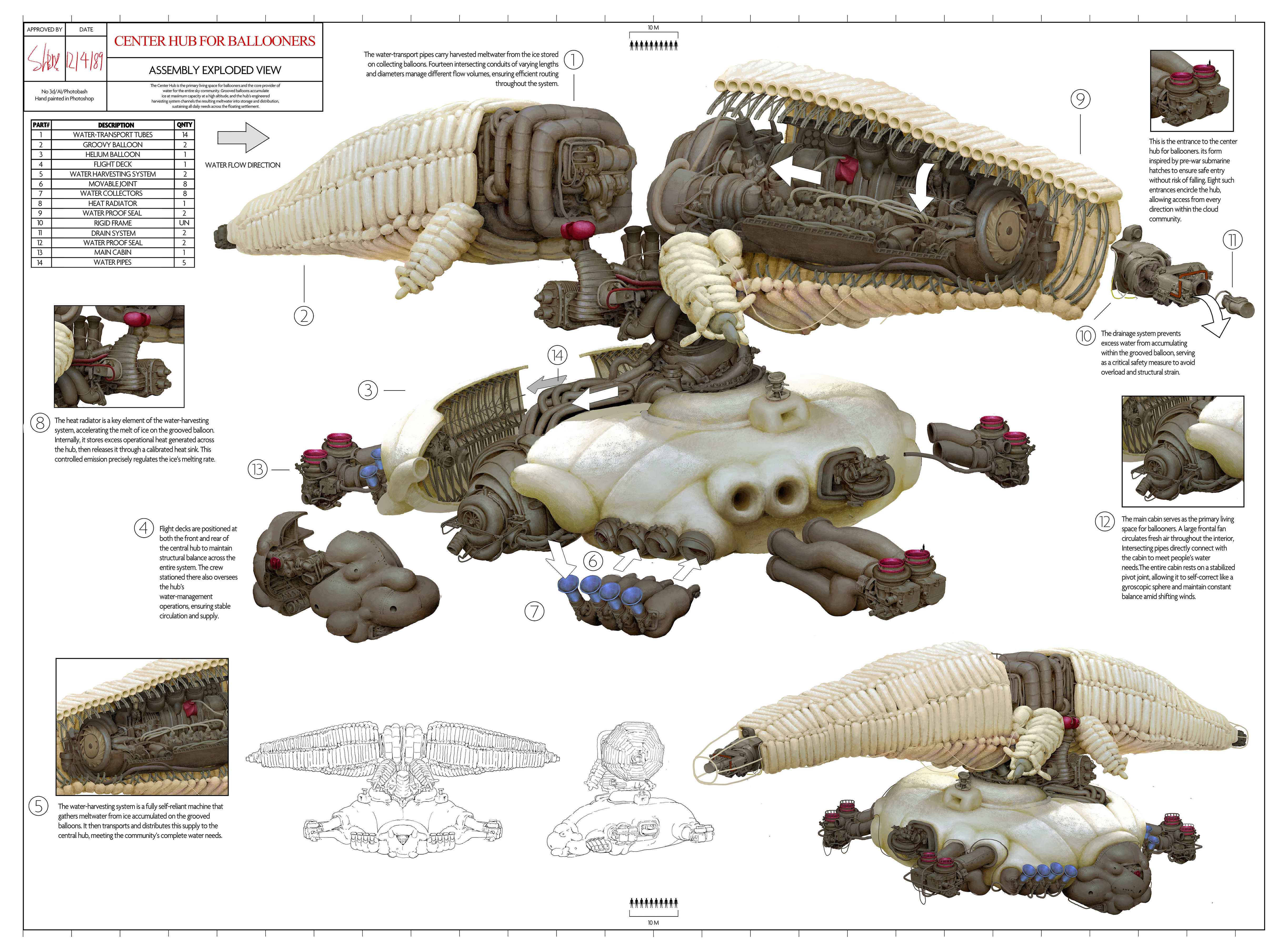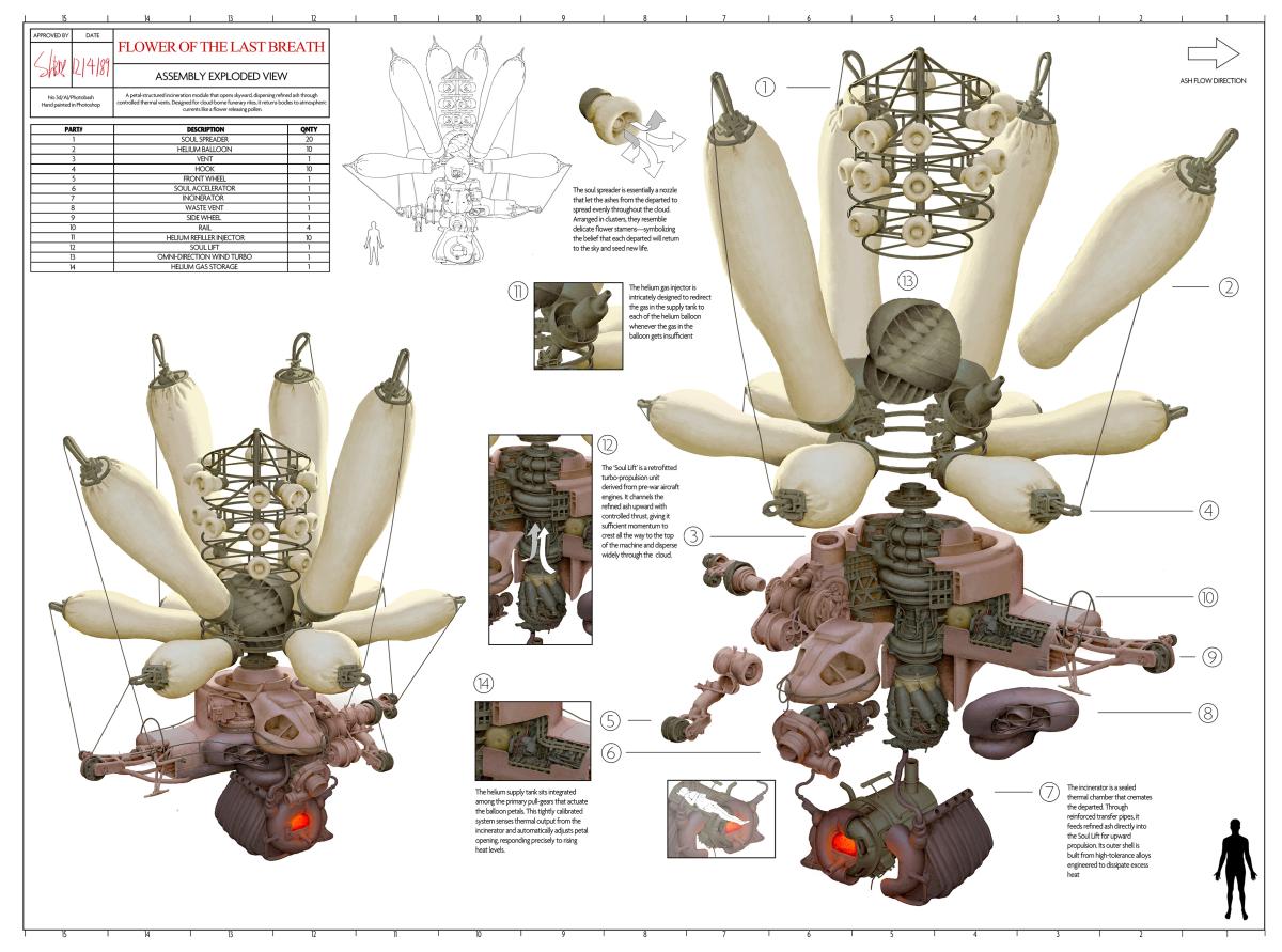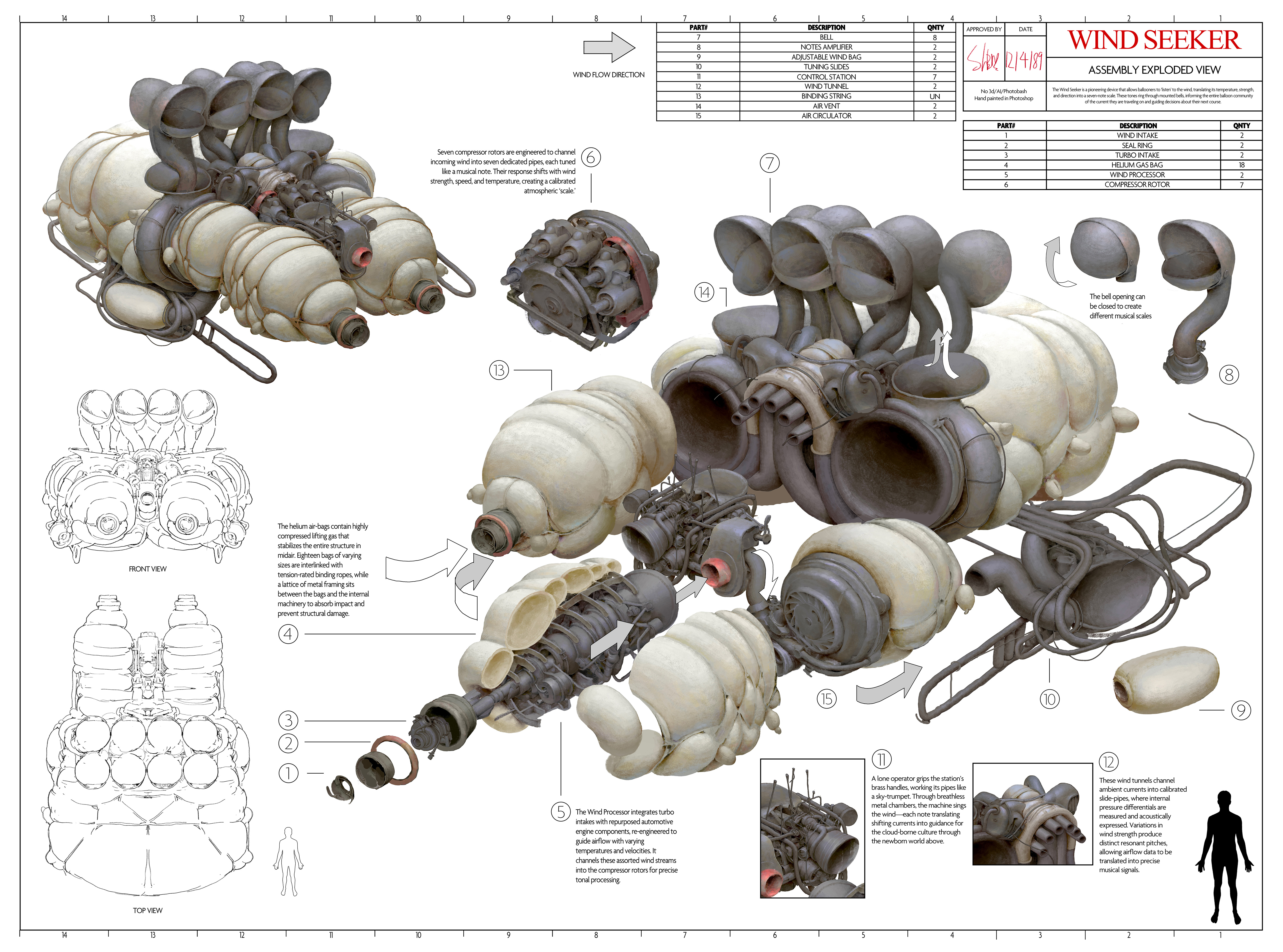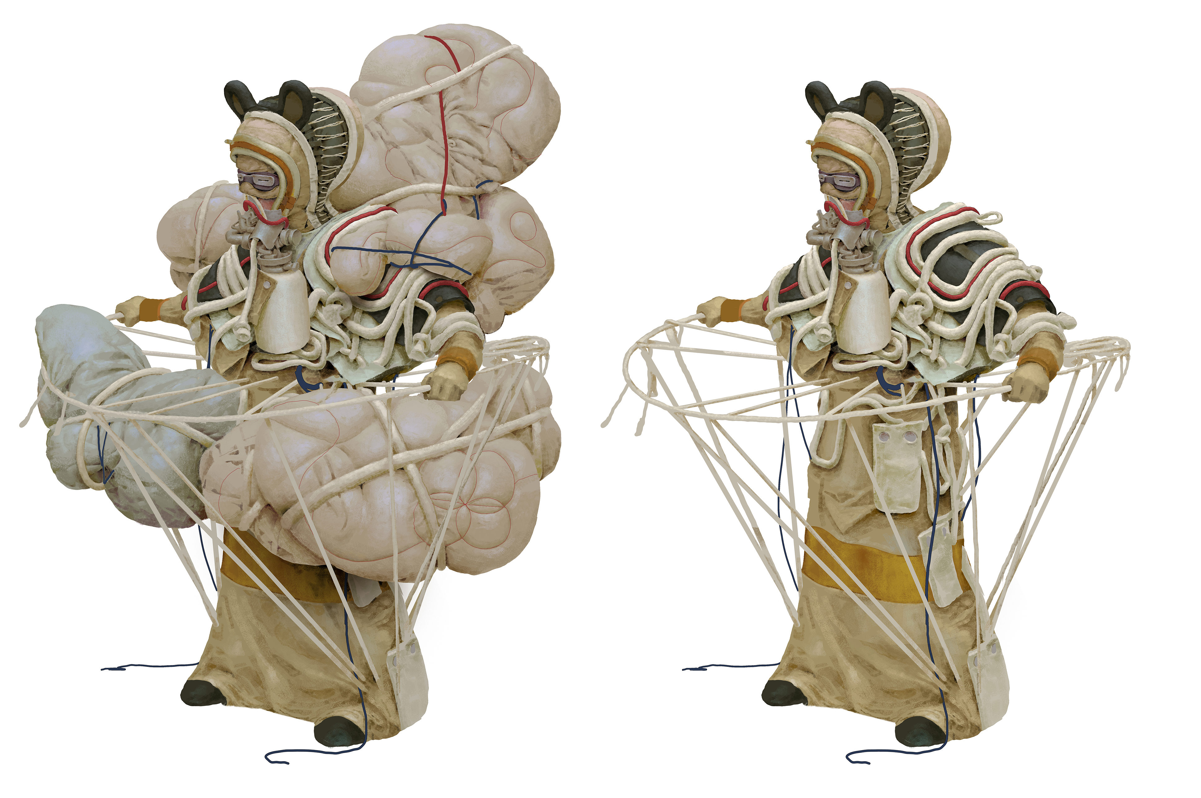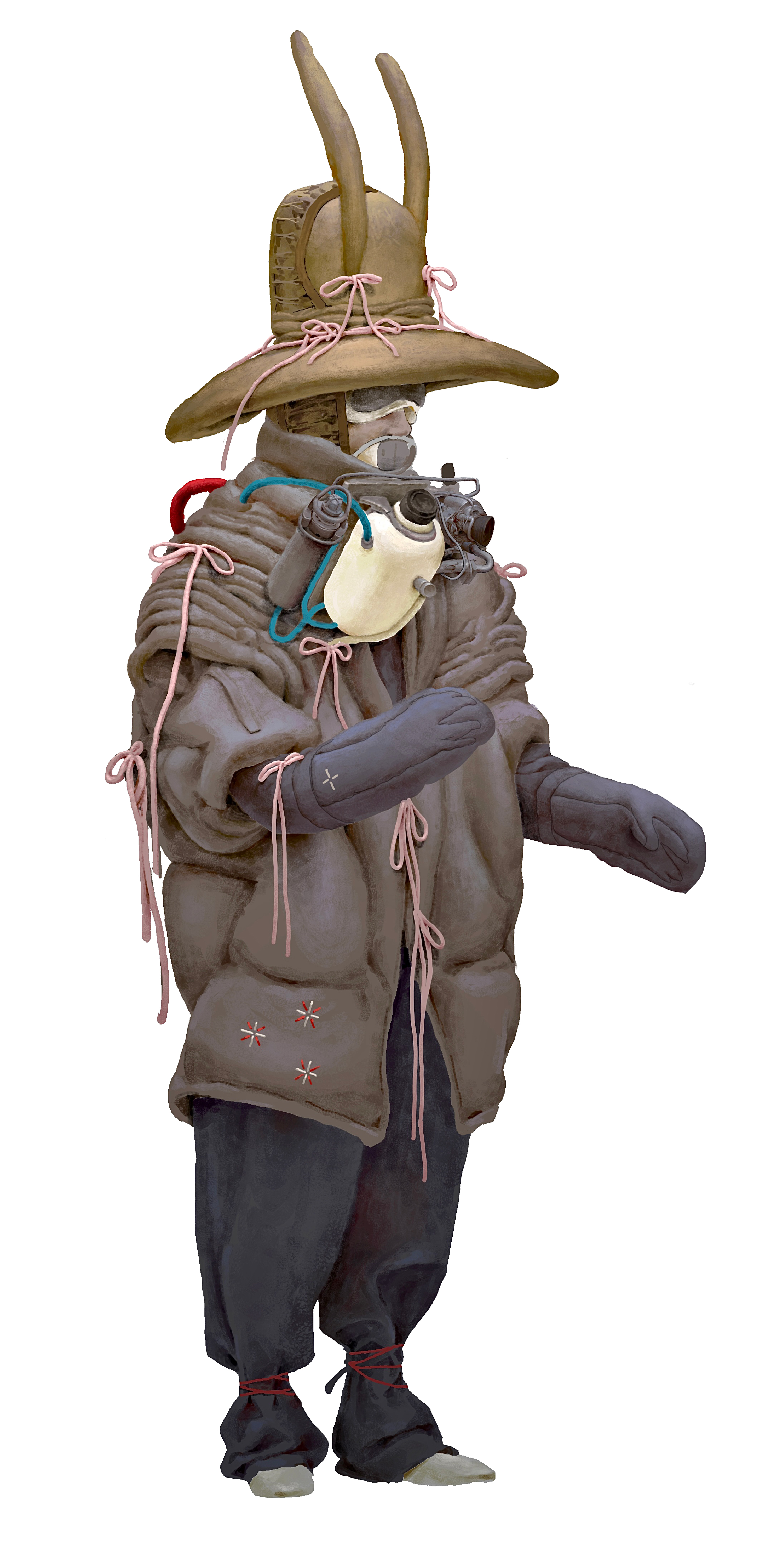 The Wind Pilot is a specialized professional responsible for operating the Wind Seeker and capturing precise atmospheric parameters in real time. Their work takes place outdoors at extreme altitudes, where they endure harsh weather, intense sunlight, and low oxygen levels. Their attire is therefore essential for survival: a thick, insulated hat with a wide brim protects against cold and glare, while a lightweight portable oxygen tank ensures continuous O₂ supply. A set of bow-ties tied on the suit responds to shifting currents, giving the pilot a clear visual reading of wind direction as they navigate the skies.