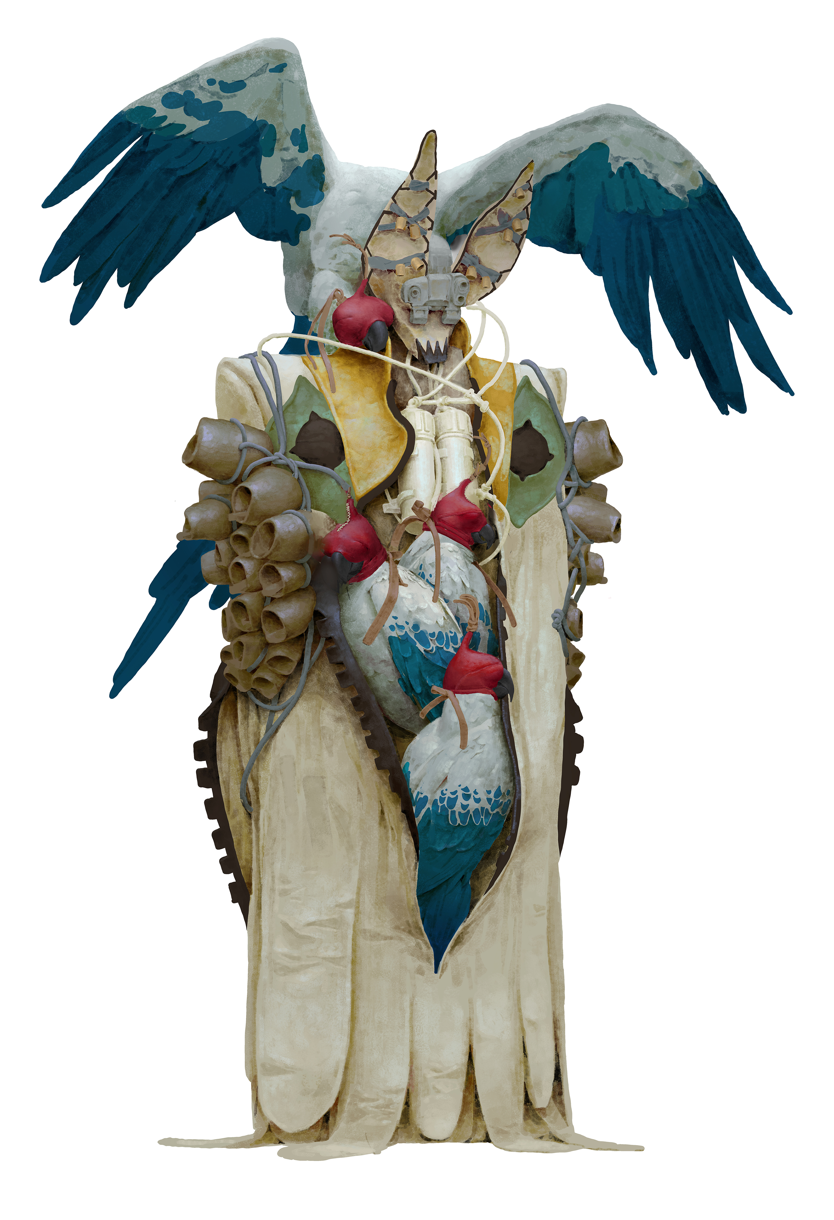 Bird man is an honored profession among balloon community, they are in charger of tele communication between balloons much like the function of telephone in the old world. Each Bird Man trains a flock of parrots capable of memorizing messages and delivering them to neighboring balloons with remarkable precision. Their work is considered both honorable and spiritual, which is reflected in their deliberately avian attire and animalistic masks that help them connect more intuitively with their birds.When recalling their flock, they shake the bells at their side and perform a ritualistic dance, their gown sweeping like wings to summon the parrots home.