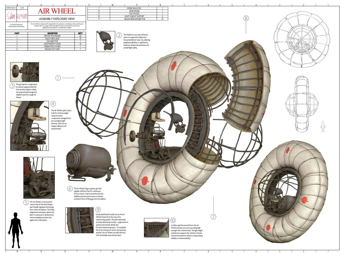 The Balloon Tailor is the community’s essential repair specialist, responsible for mending damage to the fabric of balloon vehicles. To increase their carrying capacity, they wear a mobile rack structure that moves with them as they walk, allowing them to transport large rolls of replacement fabric. Thick white binding cords hang from their suit, ready for securing repaired sections. Because their work is performed outdoors at high altitudes, they are equipped with snow goggles for glare protection and a portable oxygen tank to ensure safe breathing in thin air.