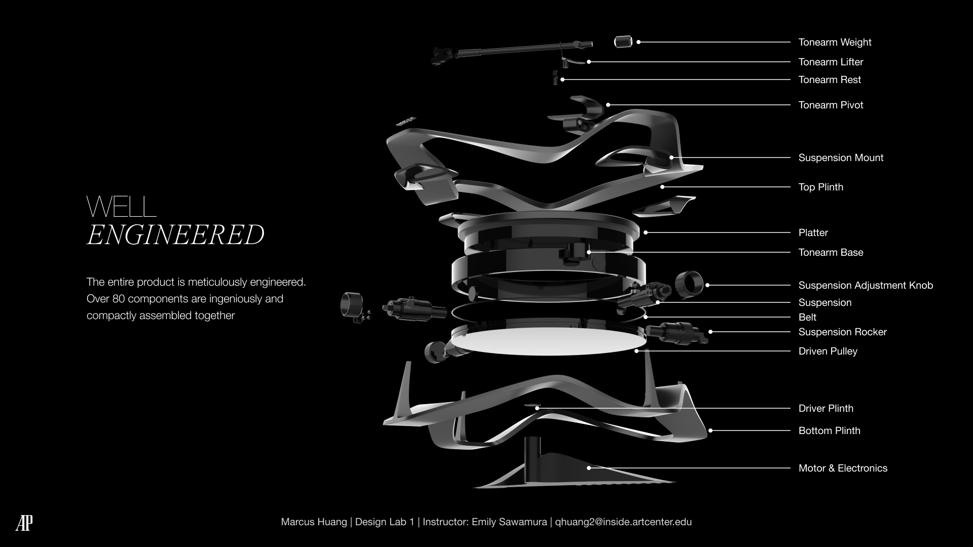 A sleek, thin-profile turntable, mirroring the elegance of an Audemars Piguet watch. Innovatively designed with a Formula 1-inspired suspension system, ensuring that its stunning appearance is matched by unparalleled sound quality.