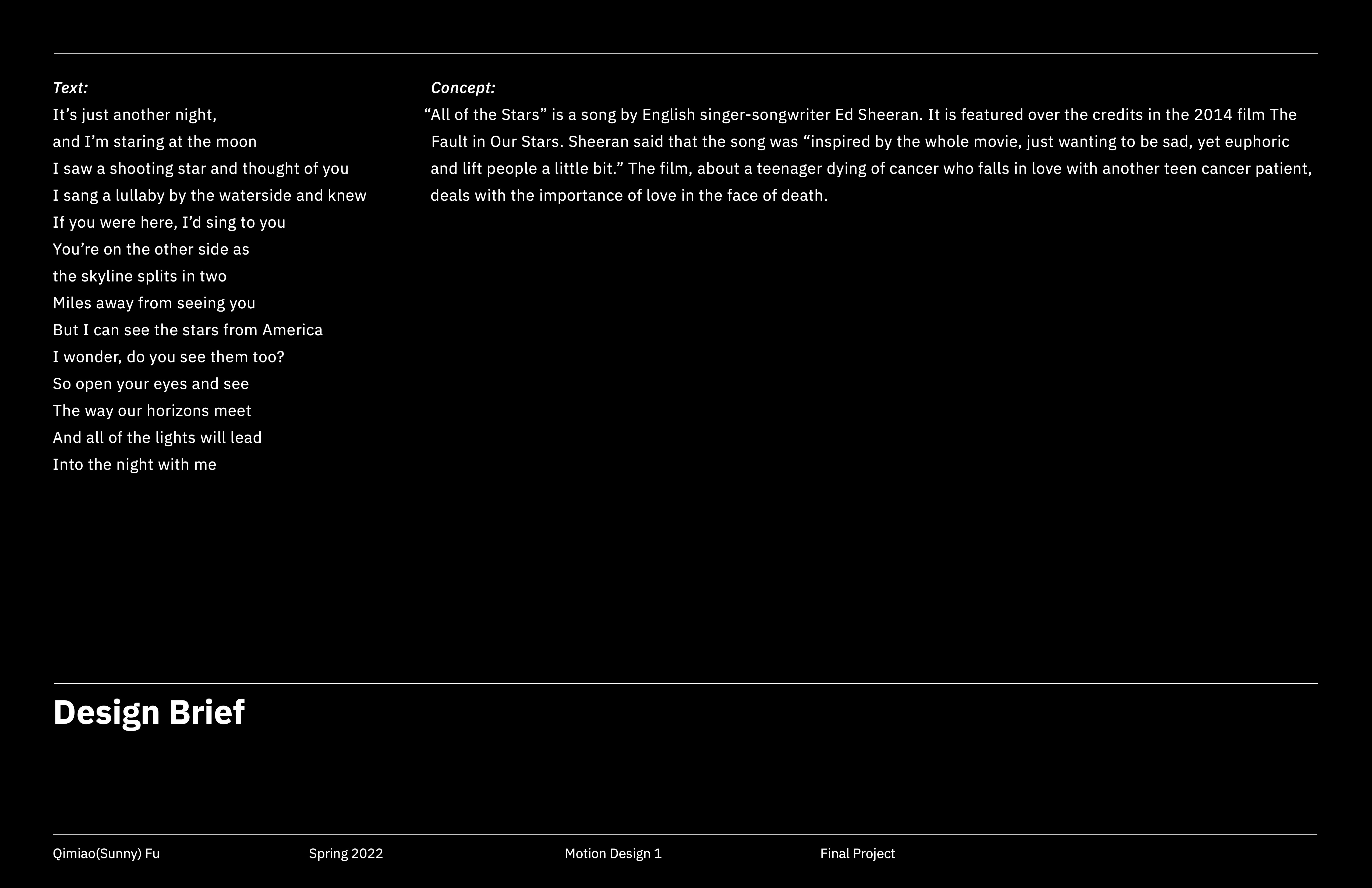 The project is to make an interpretive animation based on a piece of music. It may take a purely abstract form or may combine representational graphic elements to tell a story. “All of the Stars” is a song by English singer-songwriter Ed Sheeran. It is featured over the credits in the 2014 film The Fault in Our Stars. The film, about a teenager dying of cancer who falls in love with another teen cancer patient, deals with the importance of love in the face of death.