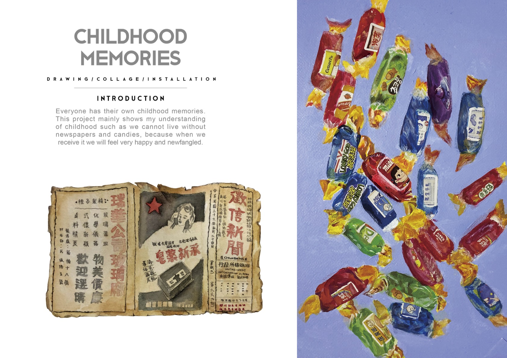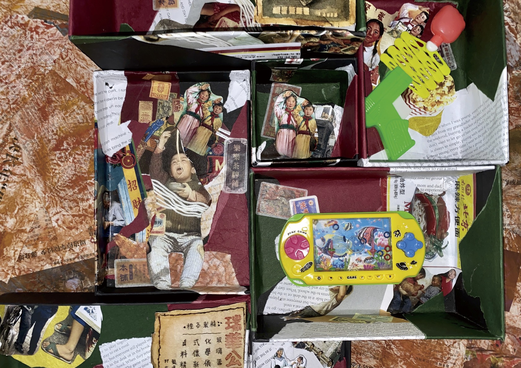Every time when I open my desk drawer, I will see many my old toys. So, I make a box to do my collage inside. The box is like my desk drawer.