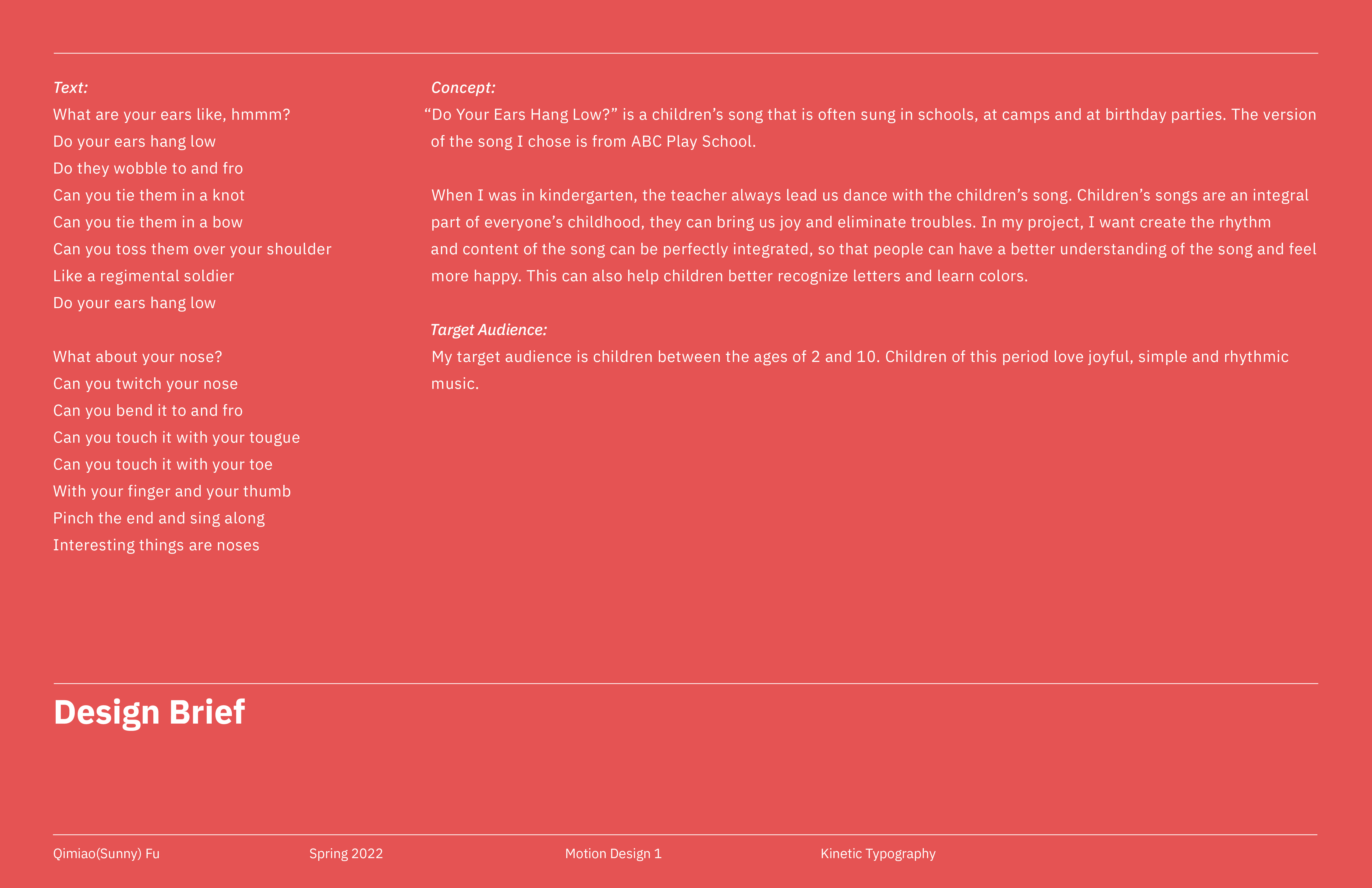 In this project, I need create a kinetic typography animation with text, imagery, and sound. “Do Your Ears Hang Low?” is a children’s song that is often sung in schools, at camps and at birthday parties. When I was in kindergarten, the teacher always lead us dance with the children’s song. Children’s songs are an integral part of everyone’s childhood, they can bring us joy and eliminate troubles.
