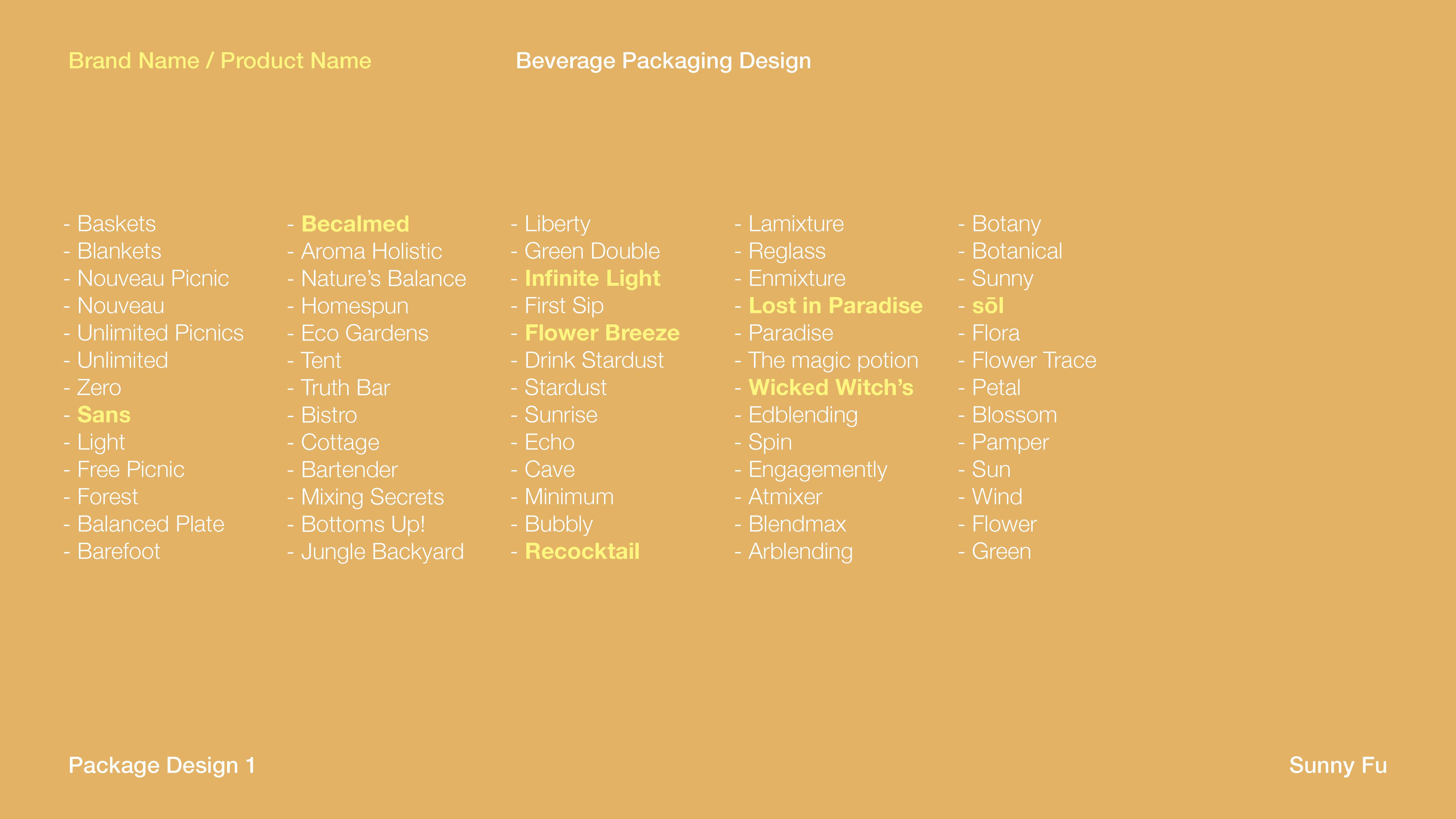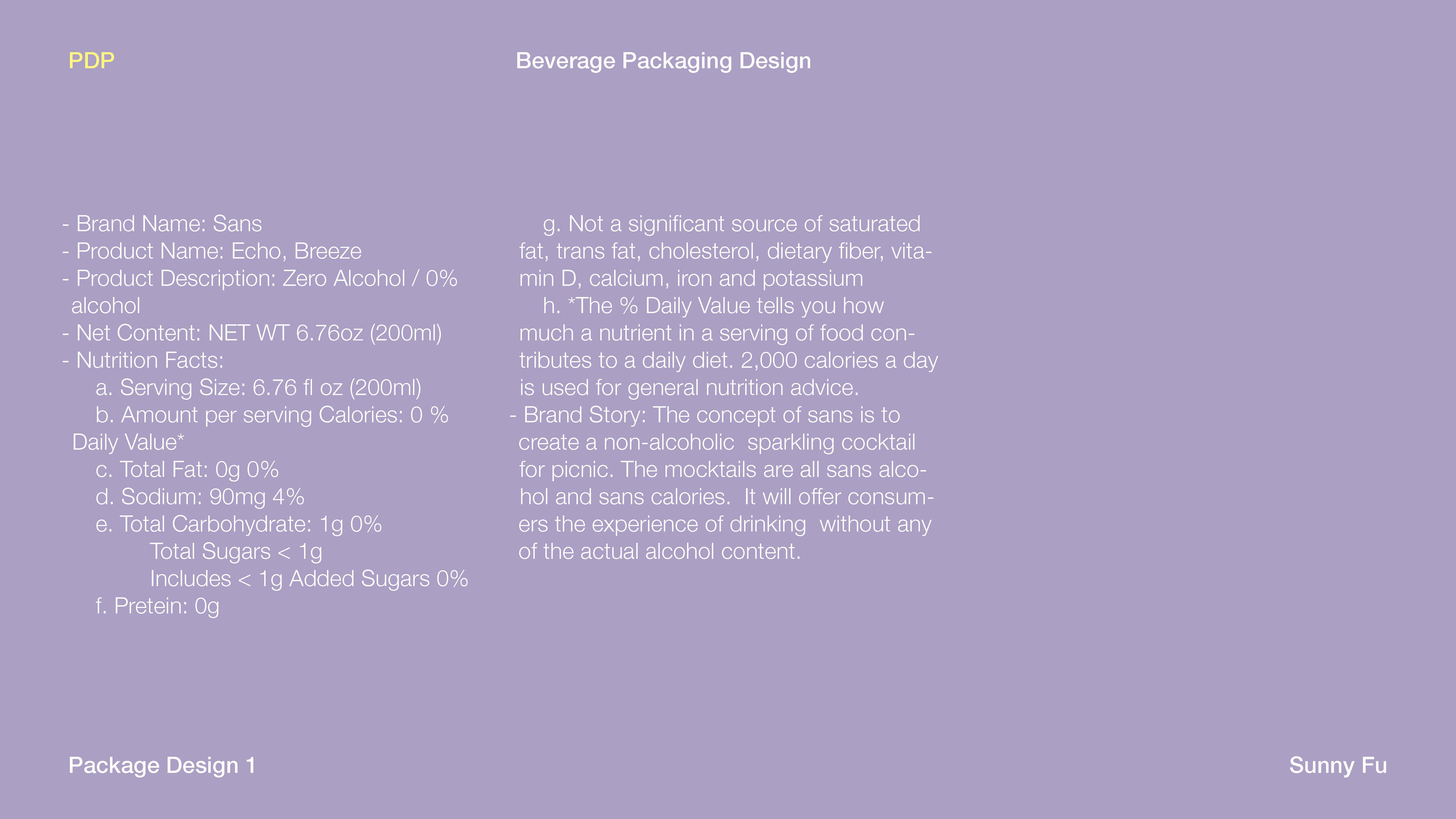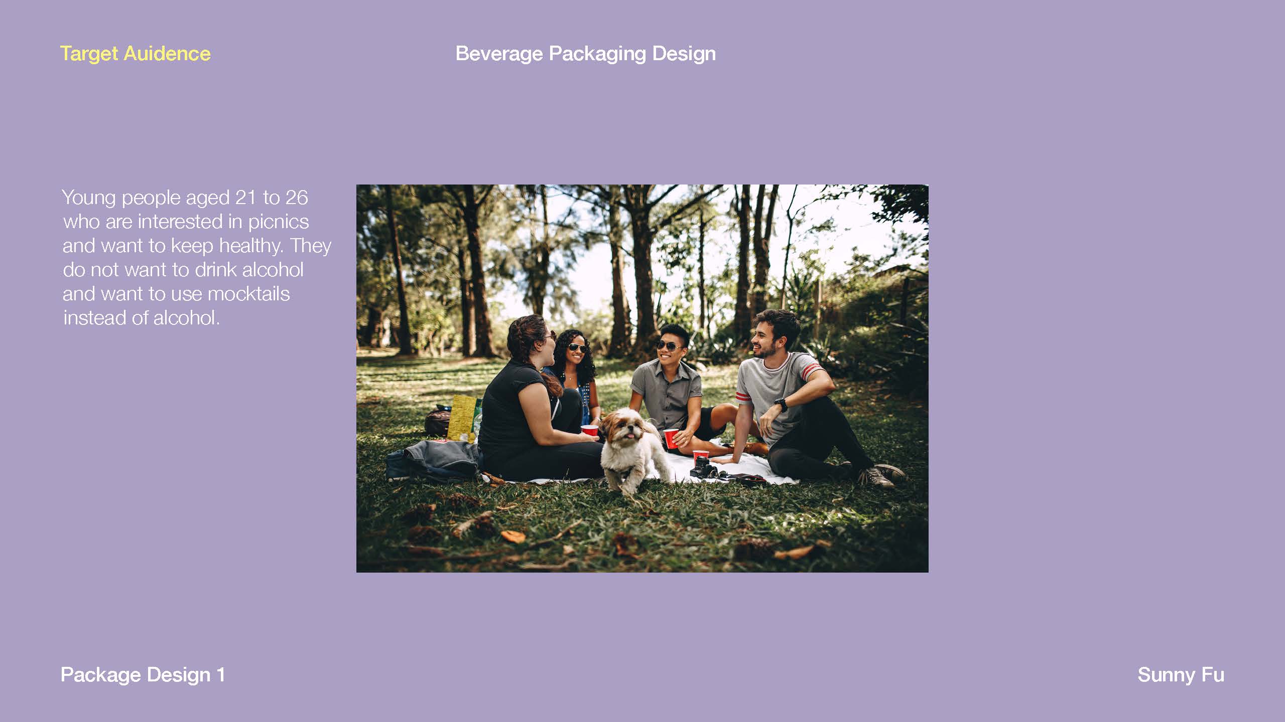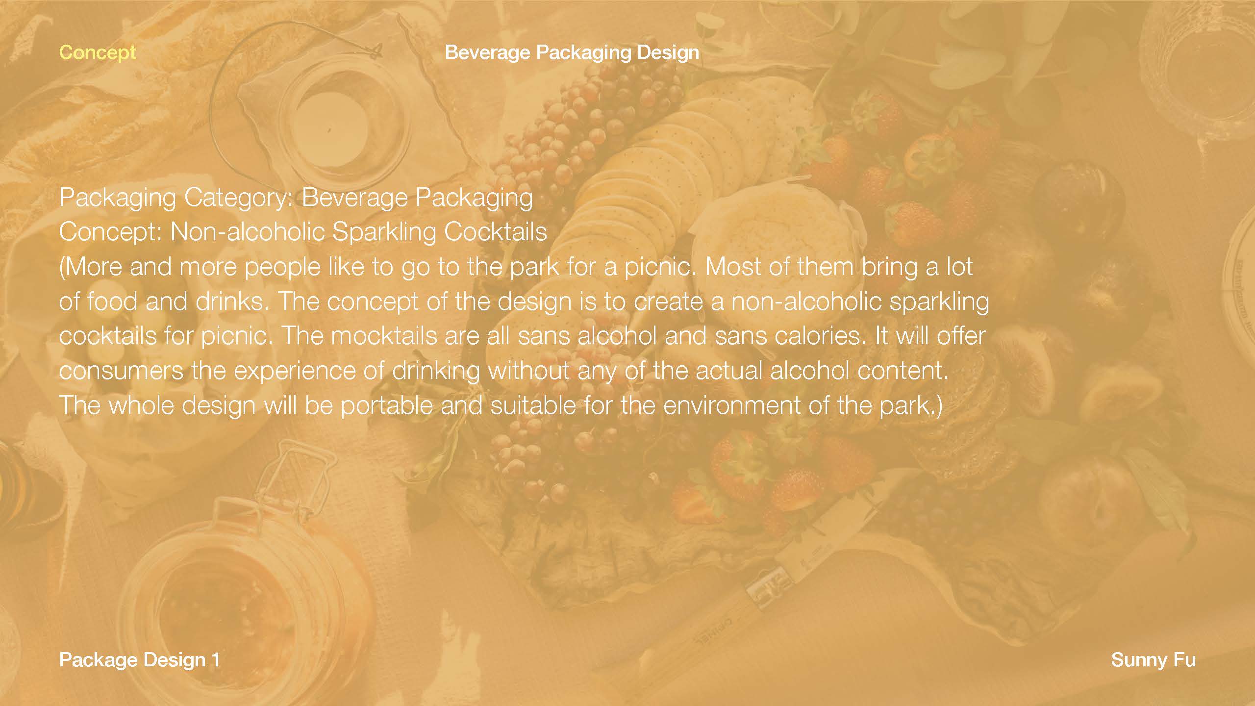 More and more people like to go to the park for a picnic. Most of them bring a lot of food and drinks. The concept of the design is to create a non-alcoholic sparkling cocktails for picnic. The mocktails are all sans alcohol and sans calories. It will offer consumers the experience of drinking without any of the actual alcohol content. The whole design will be portable and suitable for the environment of the park.