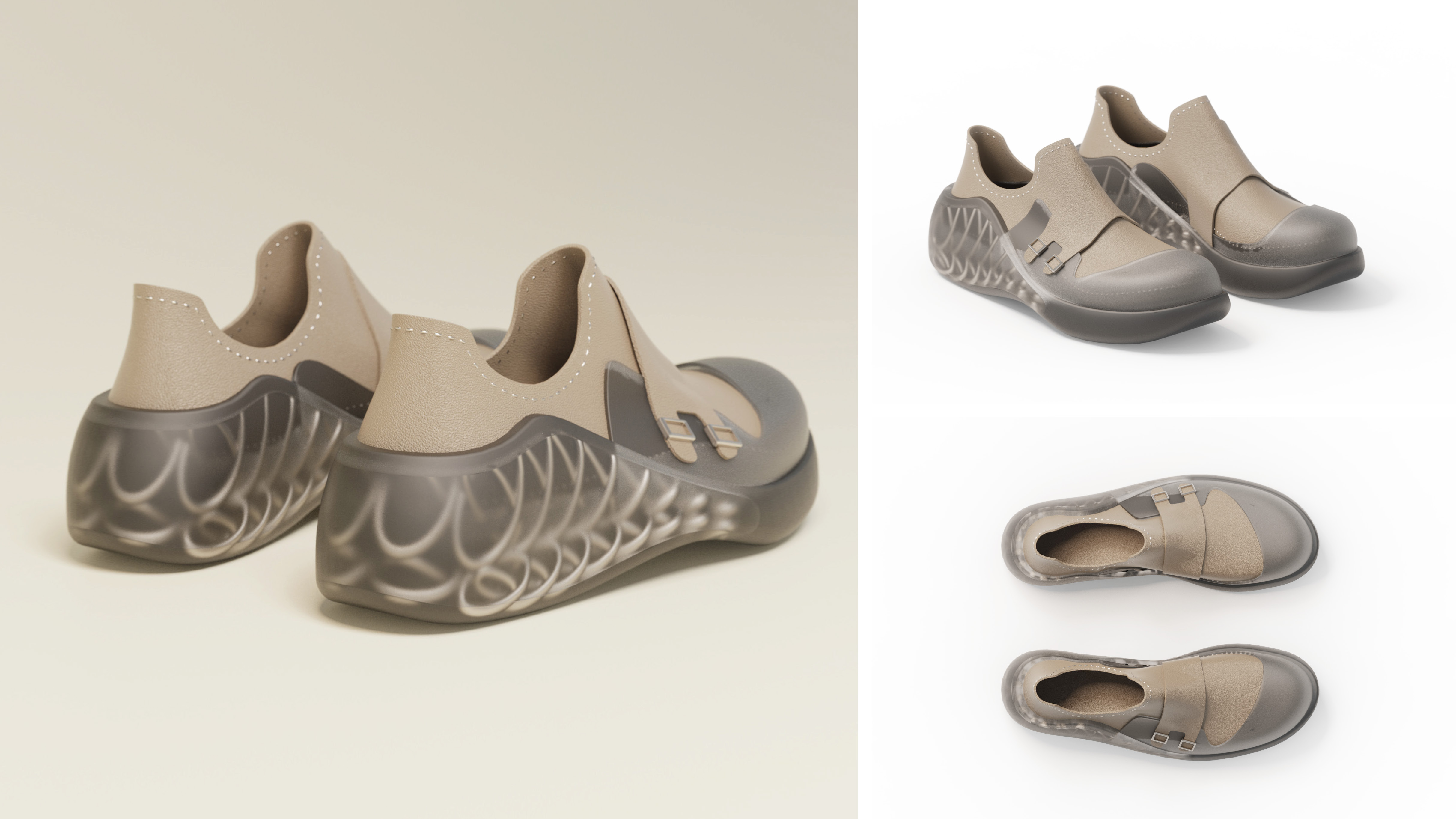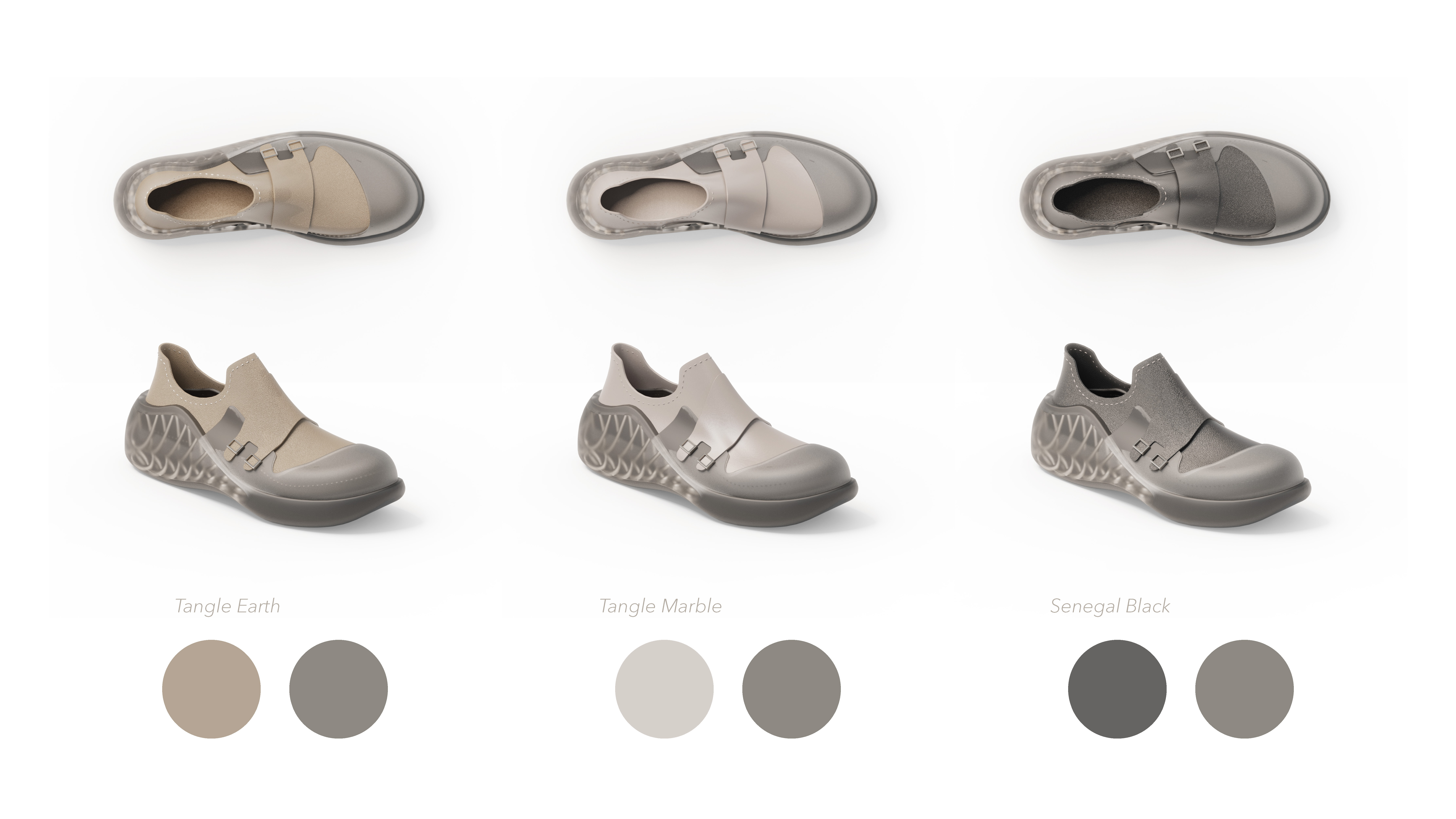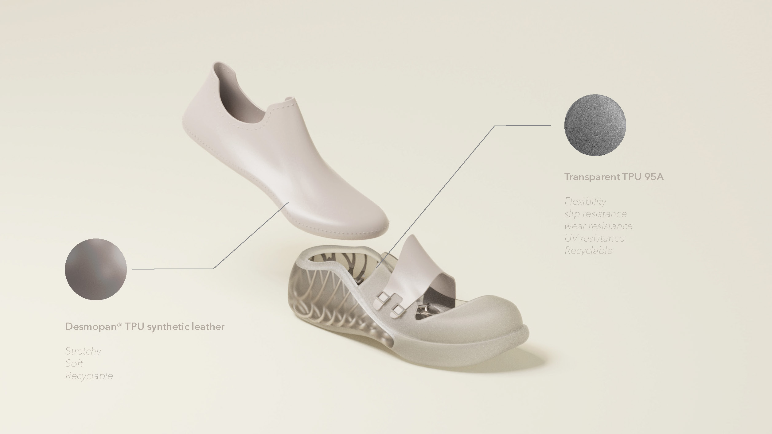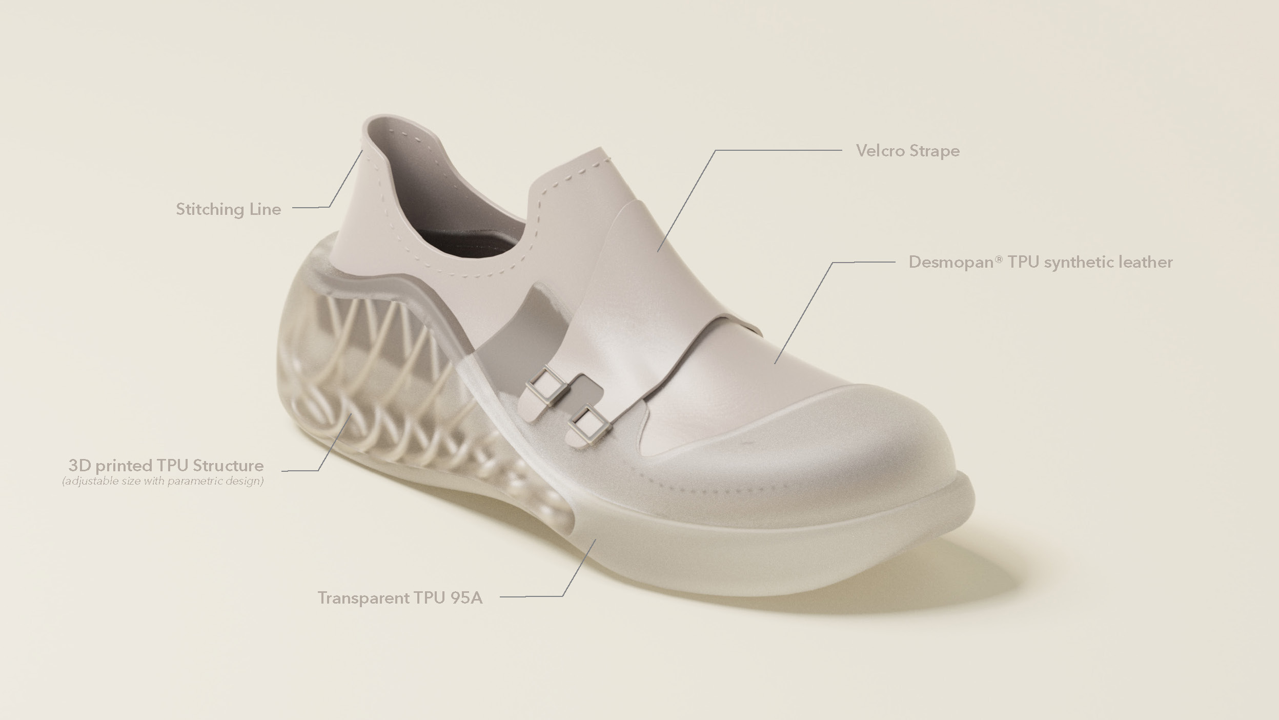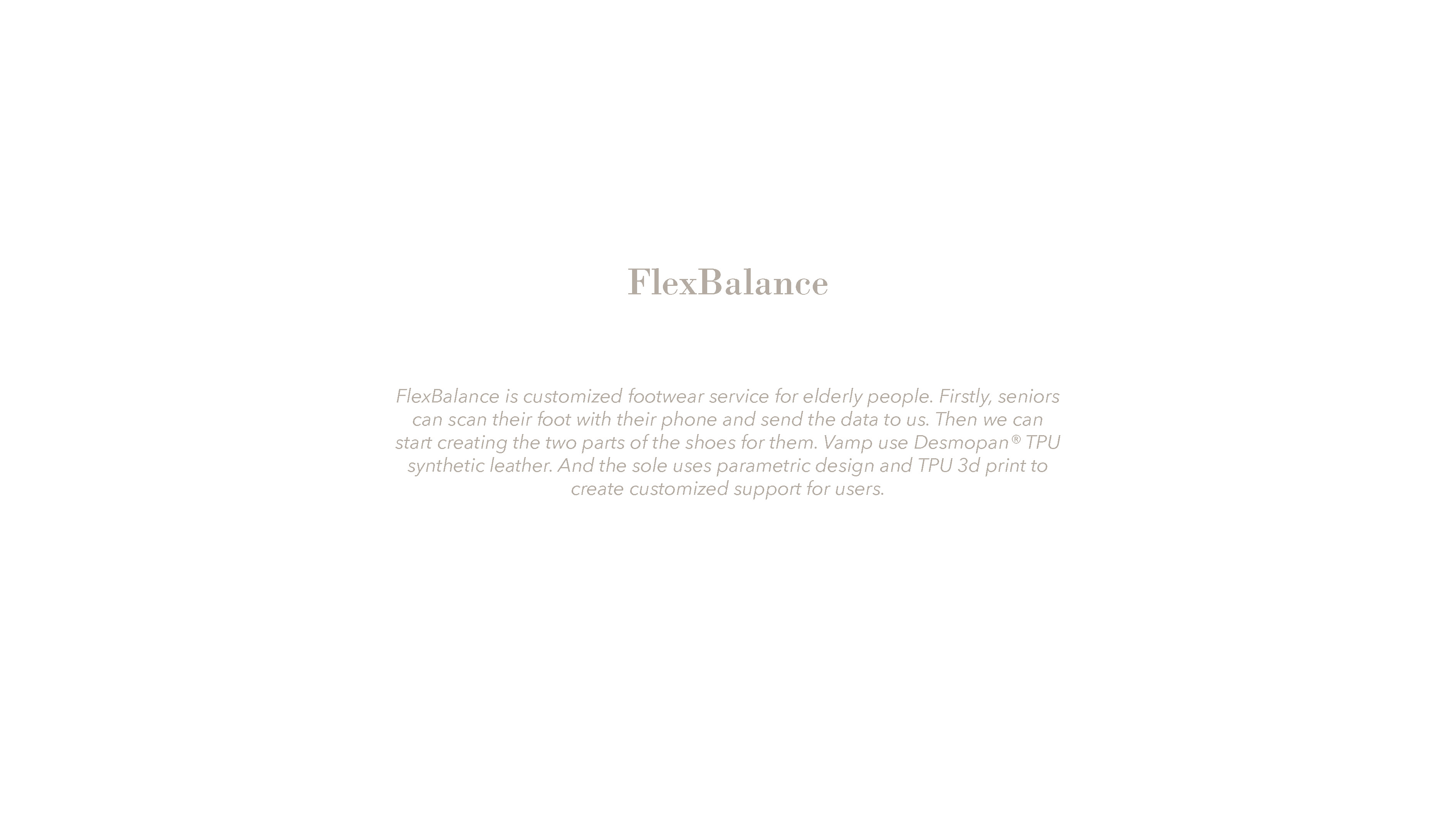 FlexBalance is a customized footwear service for elderly people. Firstly, seniors can scan their foot with their phone and send the data to us. Then we can start creating the two parts of the shoes for them. Vamp uses Desmopan® TPU synthetic leather. And the sole uses parametric design and TPU 3D print to create customized support for users.