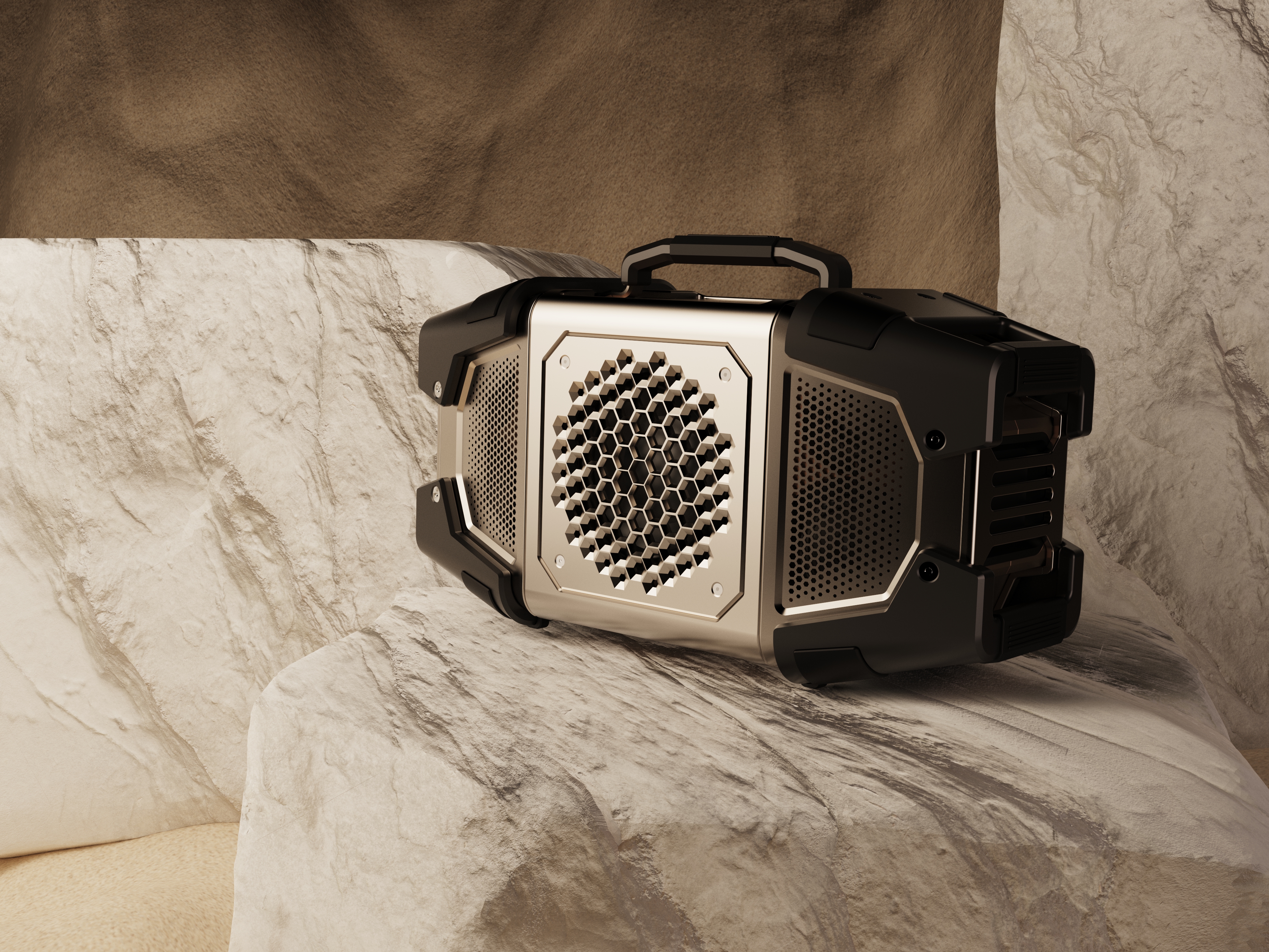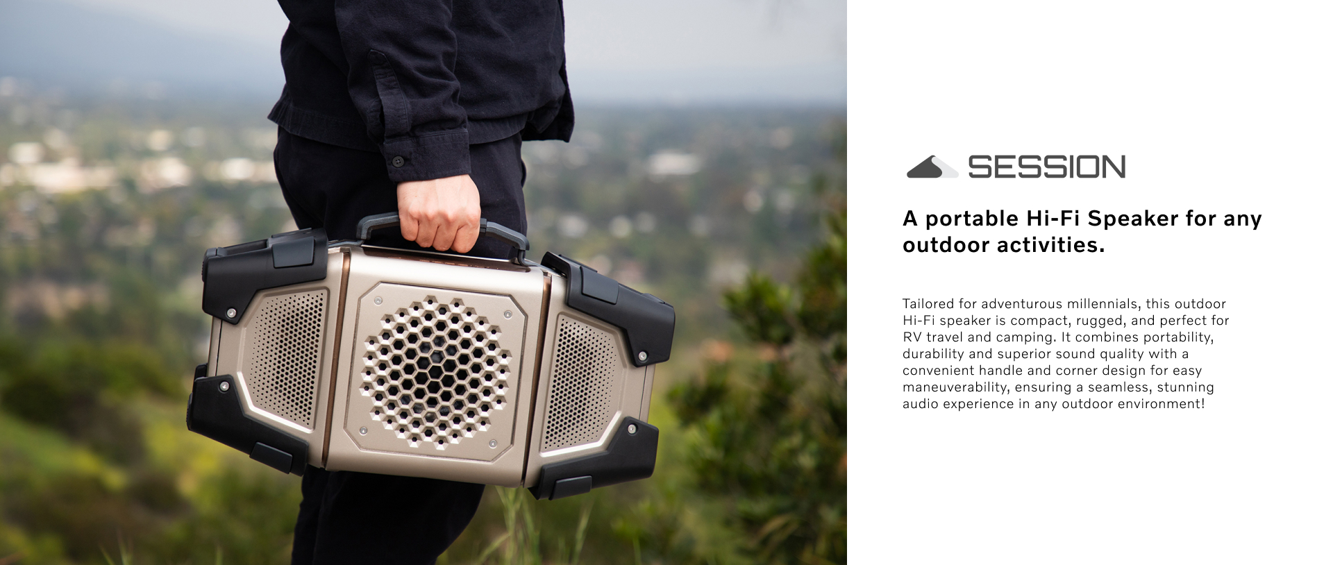 Tailored for adventurous millennials, this outdoor Hi-Fi speaker is compact, rugged, and perfect for RV travel and camping. It combines portability, durability and superior sound quality with a convenient handle and corner design for easy maneuverability, ensuring a seamless, stunning audio experience in any outdoor environment!