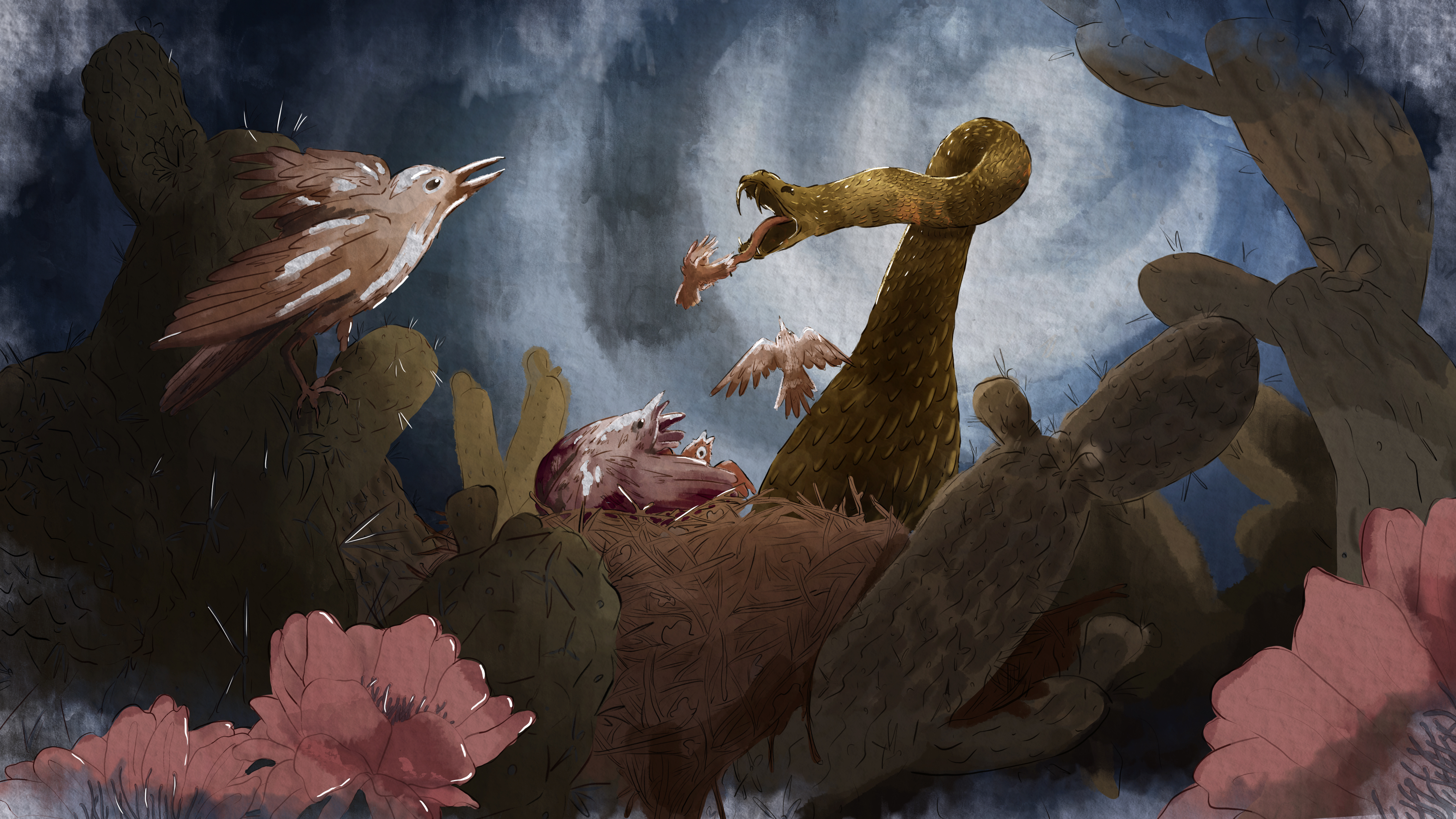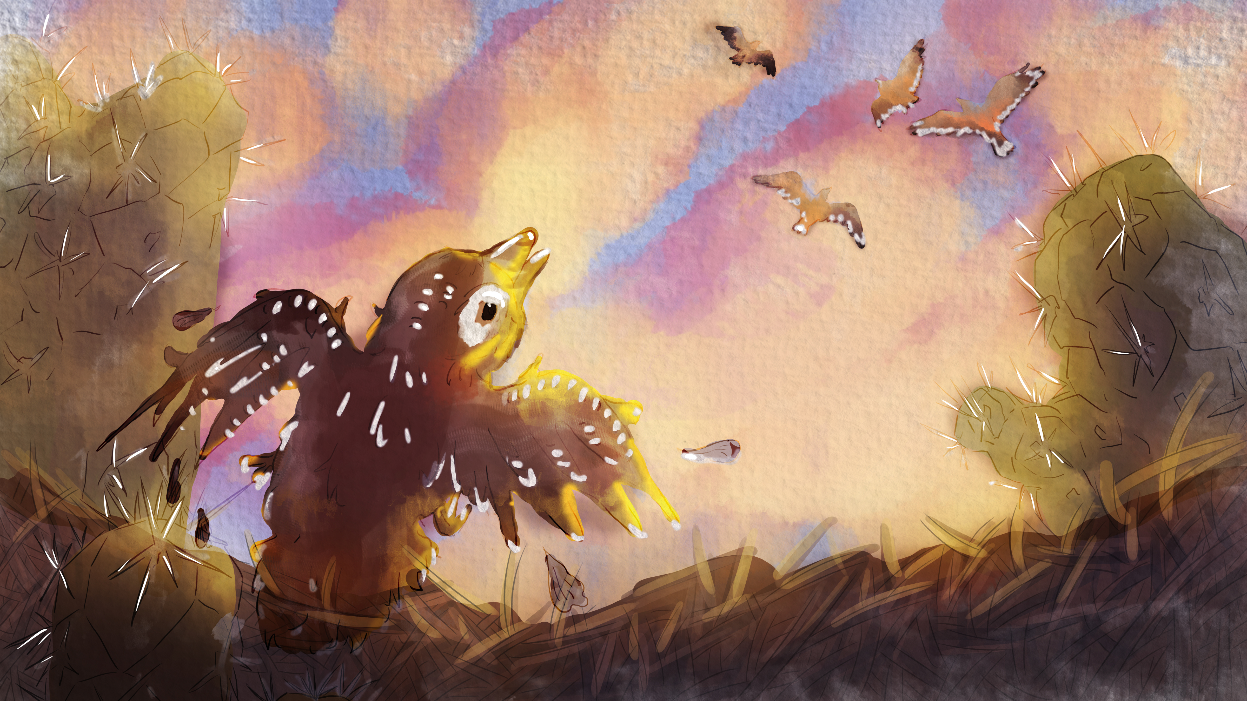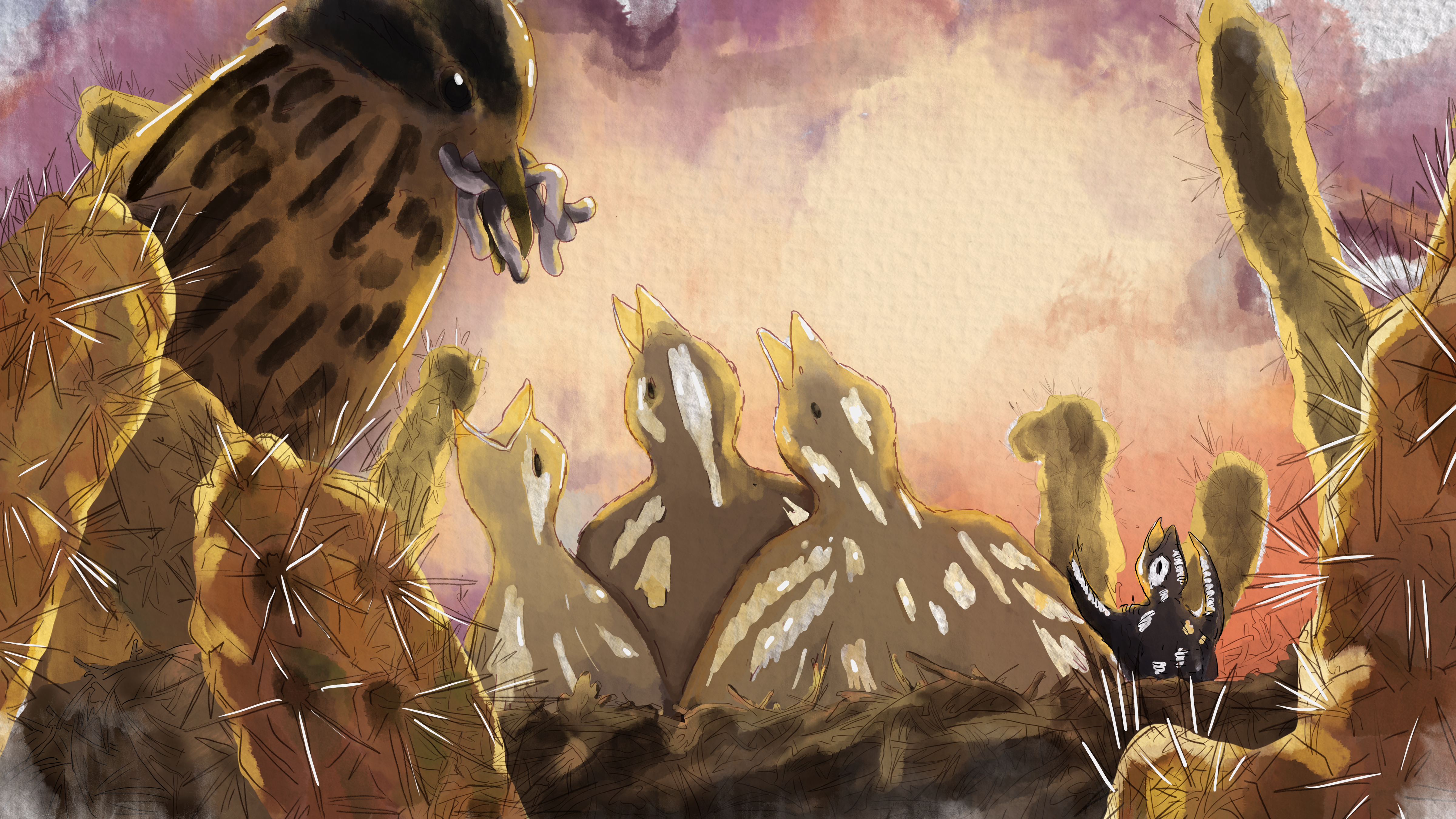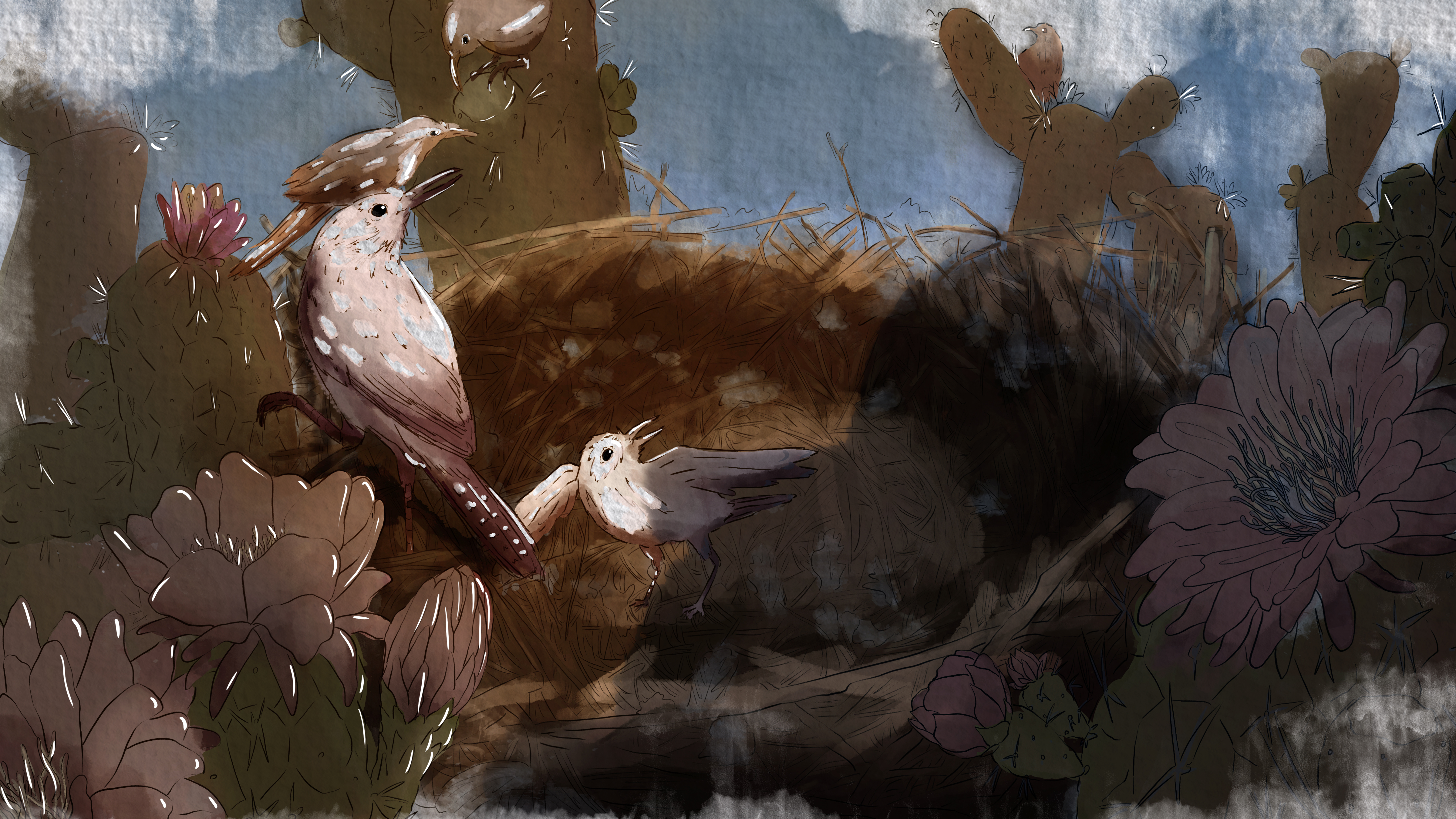 This storyboard follows a family of cactus wrens: a mother and four baby chicks. The youngest and smallest is constantly at a disadvantage, struggling to keep up with its siblings in getting food, flying, and overall surviving. However, it stands out from its siblings with its observational skills, and soon finds its place in its family by alerting and saving its family from an incoming predator, discovering its own part to play and what it can contribute to the survival of the family.