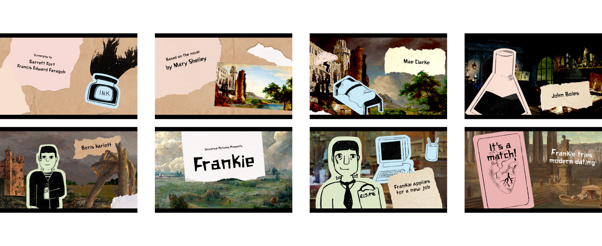 For Motion Design 1, my final project was a title sequence for a TV Show/telenovela inspired by Mary Shelley's novel, "Frankenstein". Entitled "Frankie", my concept was a light-hearted show that shows Frankenstein's monster, Frankie, trying to live a normal life among the humans, facing mundane challenges. Softwares: AfterEffects, Photoshop and Procreate.