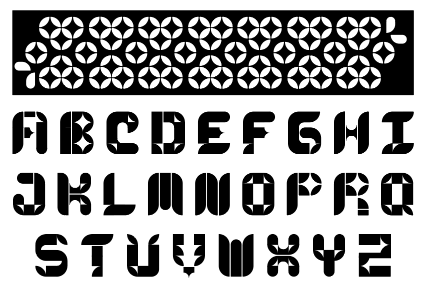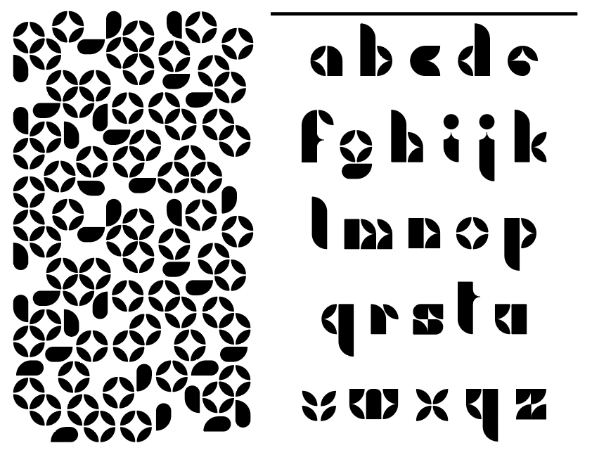 The goal was to design a basic uppercase and lowercase alphabet (A–Z, a–z) using modules built from the primary forms (●, ▲, ■) and combinations thereof. Working with this modular method helps understanding the architecture of letterforms and the modularity, coherence, and harmony inherent to type design.