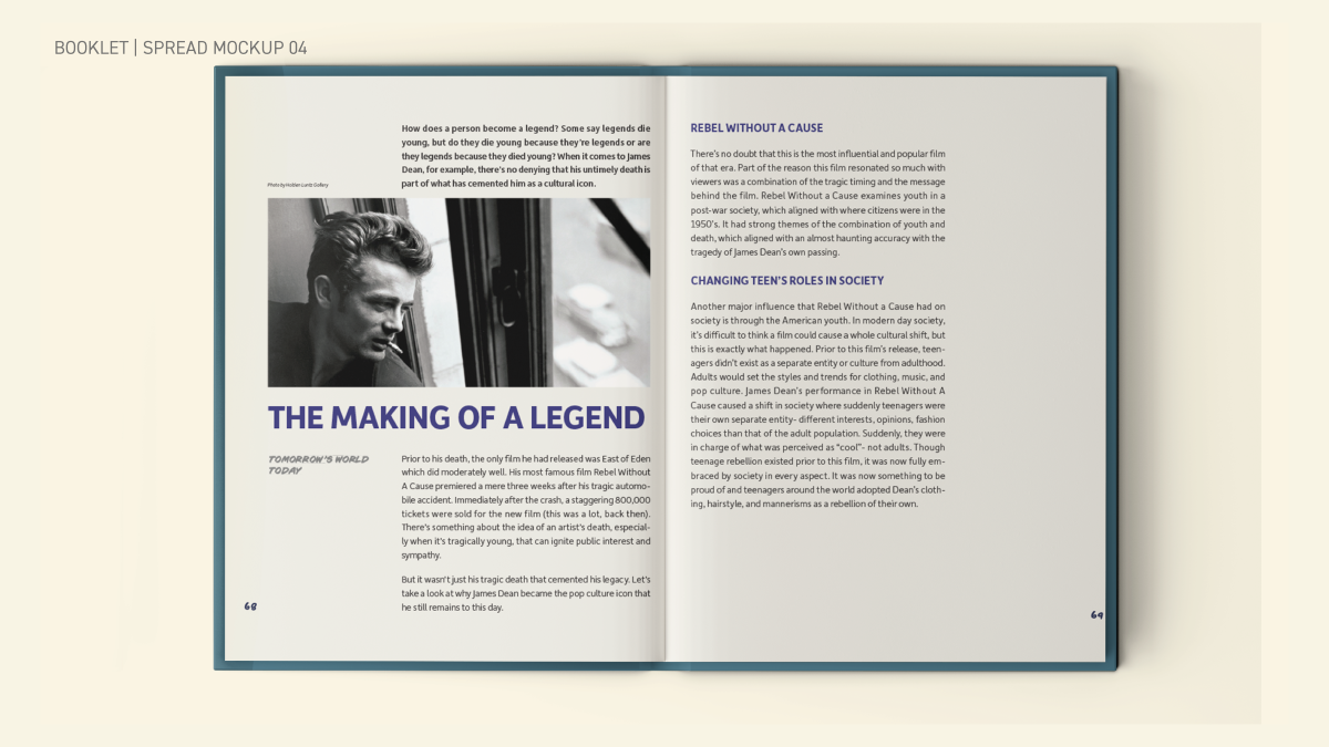 This was my project for Graduate Studio 1. Throught the term, the goal was to develop a wordmark, a booklet, a triptych and, finally, a social media piece for the chosen American Master. For me, that was James Dean, the 50s Hollywood Star.