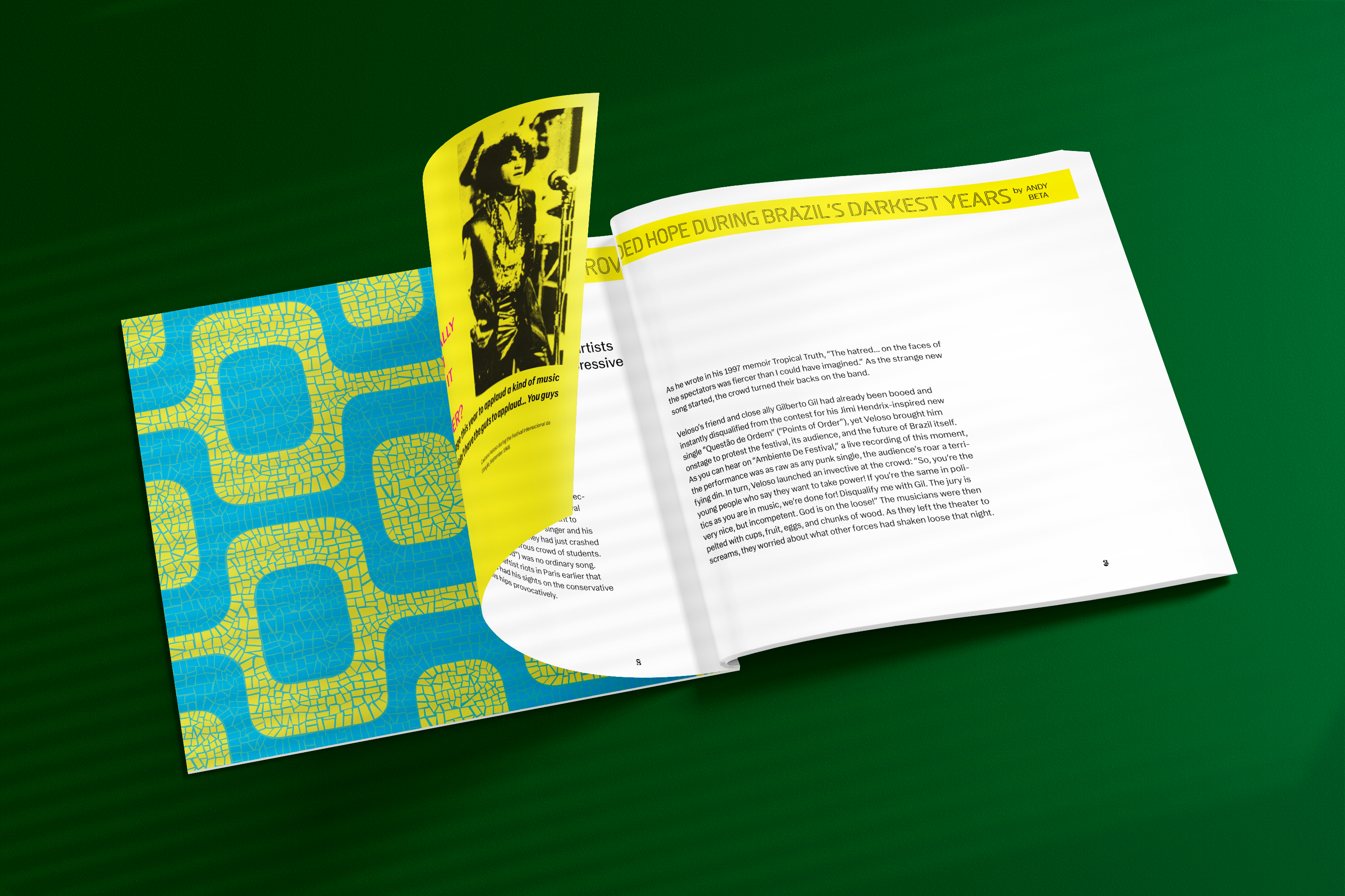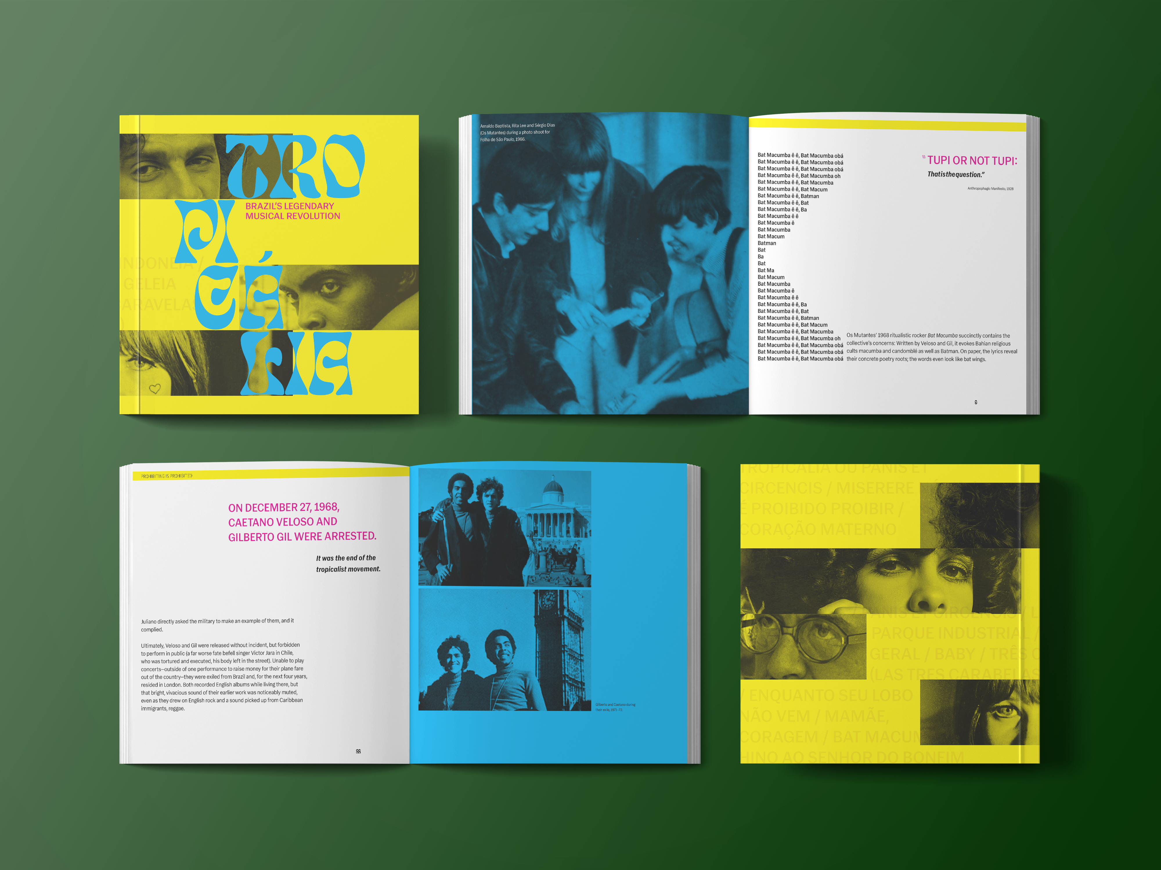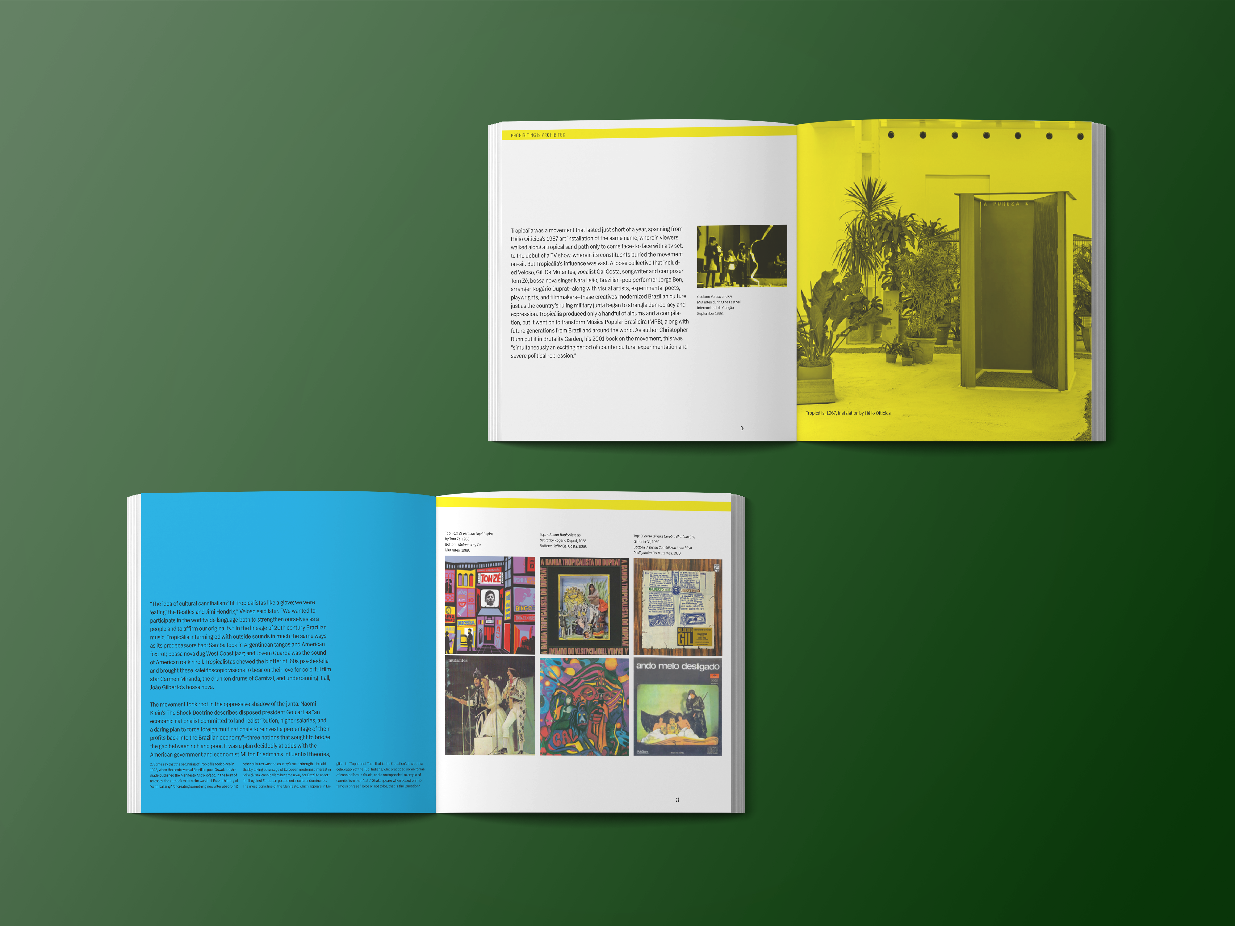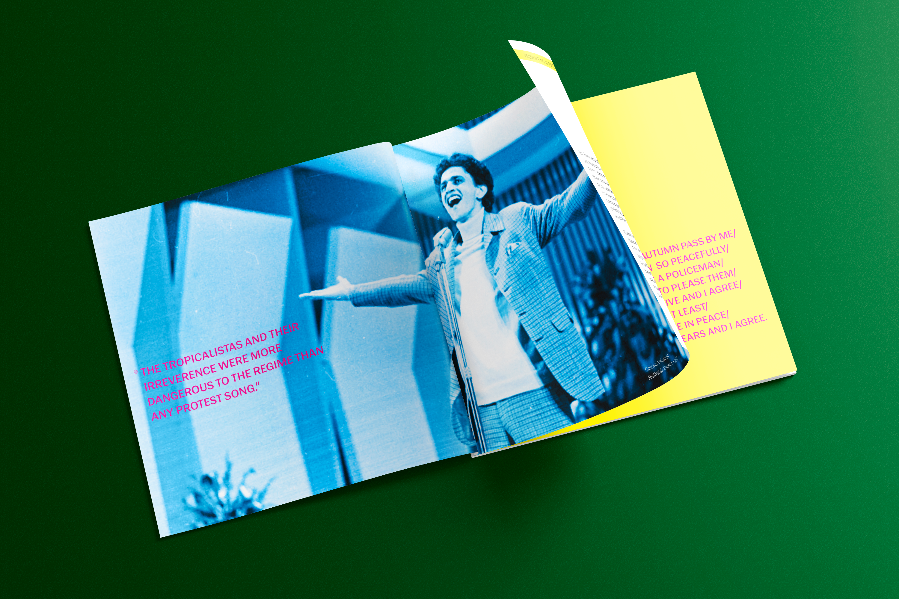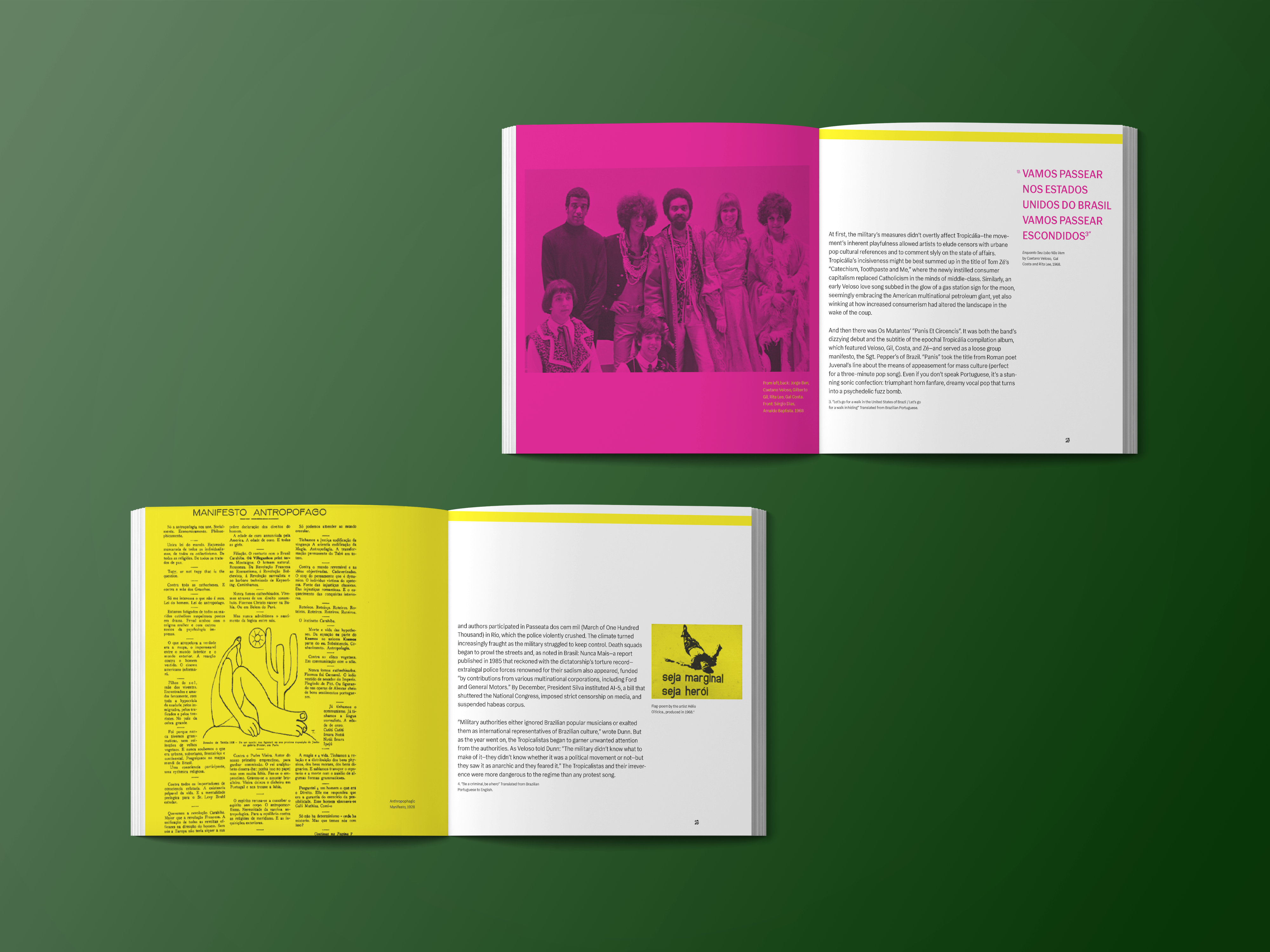 Booklet developed on a chosen artistic movement. For this, I chose Tropicália, a political and musical movement in Brasil during the 60s and 70s. In this 36 publication, I explored the history and aesthetics of the movement, presenting the main voices and works that that protested against the military coup and dictatorship in Brasil.