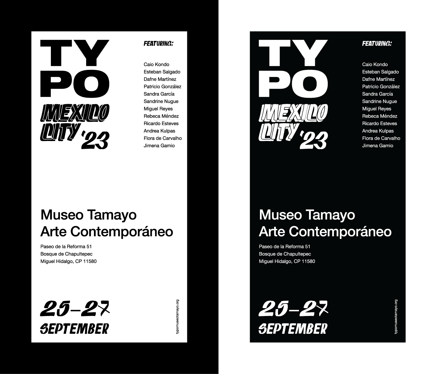 Positive and negative versions of the poster. As the posters were really big, I envisioned the posters in the urban spaces of latino cities, not only Mexico City but also Rio de Janeiro, São Paulo, Buenos Aires and Santiago. The cities are full of color and people , so I saw the black and white as an opportunity for the posters to be highlighted in the walls of these metropoles. I tried to keep some minimalism, that would be a nice contrast with all the information I mentioned.