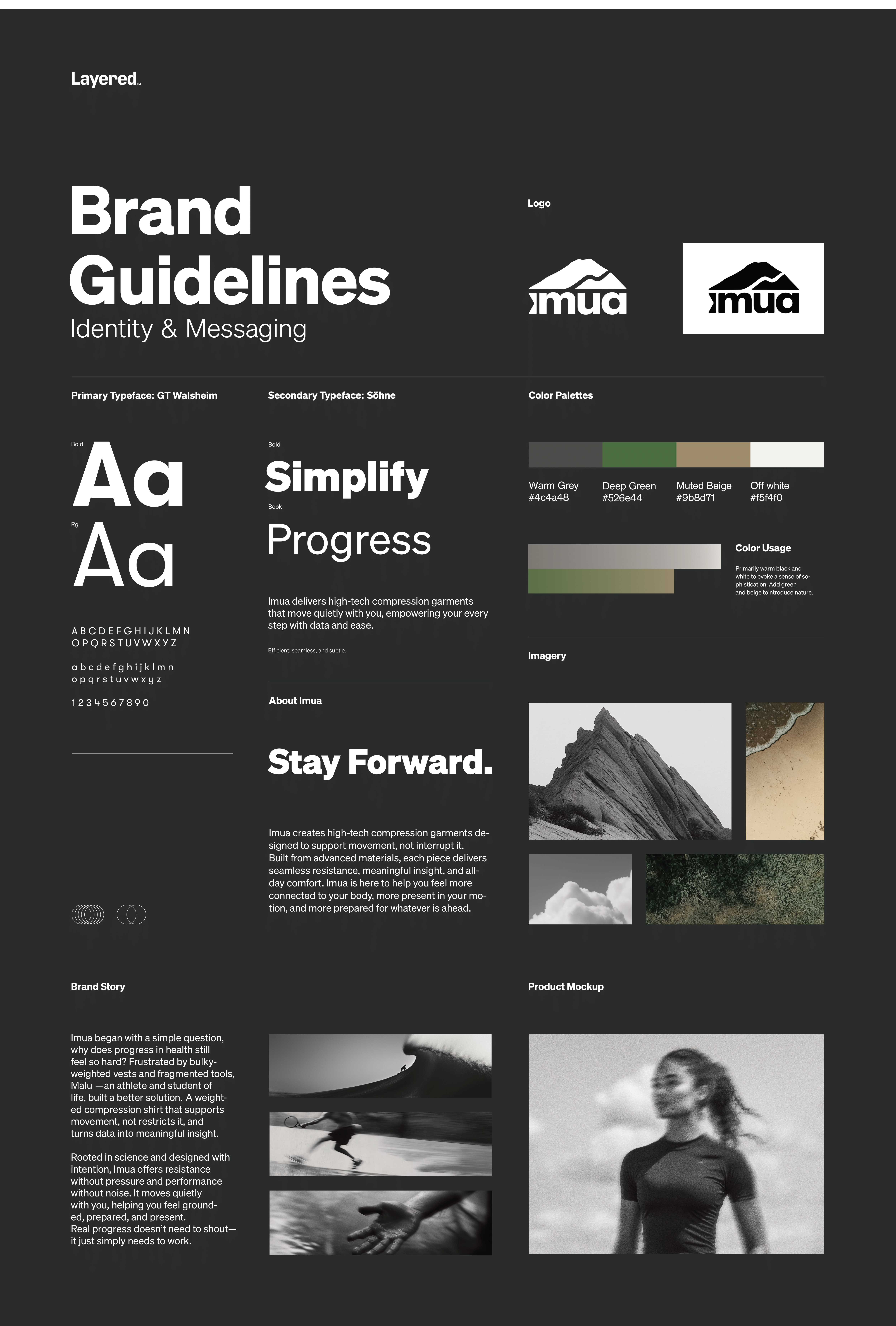 Imua is a high-tech compression wear startup built for experience-driven athletes and boundary-pushers. I led the brand development—from visual identity to storytelling—centered around efficiency, minimalism, and performance. The branding challenges traditional sportswear aesthetics, positioning Imua as a lifestyle-enhancing force that merges innovation, purpose, and sleek design. Done with Kevin Yang.