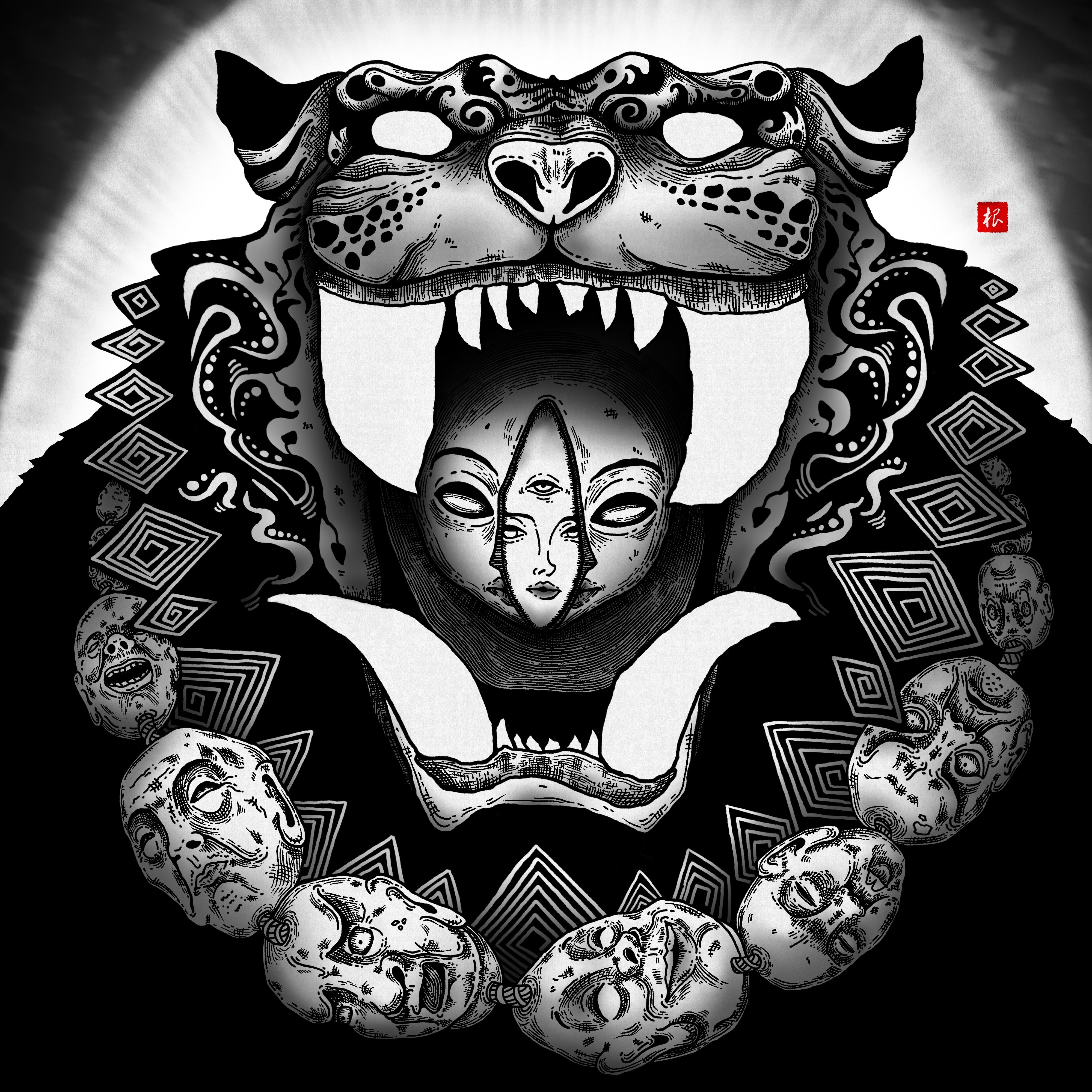 Tiger Moon is a digital illustration exploring transformation, duality, and ancestral power. A masked figure emerges from the jaws of a mythic tiger, framed by ritual patterns and a necklace of distorted faces—symbols of identity, memory, and rebirth. Drawing from East Asian mythology and spiritual iconography, the piece evokes a surreal confrontation between inner self and cosmic force.