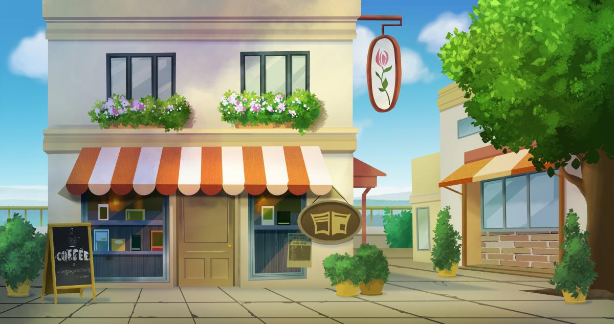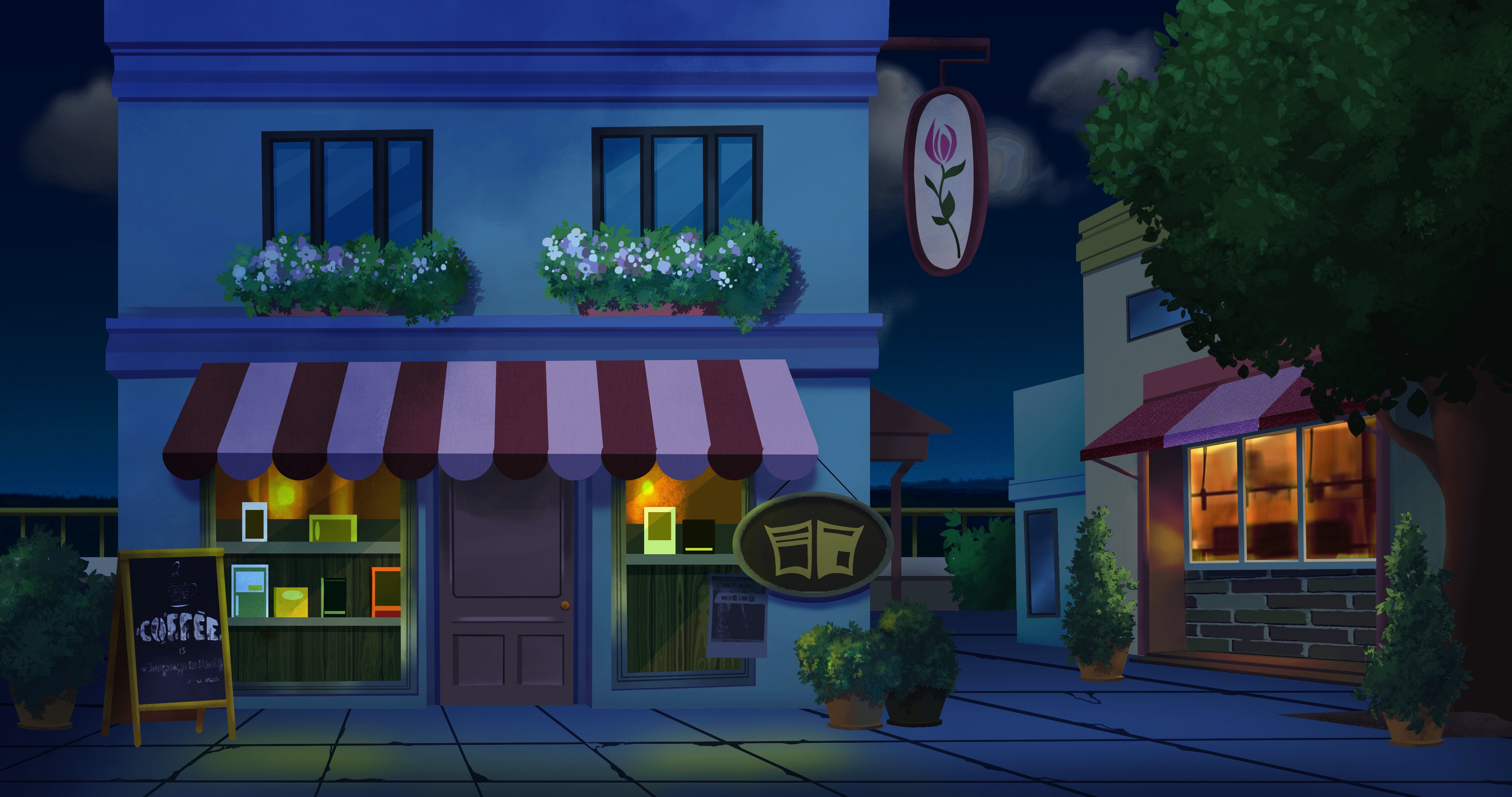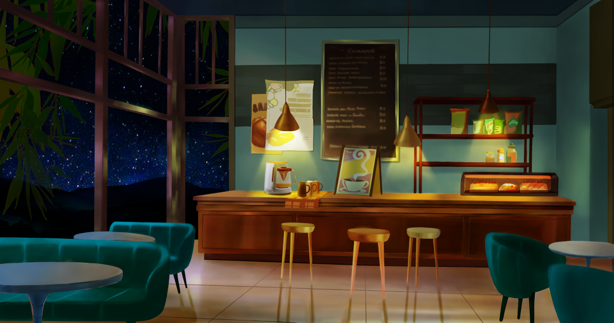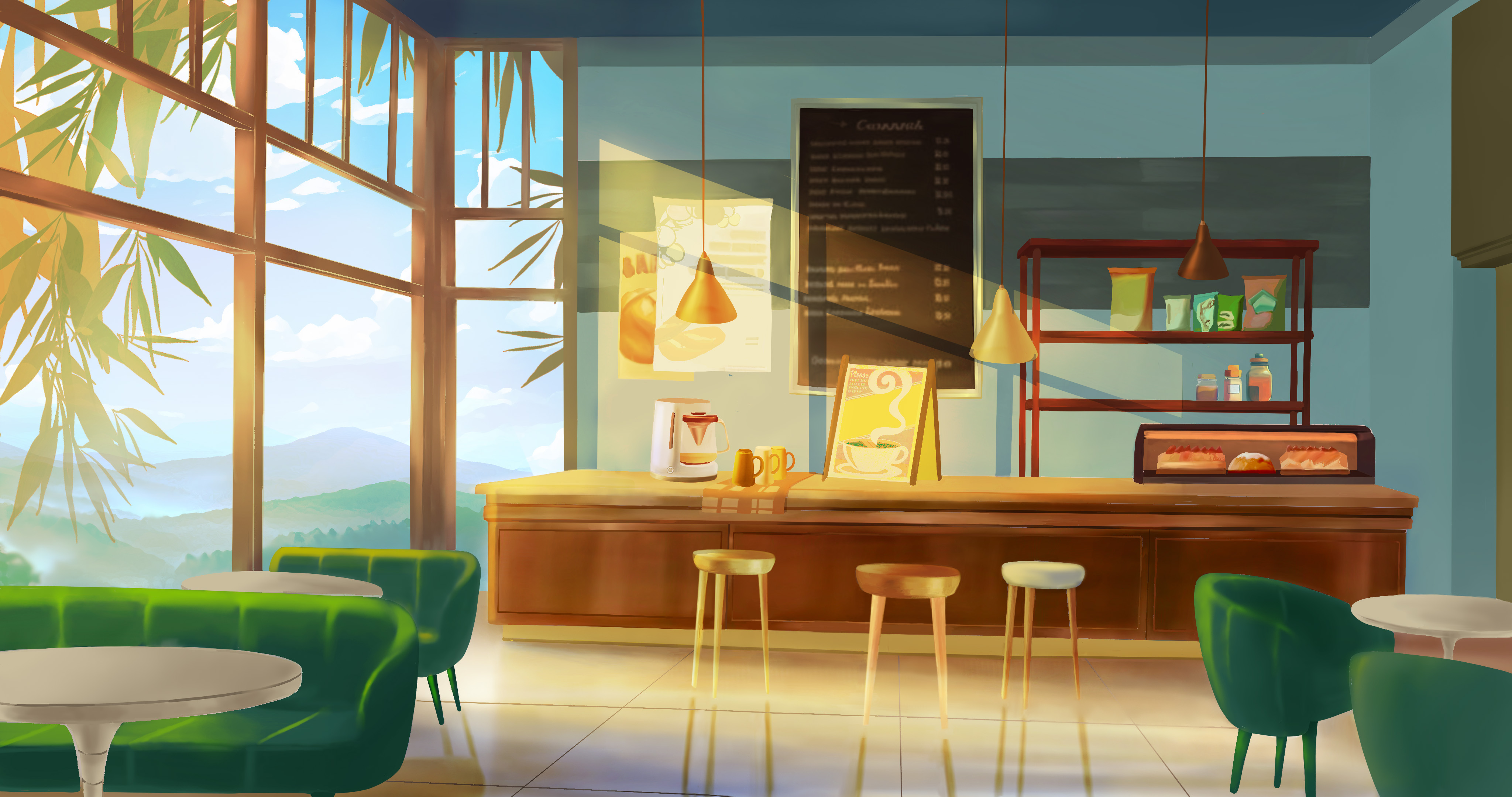 Background painting of a modern coffee shop in a series of daytime and nighttime.