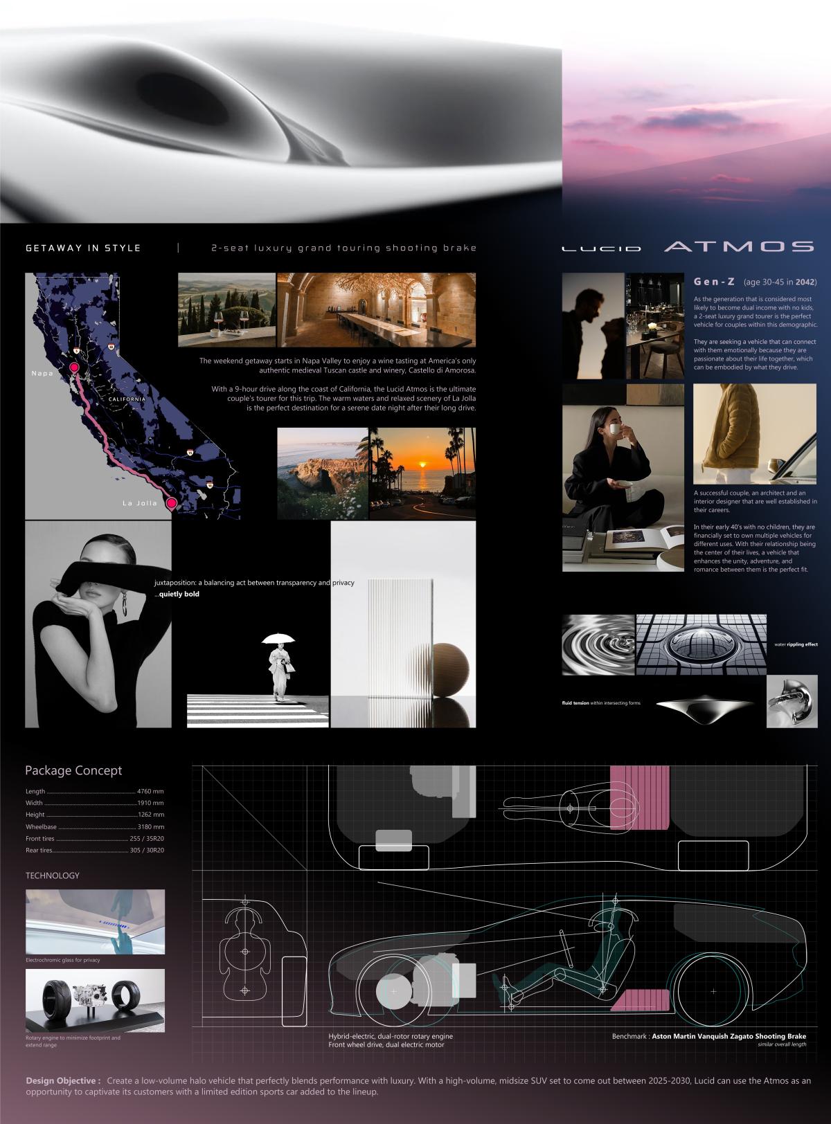 The Lucid Atmos is a 2-seat grand touring, luxury shooting brake. It is designed to be the perfect weekend getaway vehicle for a couple that prioritizes the unity, adventure, and romance within their relationship.