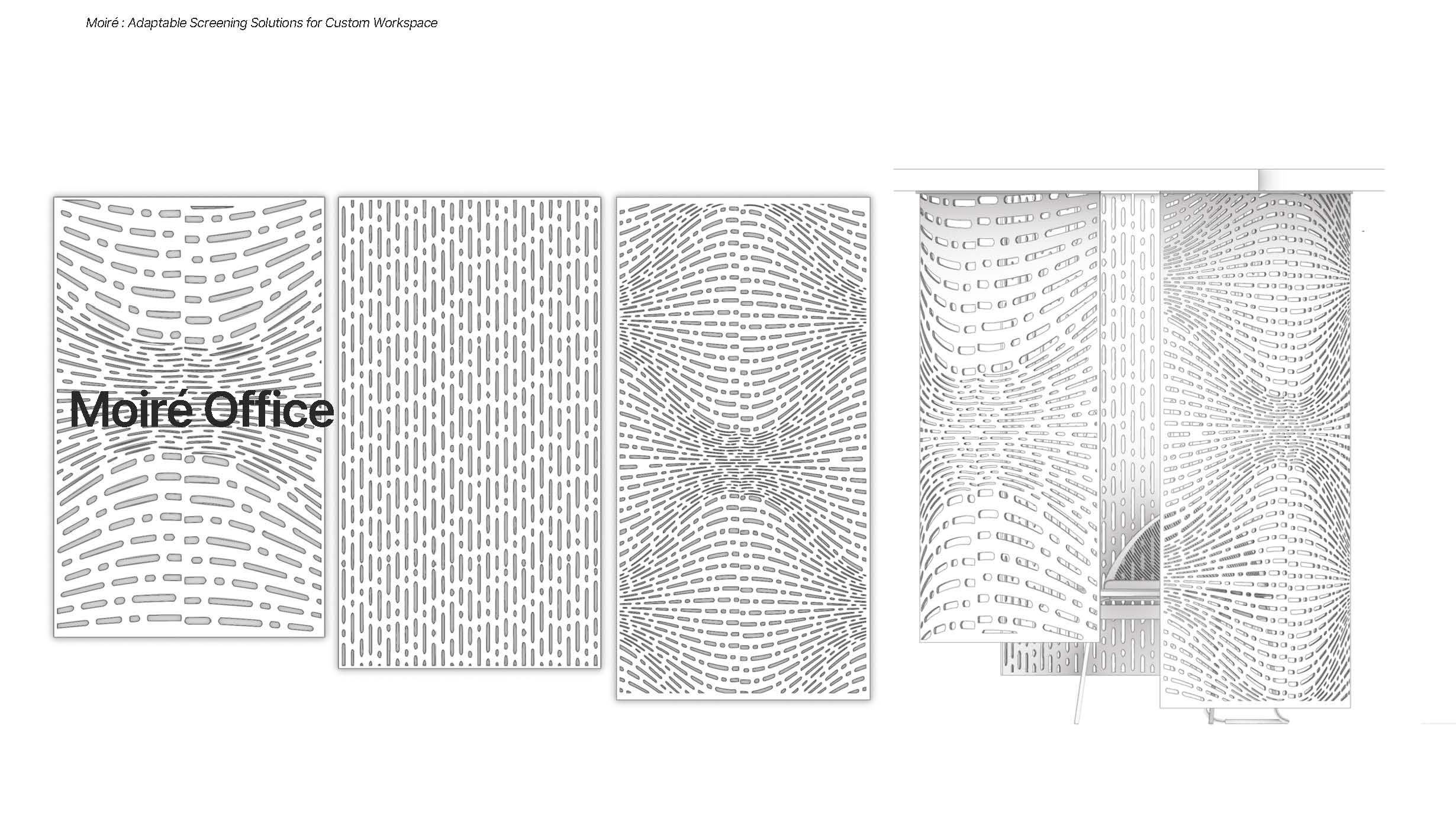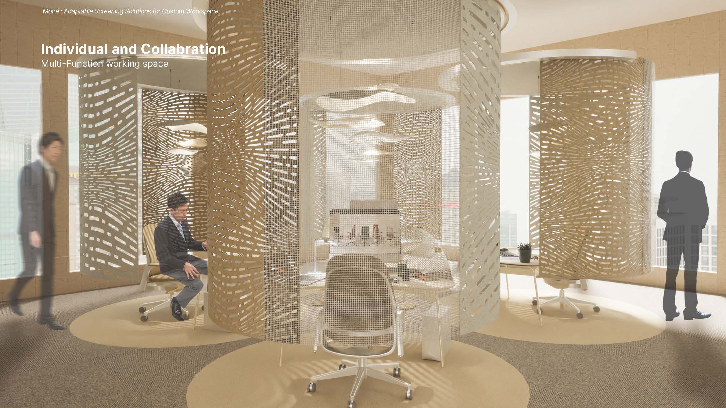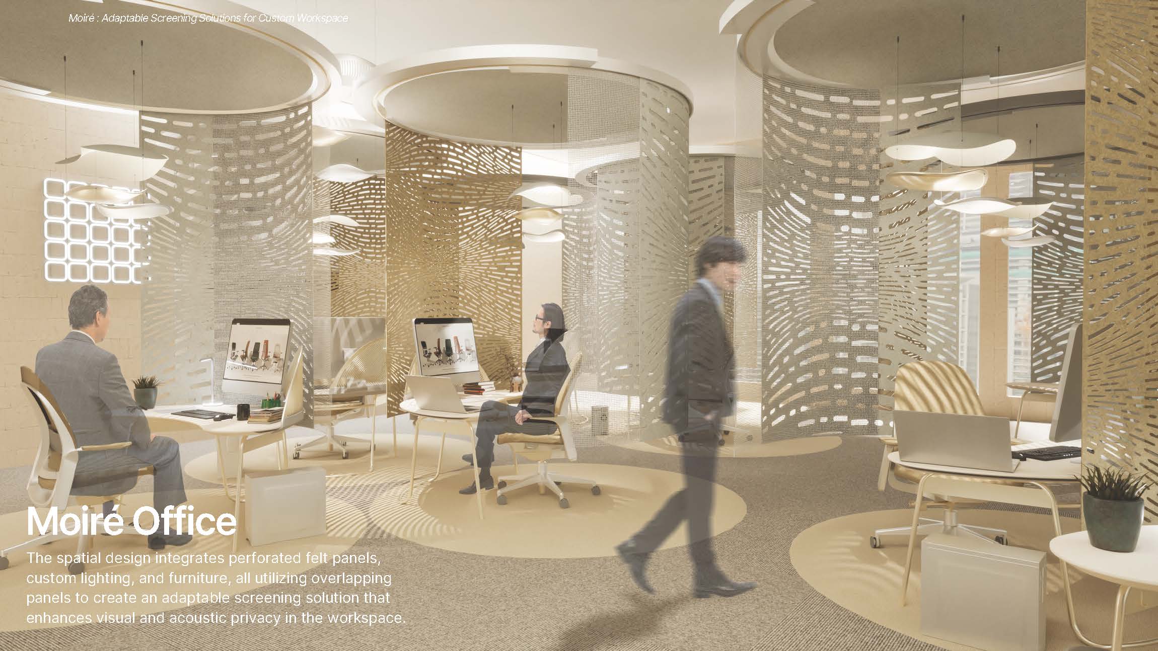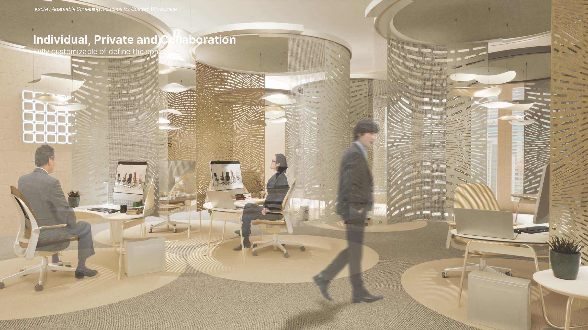 The Moiré design series empowers users to customize their workspaces. It enhances visual and acoustic separation through furniture, lighting, and spatial design by offering adjustable solutions using overlapping moire patterns for varying degrees of privacy.