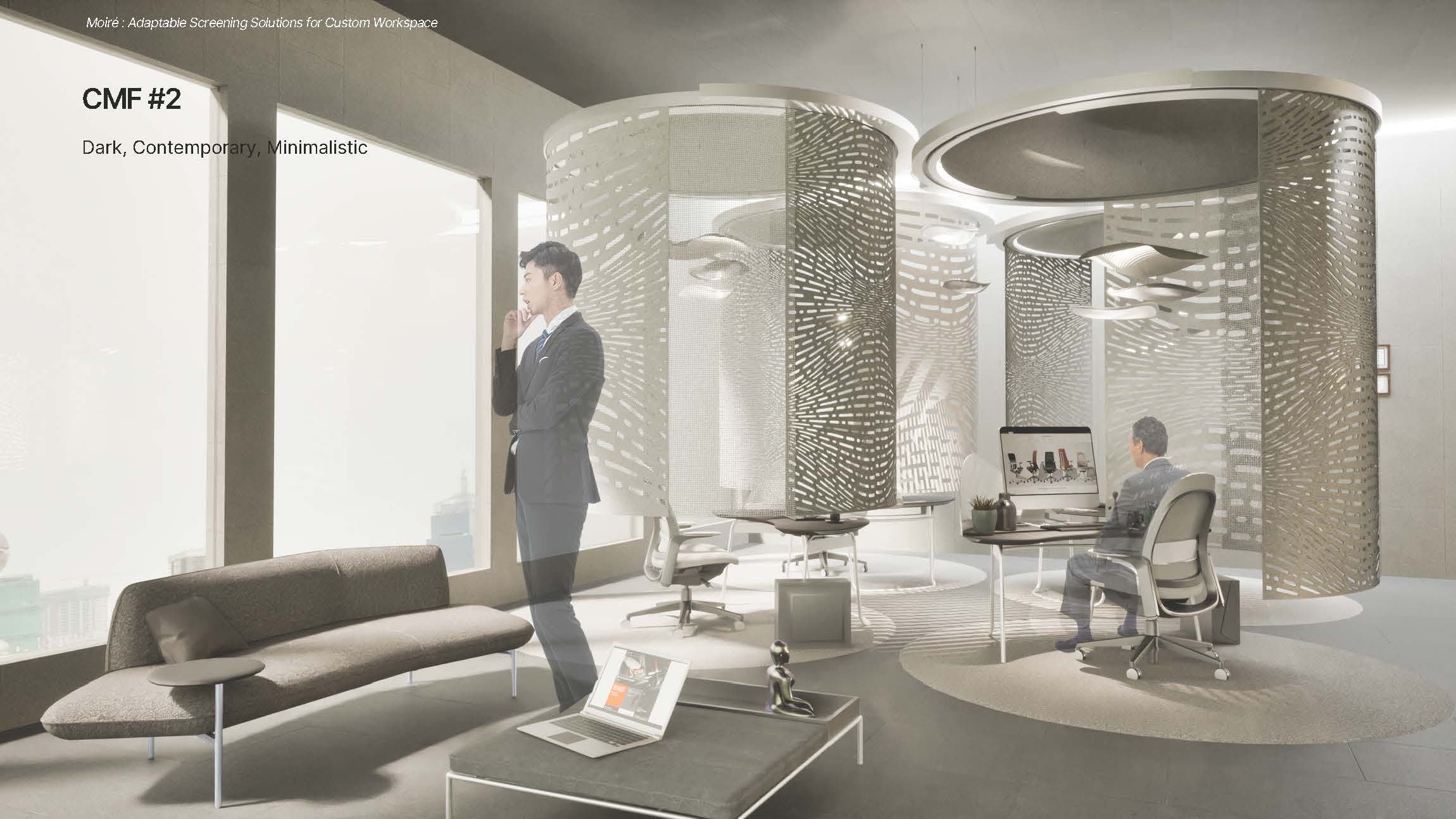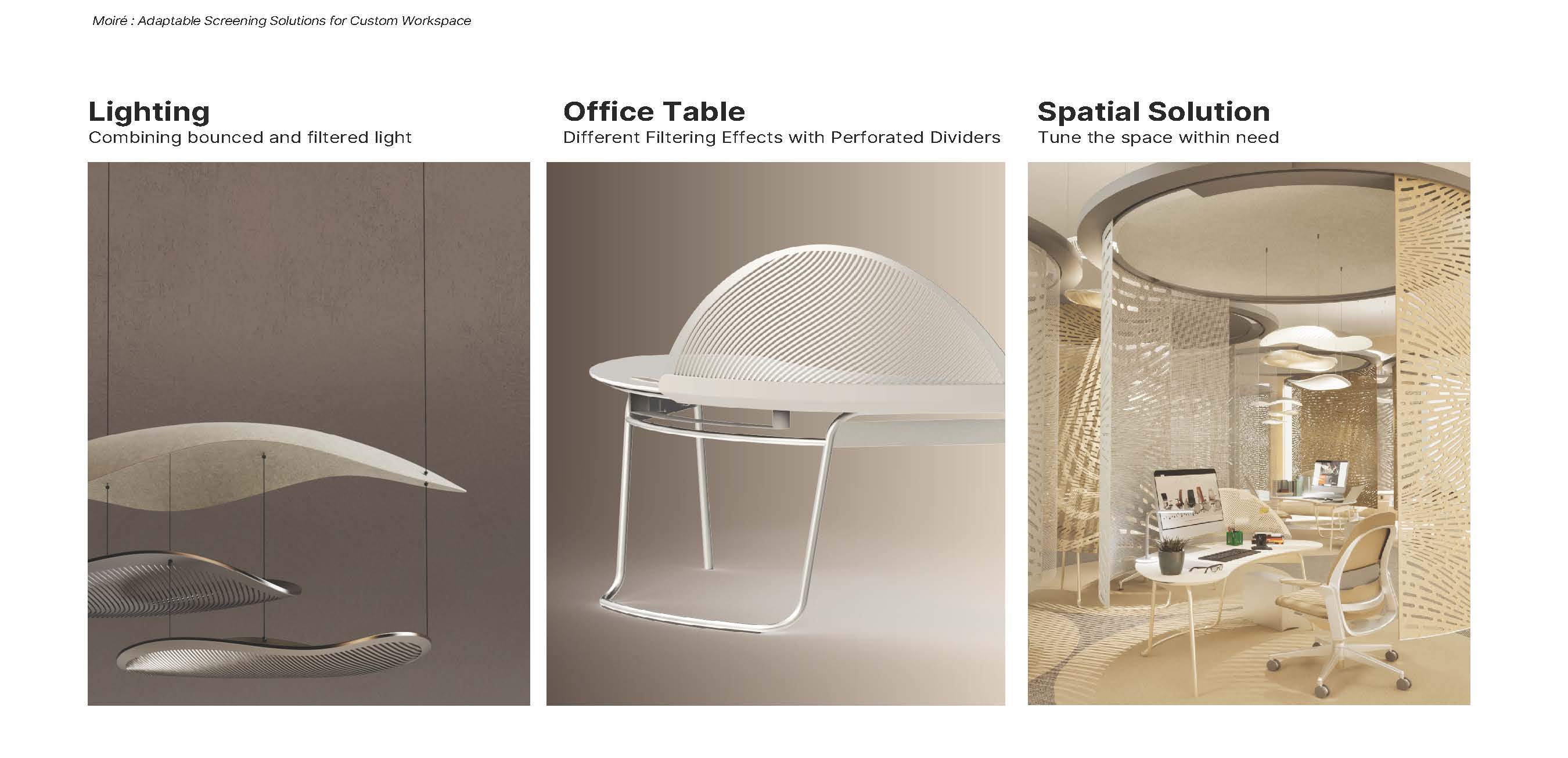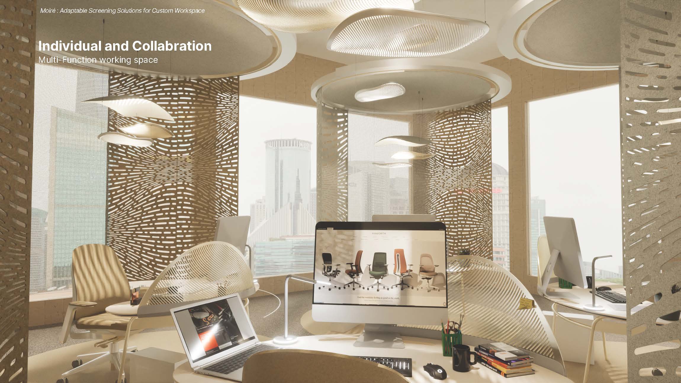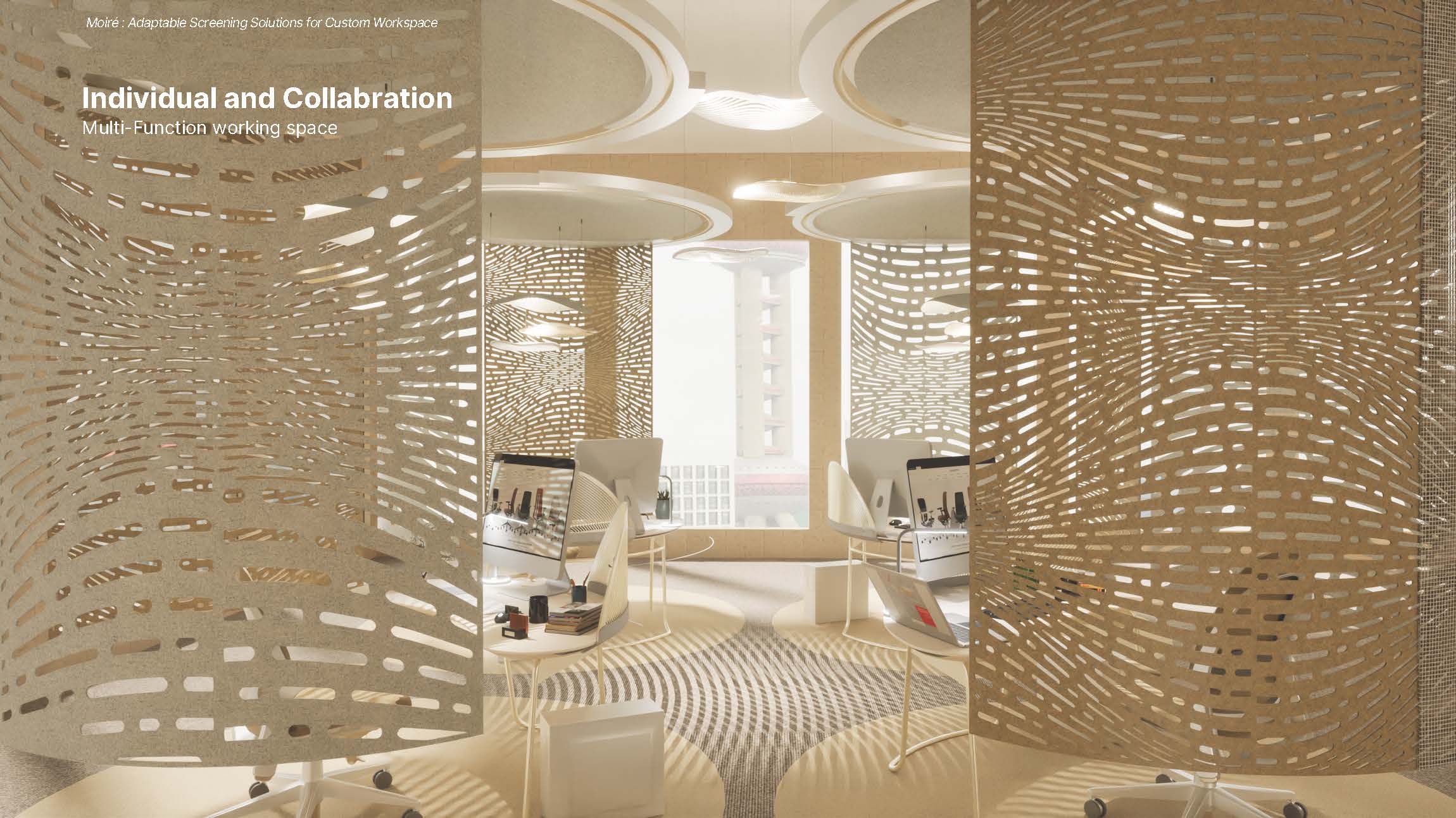 The Moiré design series empowers users to customize their workspaces. It enhances visual and acoustic separation through furniture, lighting, and spatial design by offering adjustable solutions using overlapping moire patterns for varying degrees of privacy.